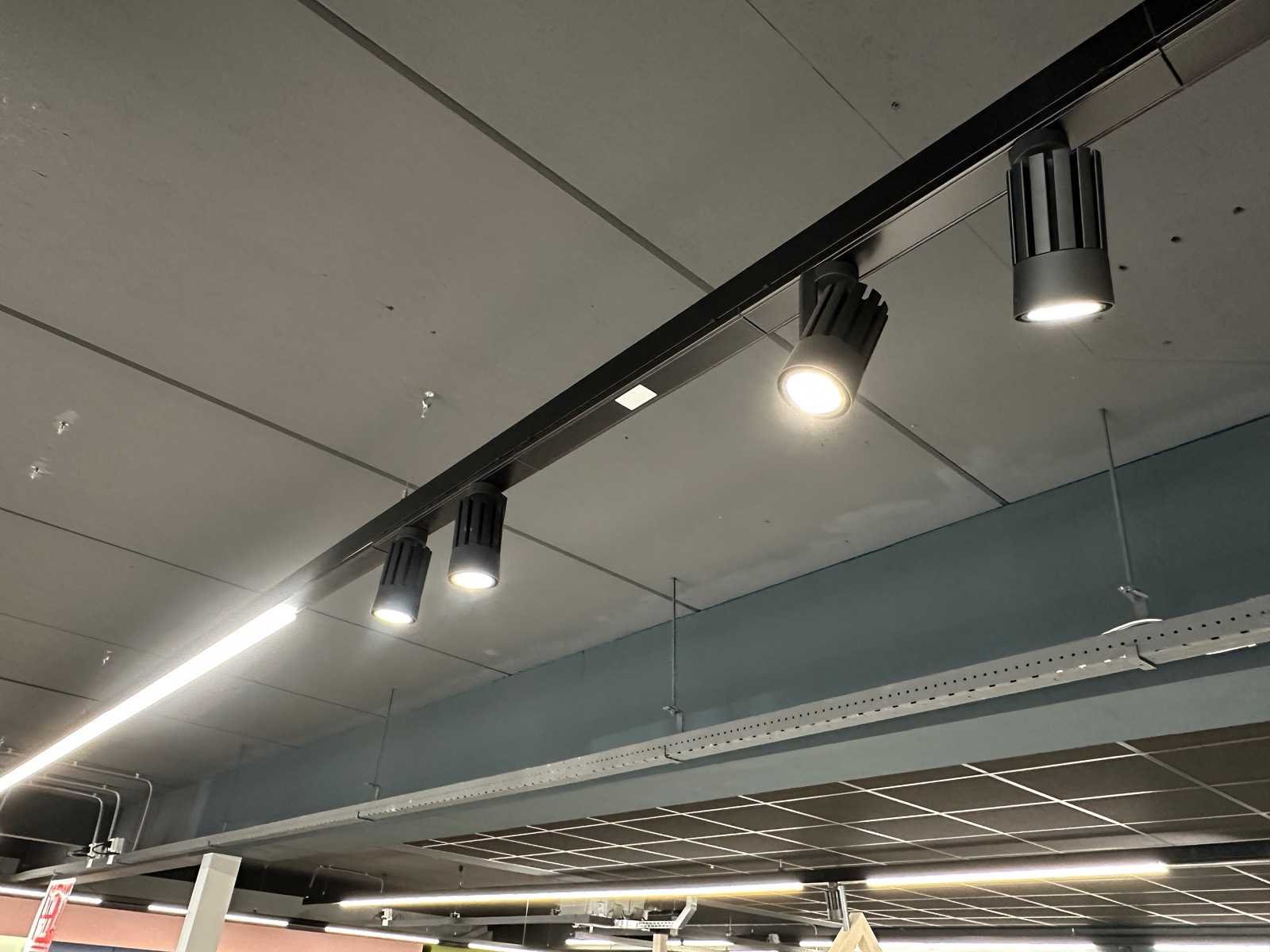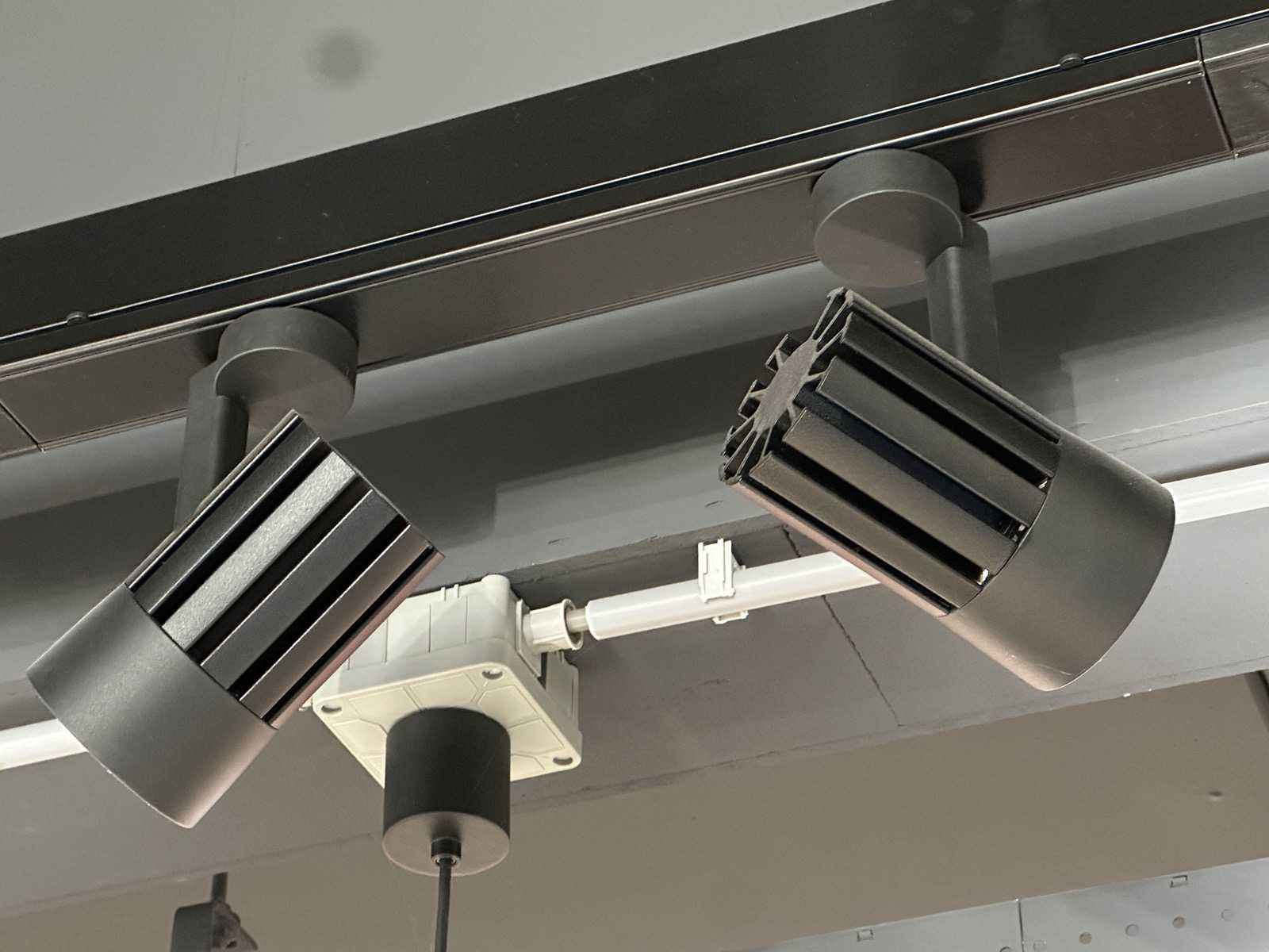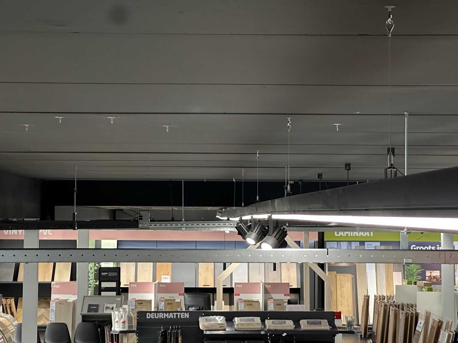 Deze partij bestaat uit rails verspreid over de gehele showroom bevestigd aan metalen kabels. In totaal circa 150 meter verdeeld over ongeveer 16 rails met 37 spots en LED armaturen. Merk: Nordeon Kleur: zwart