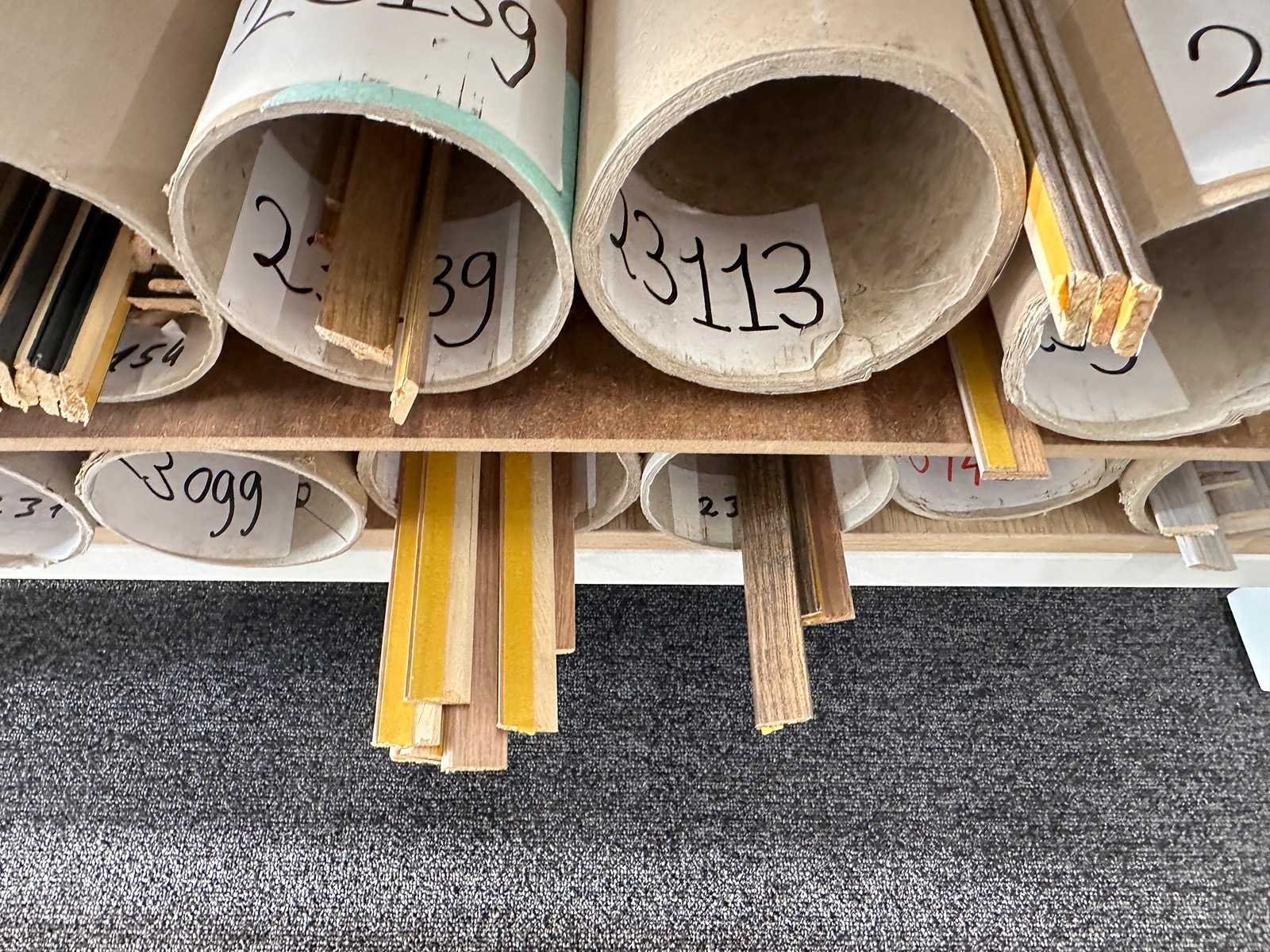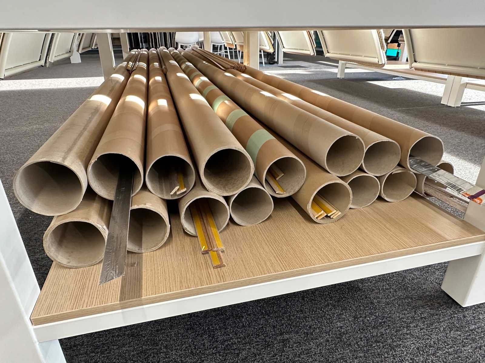 Deze partij ligt in de tafel aan beidde zijde in kokers. De partij bestaat uit verschillende afmetingen en kleuren plinten.