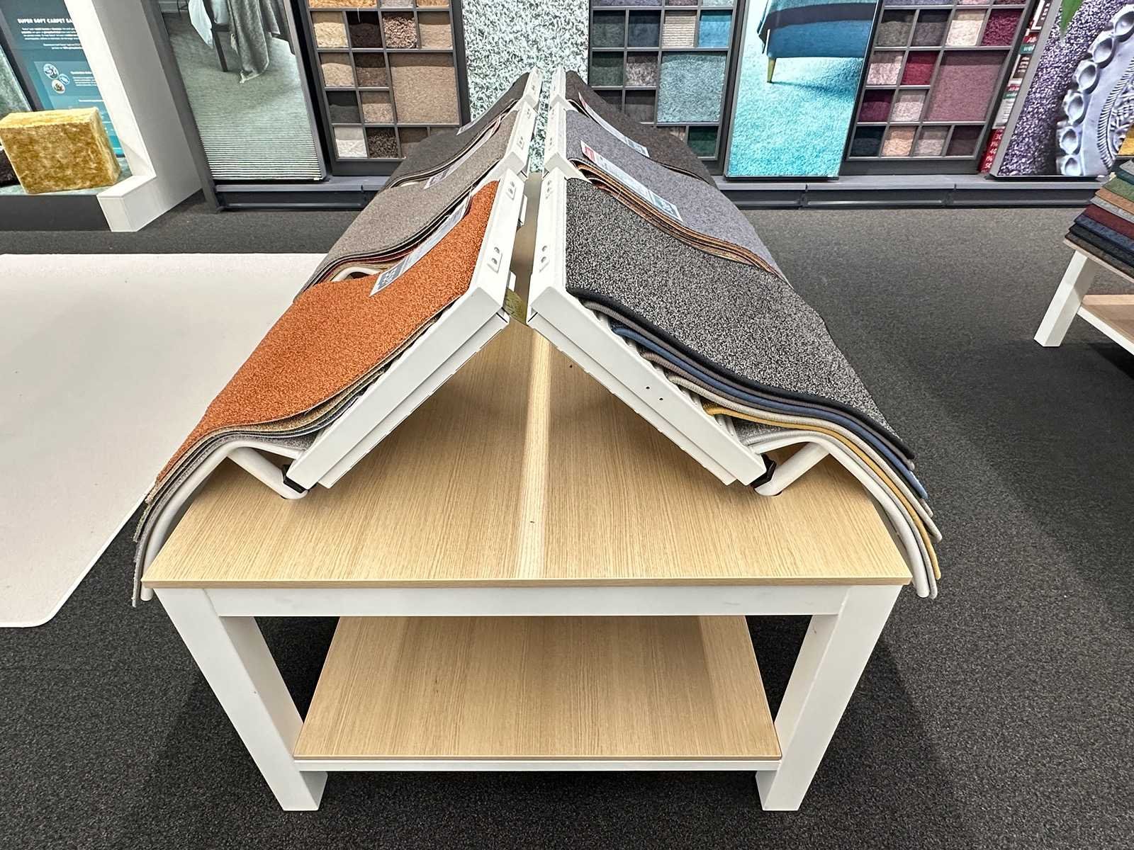 De stalen displays zijn geïntegreerd in de tafel en zijn verstelbaar. In totaal 72 displays bij dit kavel waarvan een groot deel voorzien van samples. Totale afmeting L: 2090mm Totale afmeting Breedte: 1100mm Totale afmeting Hoogte: 750mm
