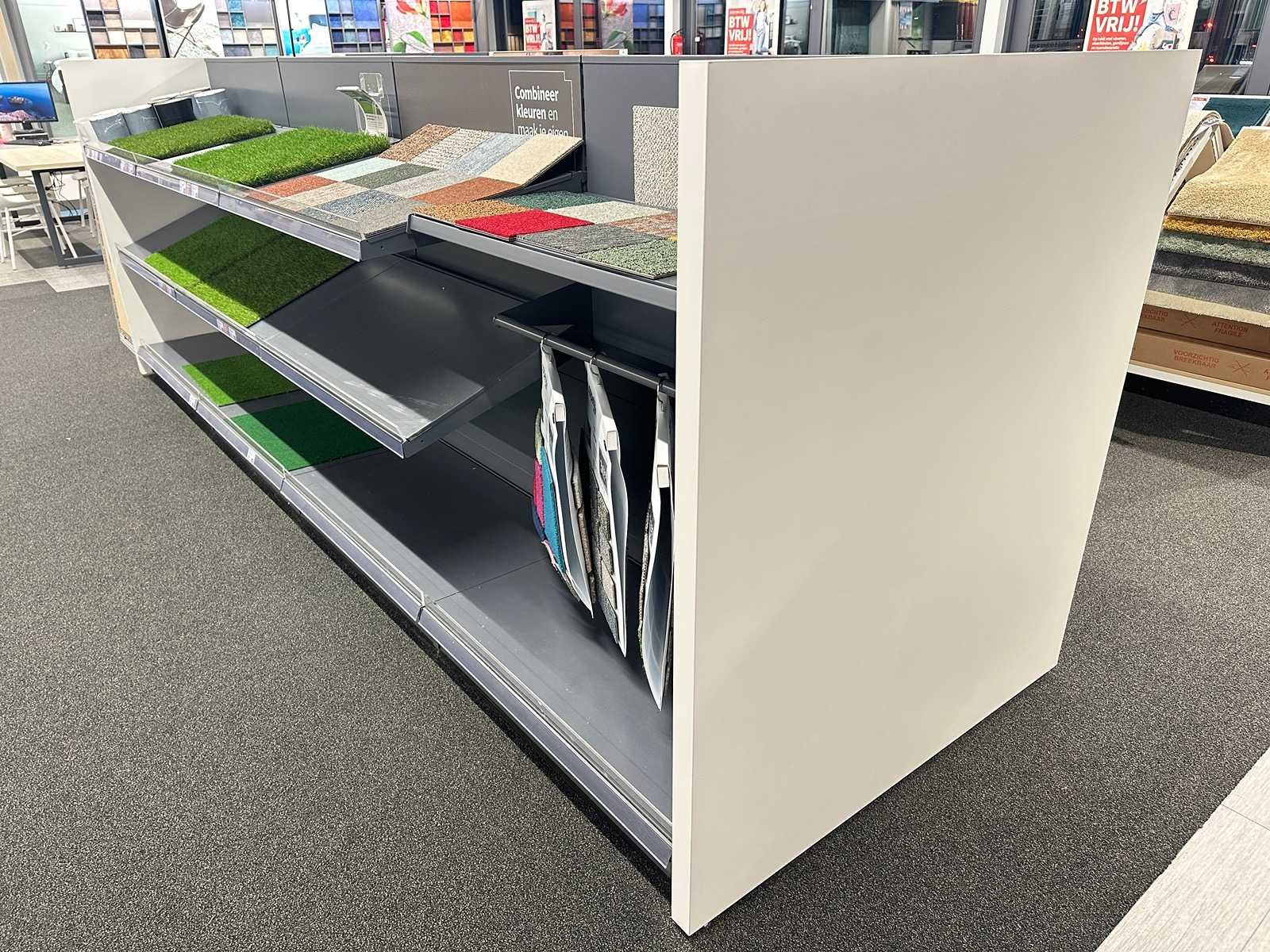 Deze stalen vrijstaande dubbelzijdige winkelstelling wordt verkocht inclusief samples. Staal: true Totale afmeting L: 4000mm Totale afmeting Breedte: 1250mm Totale afmeting Hoogte: 1440mm