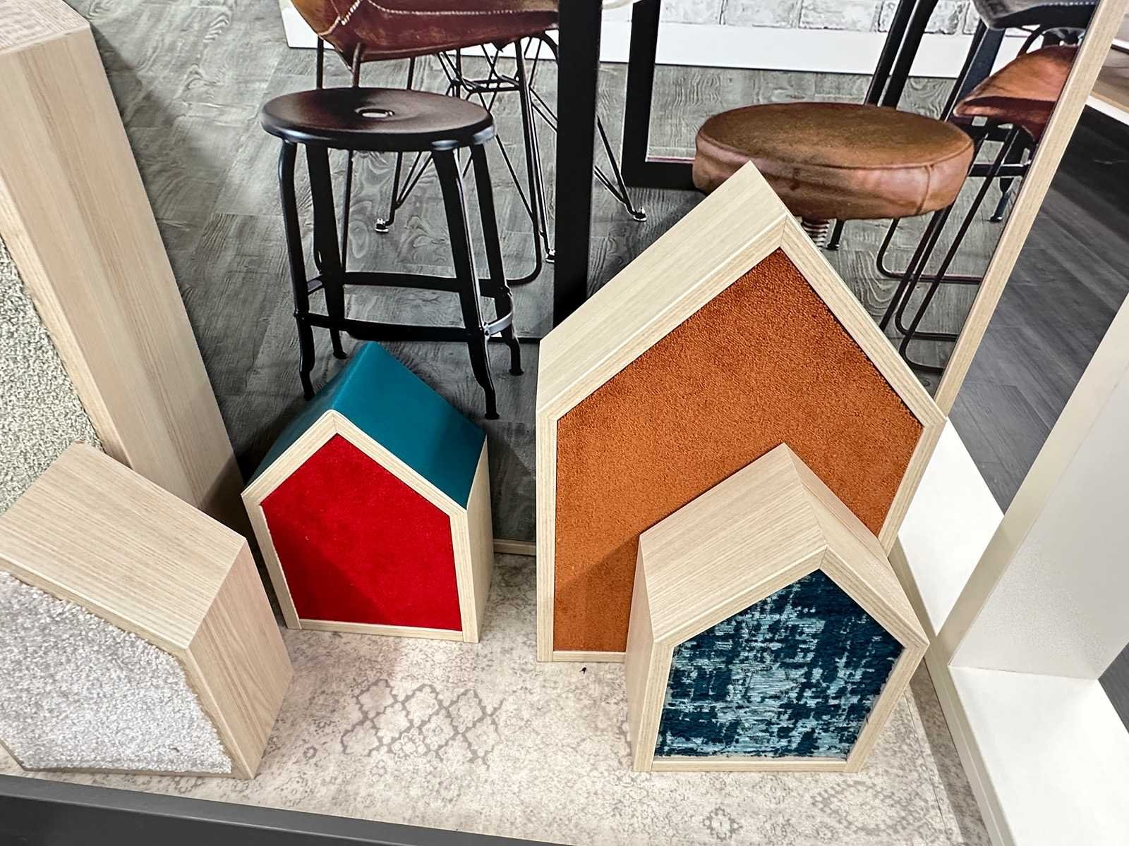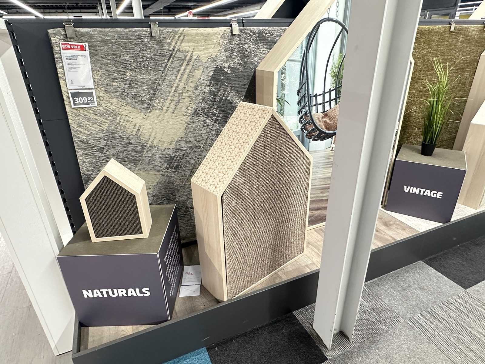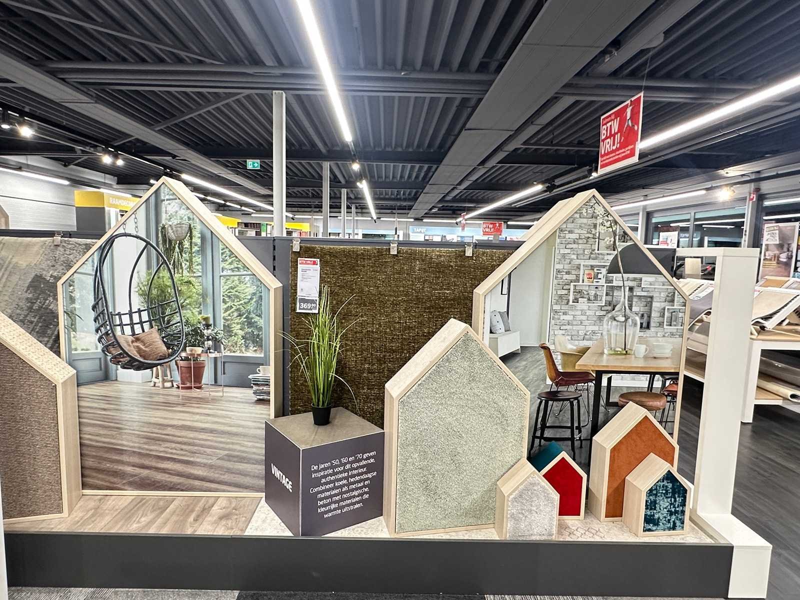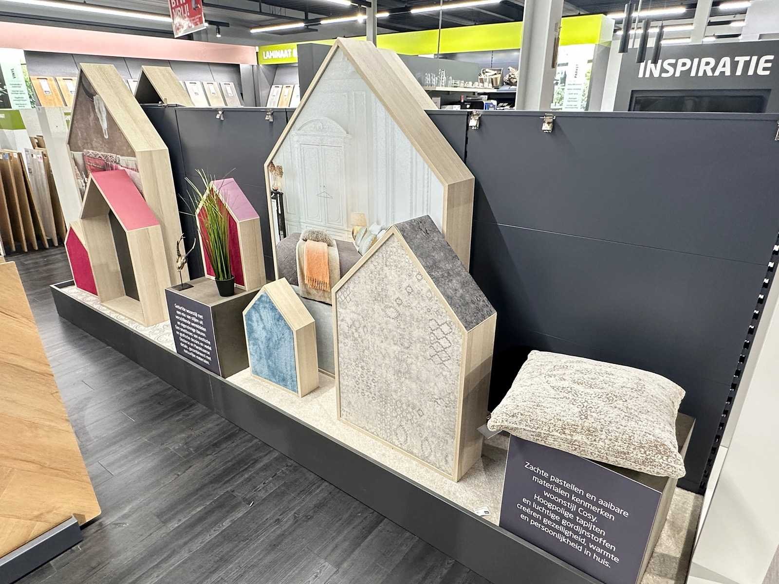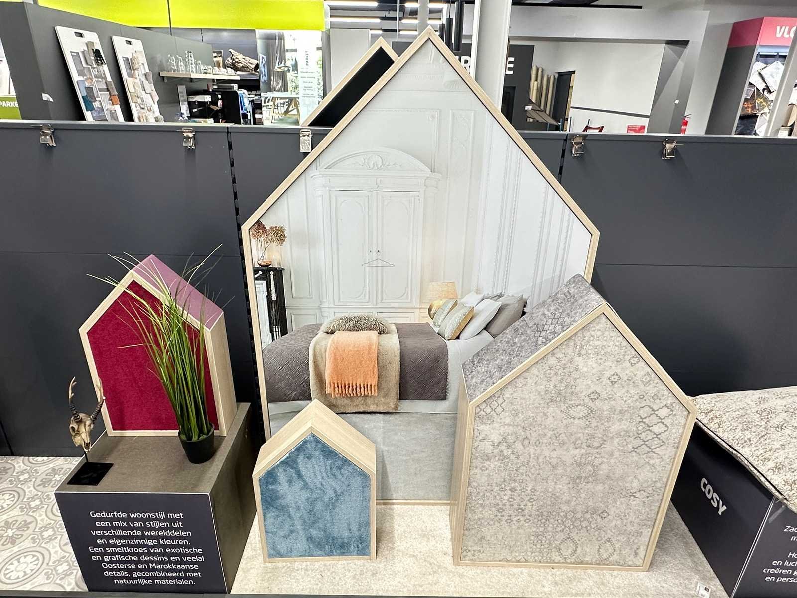De afmetingen van deze houten decoratieve huisvormen zijn verschillend. De afmeting van de kleinste is 23x12x32 cm (BxDxH) en de grootste is 98x20x150 cm (BxDxH)