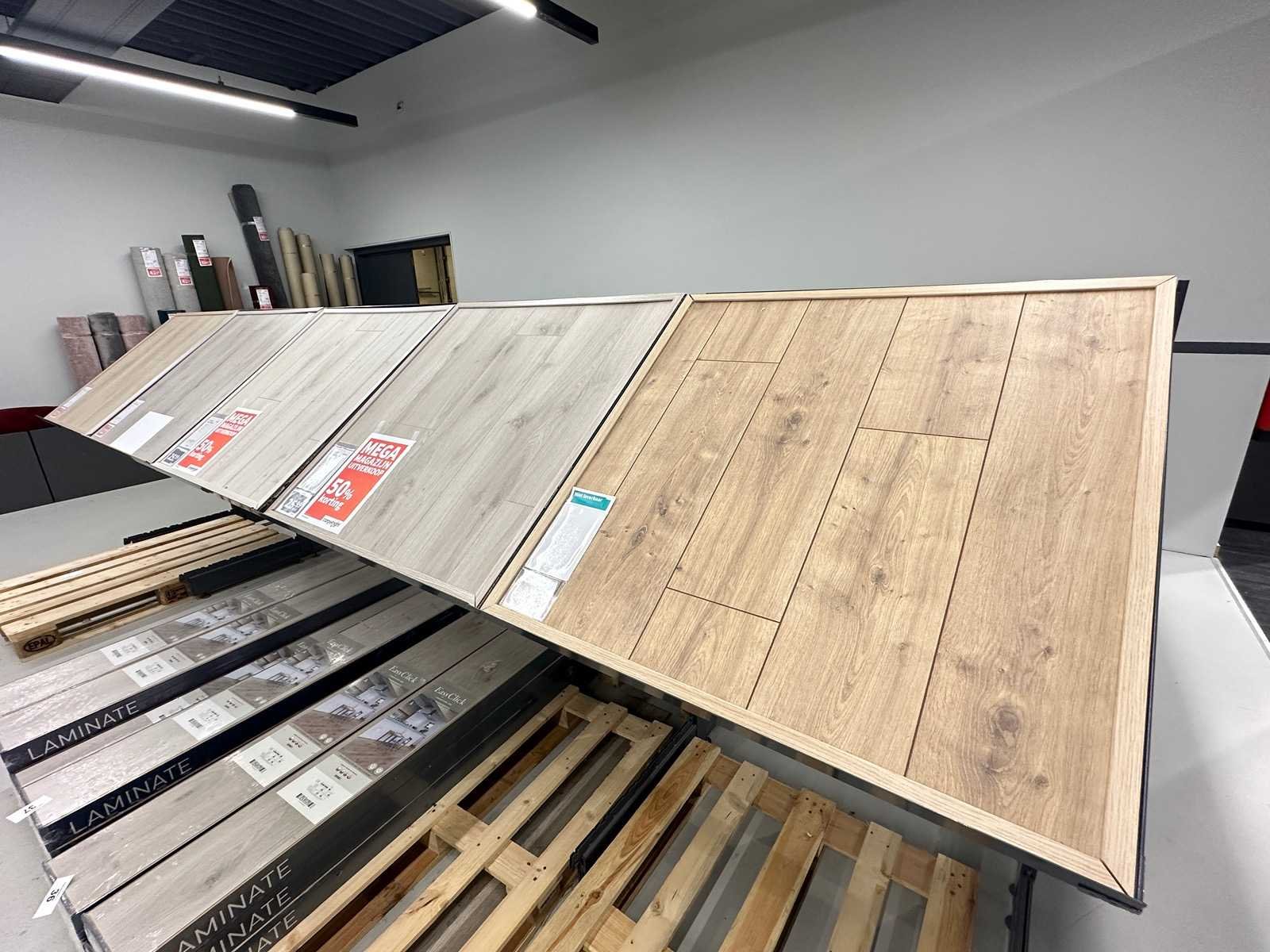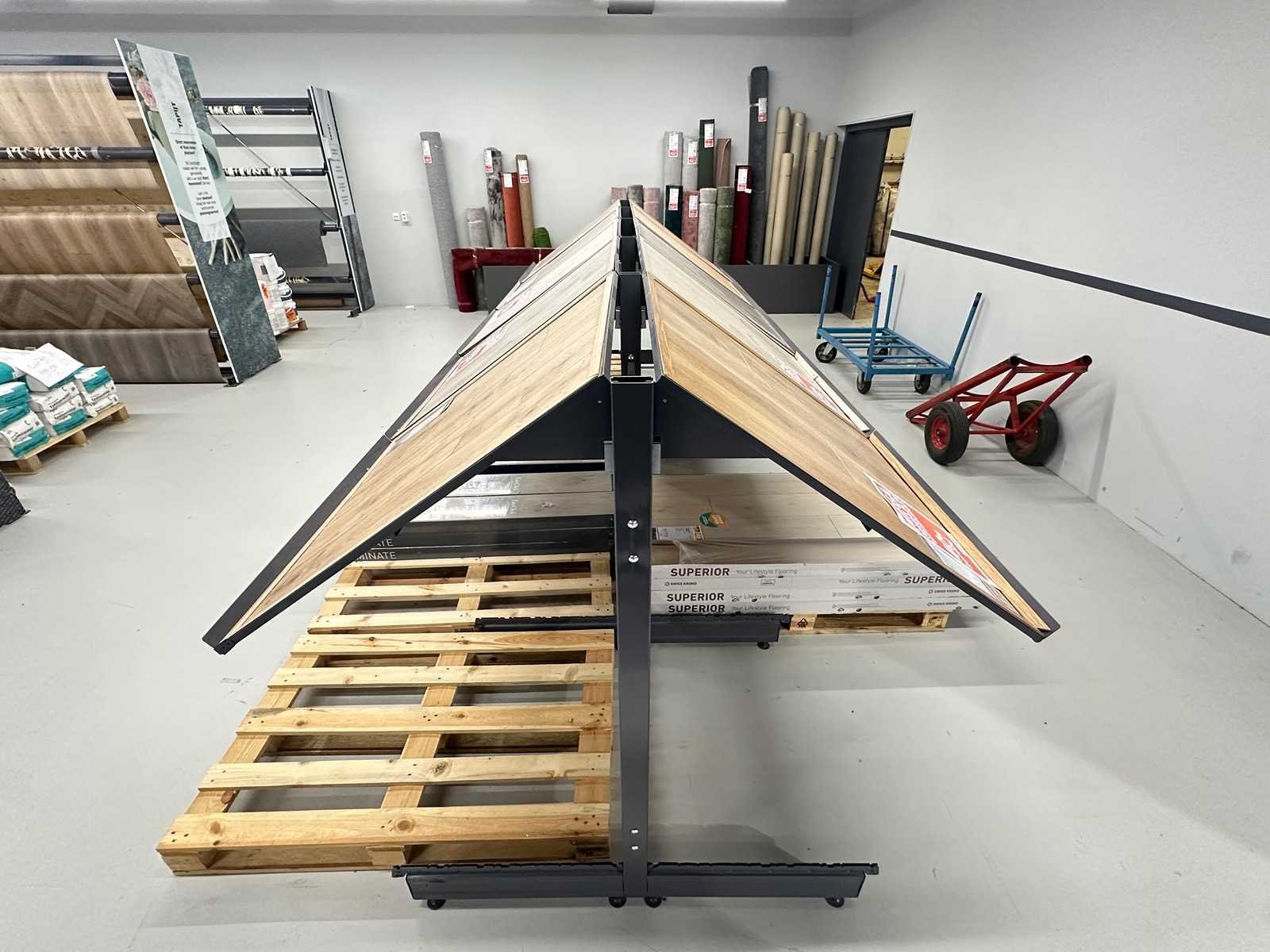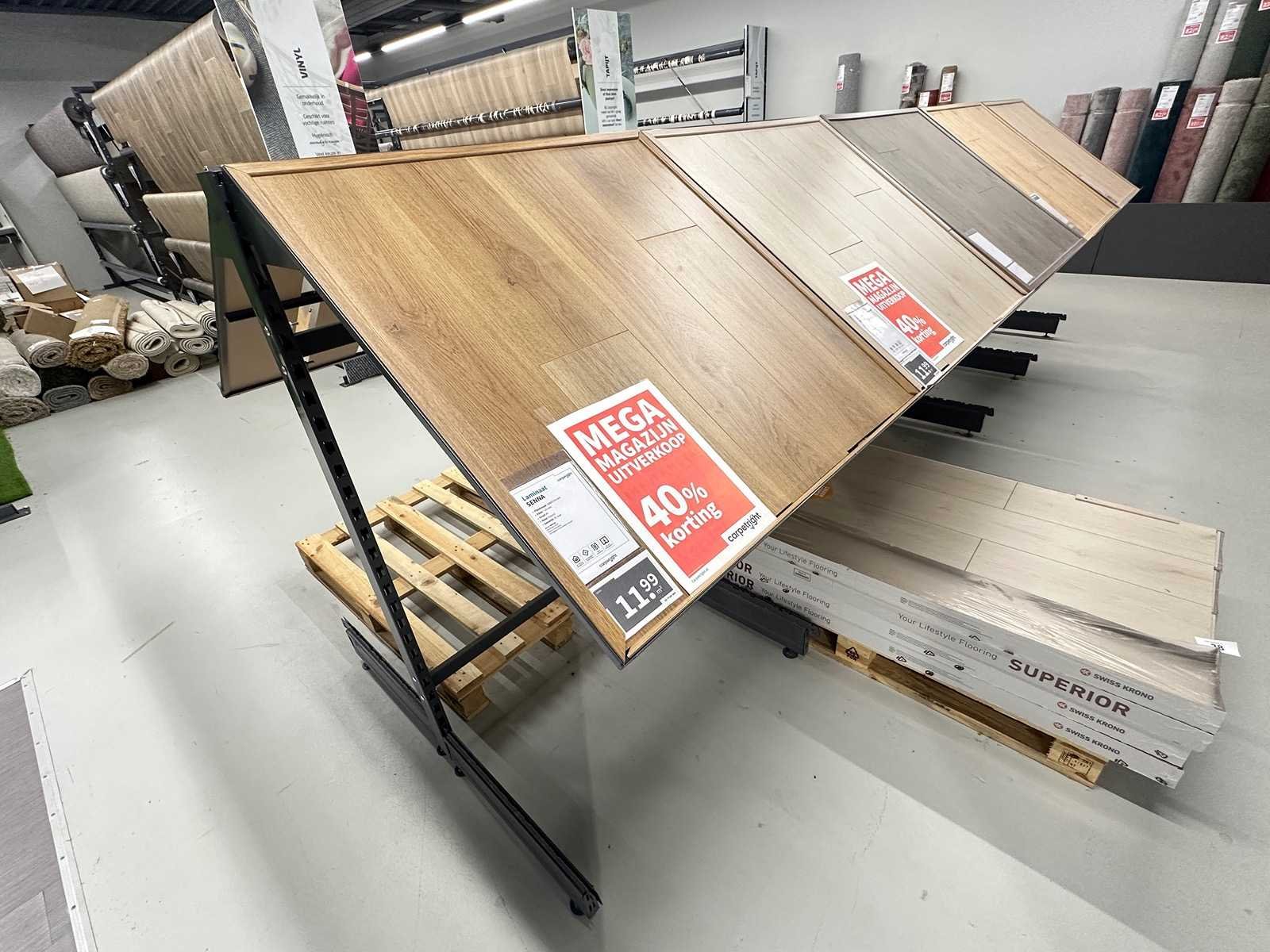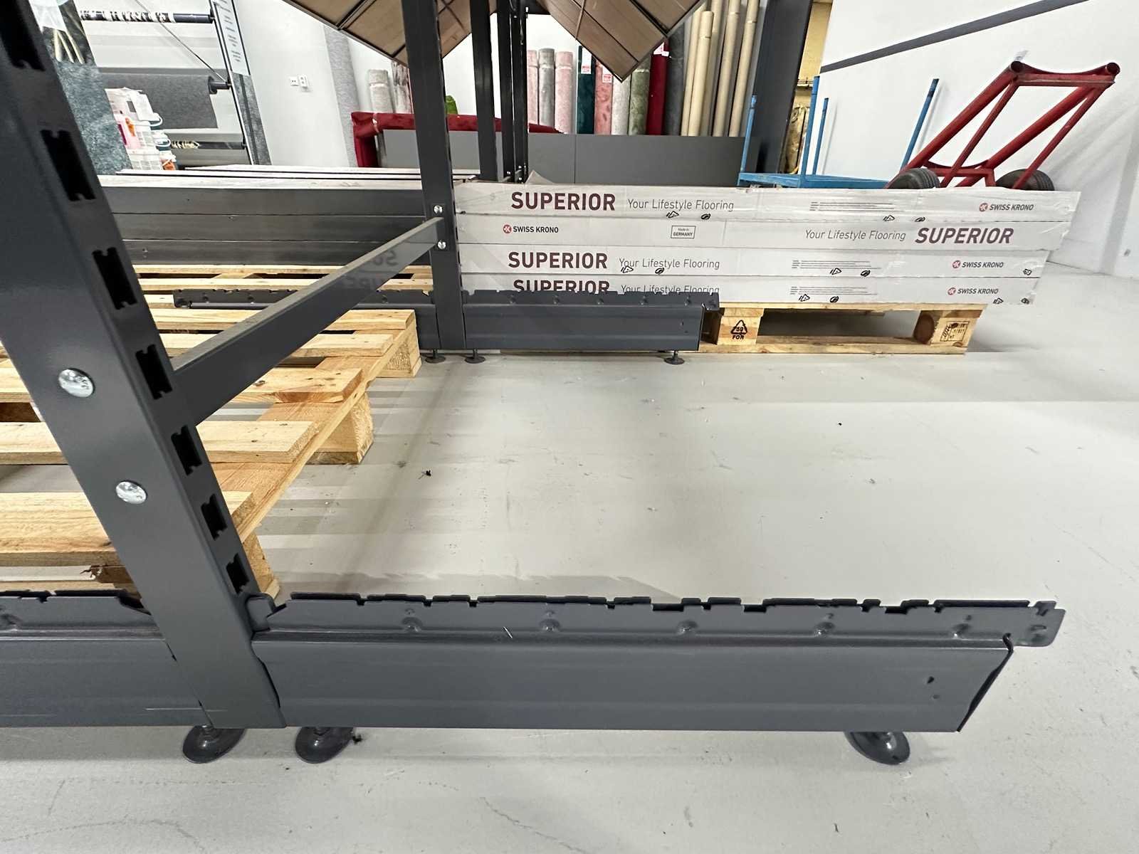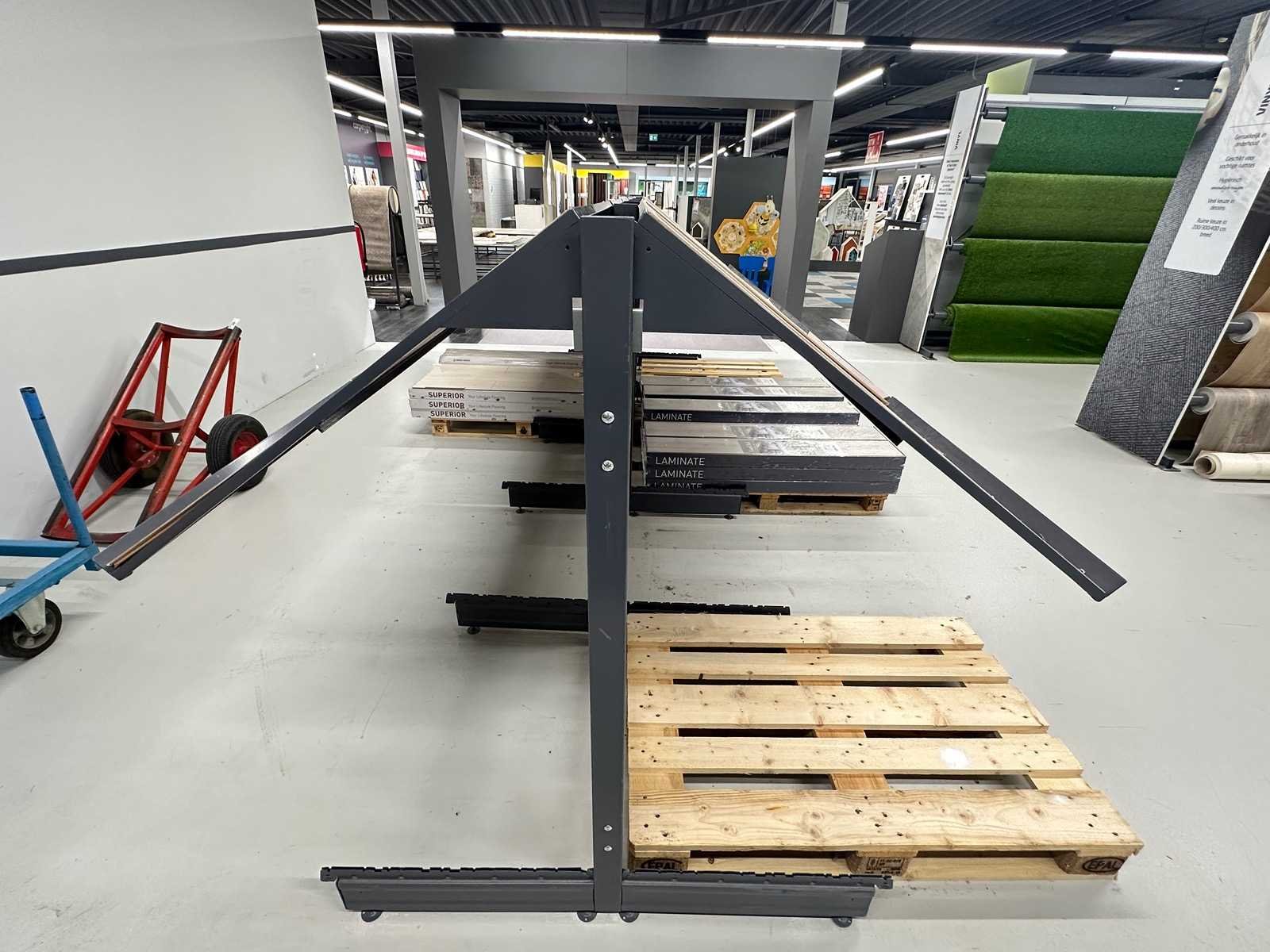 Stalen rek inclusief houten samples. Totale afmeting L: 4500mm Totale afmeting Breedte: 1600mm Totale afmeting Hoogte: 1460mm