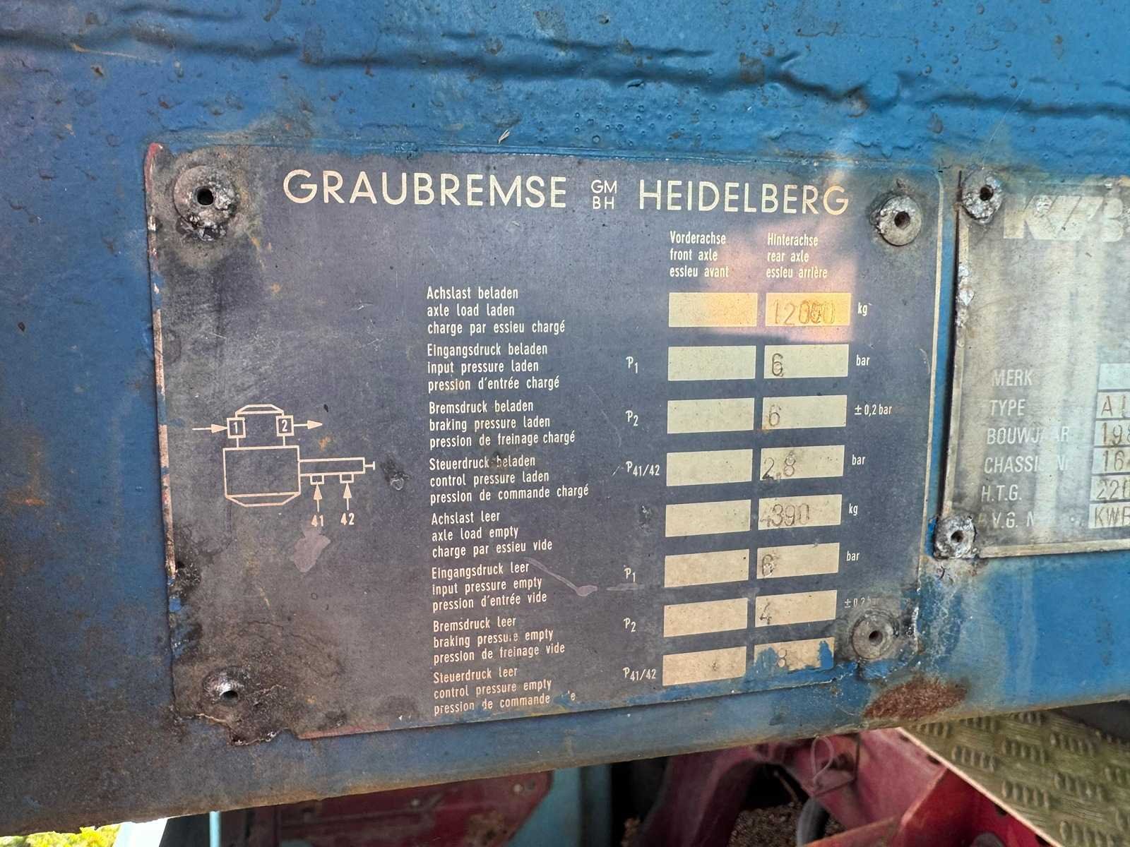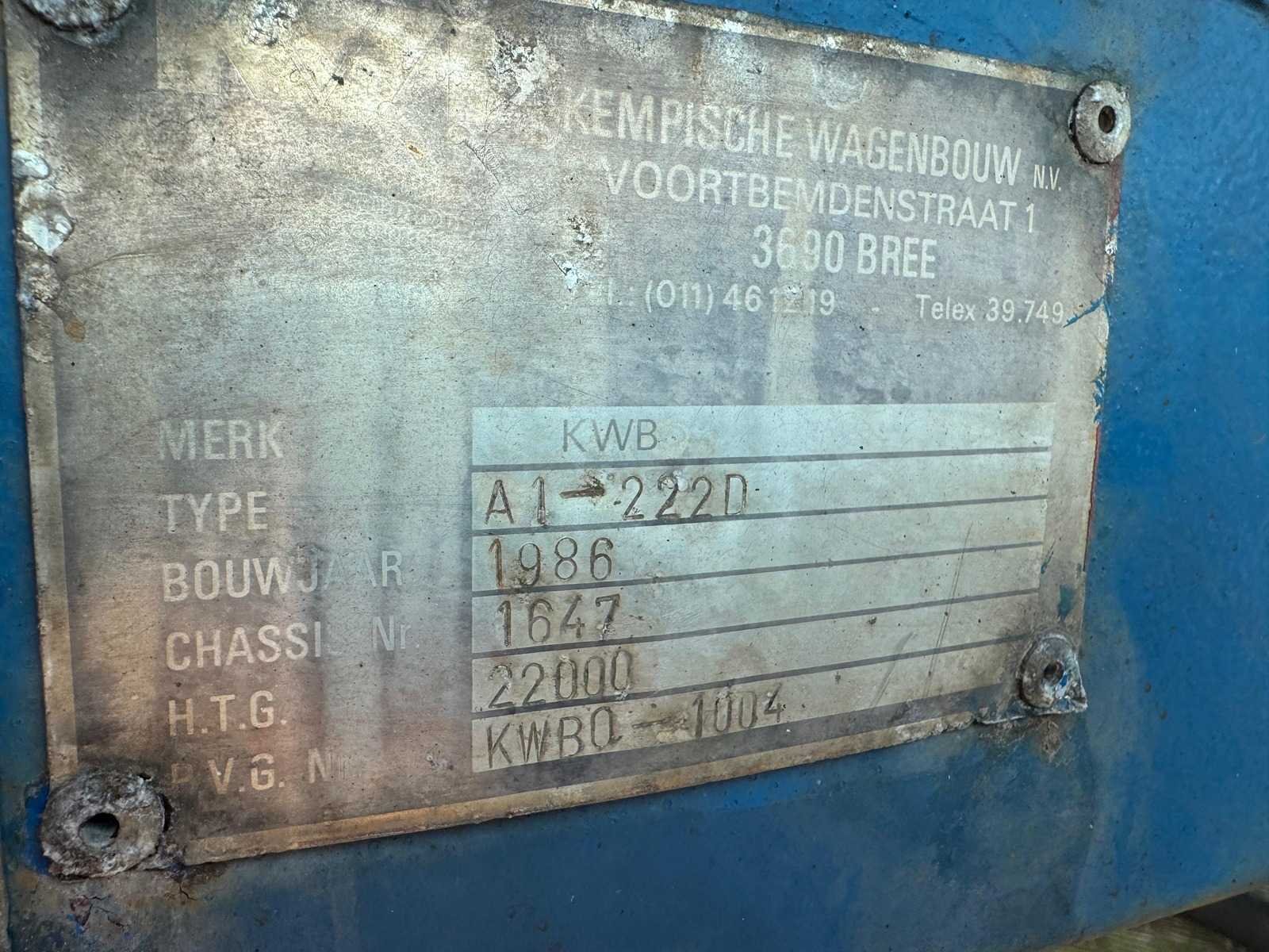 Voertuigcategorie Aanhangwagen (O4) Carrosserietype Oplegger (DA) Inrichting open wagen Merk KWB Type Niet geregistreerd Variant Niet geregistreerd Uitvoering Niet geregistreerd Handelsbenaming A1-222 D Typegoedkeuringsnummer Niet geregistreerd Lengte 1090 cm Breedte 248 cm Aantal assen 2 Aantal wielen Niet geregistreerd Wielbasis 787 cm Maximumconstructiesnelheid 100 km/h Afstand hart koppeling tot achterzijde voertuig 963 cm Laadvermogen 16552 kg Merk: KWB Type: A1-222 D Dieplader Kenteken: OG-36-96 Laadvermogen: 16552kg Aantal assen: 2 Datum eerste toelating: 1986-07-31 Datum eerste toelating (NL): 1986-07-31 APK vervaldatum: 2026-01-20 Lengte: 10900 Breedte: 2480