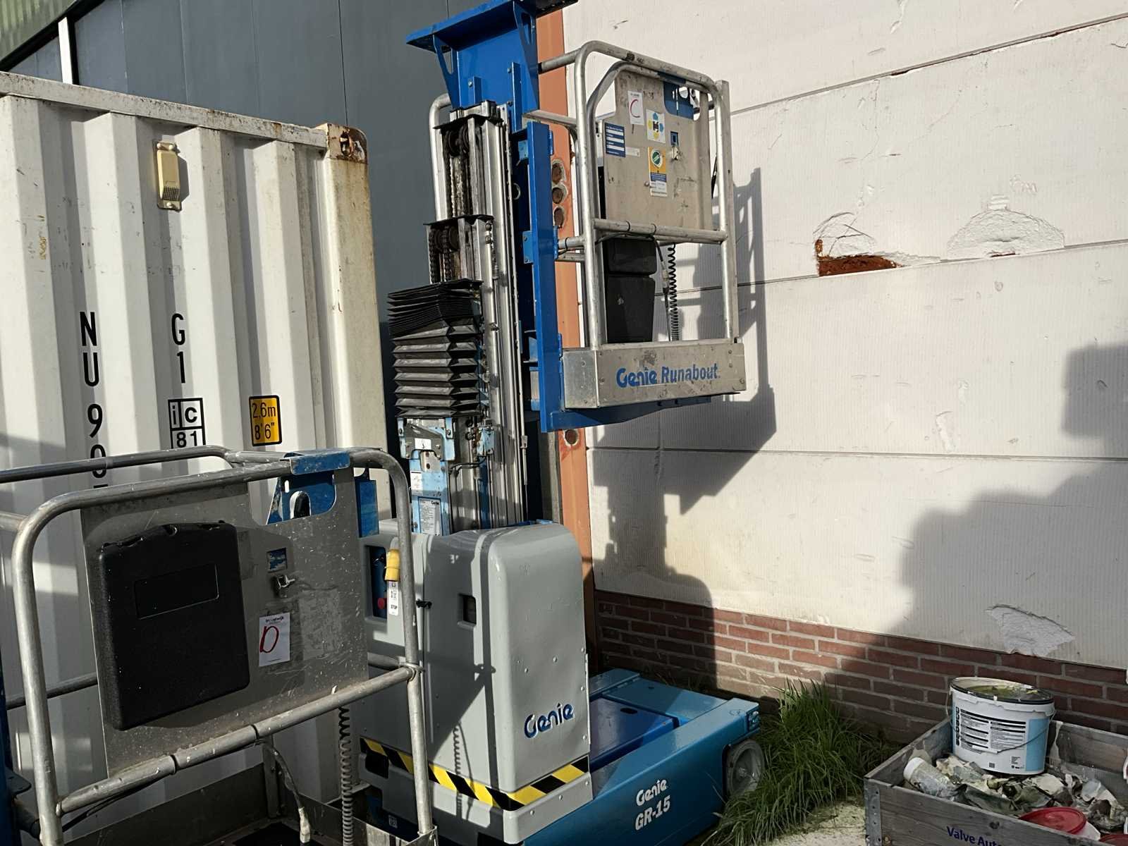 Werkhoogte 6,52 m Platformcapaciteit 227 kg Gewicht (+/-) 994 kg Aandrijving Elektro Vloerhoogte 4,52 m Draaicirkel 0 / 1,42 m Lengte 1,35 m Breedte 0,75 m Hoogte 1,57 m Platformlengte 0,89 m Platformbreedte 0,75 m Platformlengte (uitgeschoven) 1,40 m Batterij vermogen 24/225 V/Ah Non-marking banden Ja; Handleiding aanwezig Merk: Genie Type: GR-15 Bouwjaar: 2007 Elektrisch: true Masthoogwerker: true Werkhoogte: 6520mm Horizontale rijkwijdte: 1400mm Plateau afm. l: 890mm Plateau afm. b: 750mm Platform capaciteit: 227kg Accu lader: true Afgelezen urenstand: 454 Eigen gewicht: 994kg Totale afmeting L: 1350mm Totale afmeting Breedte: 750mm Totale afmeting Hoogte: 1680mm