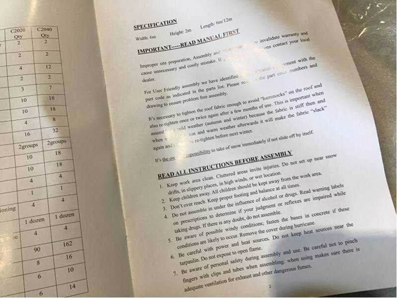 V.v. pvc zeildoek 610 gr; kleur wit; enkele truss; gegalvaniseerd stalen frame bogen 45 * 1,5 mm Gording 32 * 1,2 mm; ruimte tussen bogen 1.5 mtr; geleverd in kist 750x1920x340 mm; handleiding aanwezig; zie voor meer info downloads © ongebruikt Merk: Easy-Going Type: (6x6x2 meter) Bouwjaar: 2025 Eigen gewicht: 263kg Totale afmeting L: 6000mm Totale afmeting Breedte: 6000mm Totale afmeting Hoogte: 2000mm GS Code: 6306220010