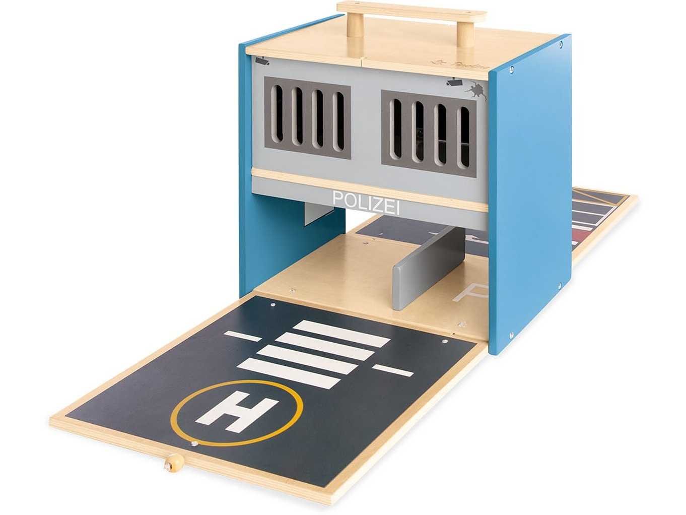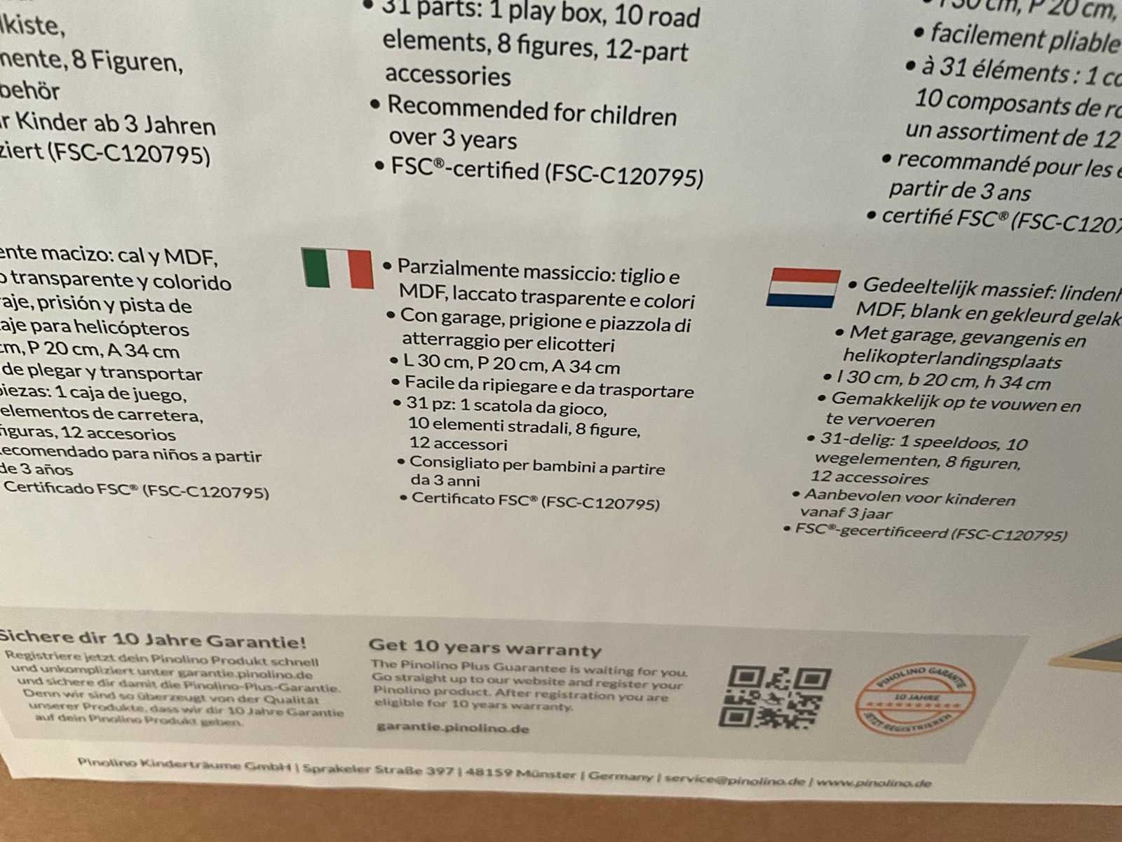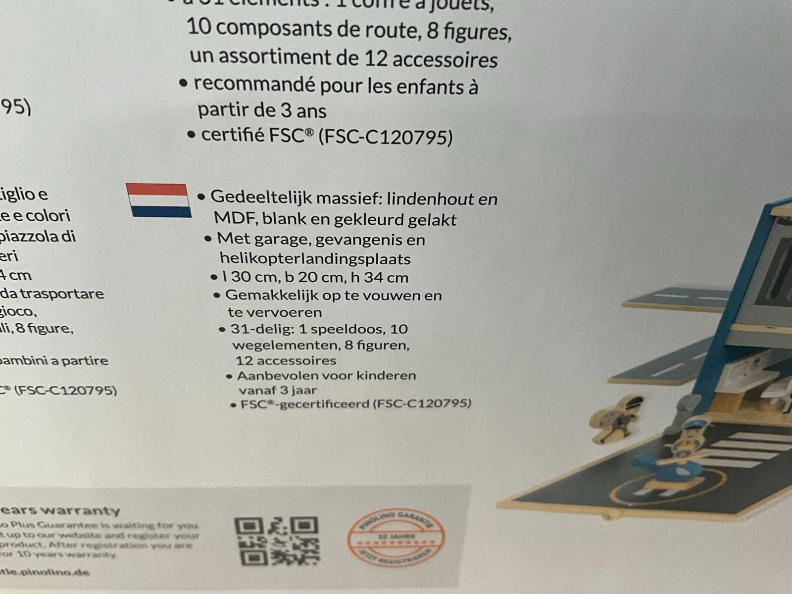 Kleine politieagenten kunnen hier volop genieten van het speelplezier: de praktische speelgoedkist, die openklapt tot een politiebureau, zit boordevol accessoires en veel blauw licht. De vele verschillende bouwmogelijkheden inspireren tot fantasierijke rollenspellen en staan garant voor spannende middagen met spannende achtervolgingen en lastige strafzaken. Kenmerken Afmetingen (B x H x D): 30 x 34 x 20 cm Materiaal: Lindehout, MDF, heldere en kleurrijke lak speciale kenmerken 2-zijdige scharnierende speelgoedkist met 30 stuks. Accessoires Comfortabele handgreep voor eenvoudig transport FSC-gecertificeerd (FSC-C120795)* Hoge speelwaarde door verschillende constructiemogelijkheden scharnierende gevangenisdeur bestuurbare auto's helikopterplatform Geen montage vereist Geschikt voor kinderen vanaf ca. 3 jaar 10 jaar fabrieksgarantie** leveringsomvang Pinolino Politiebureau Gordon Speelset De speelset bevat: Speeldoos die openklapt en een politiebureau vormt, 10x straatelementen, 8x figuren en 12-delige accessoires Verpakt in kartonnen doos 320x230x370 mm Merk: Pinolino Model: Houten politie bureau Product type: Gordon Materiaal: Mdf