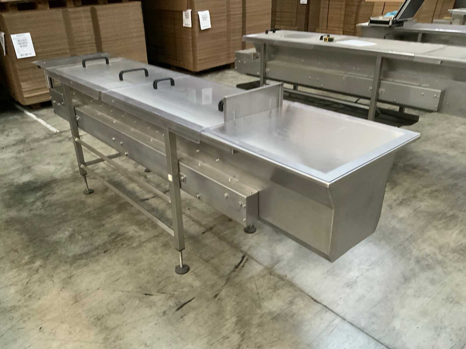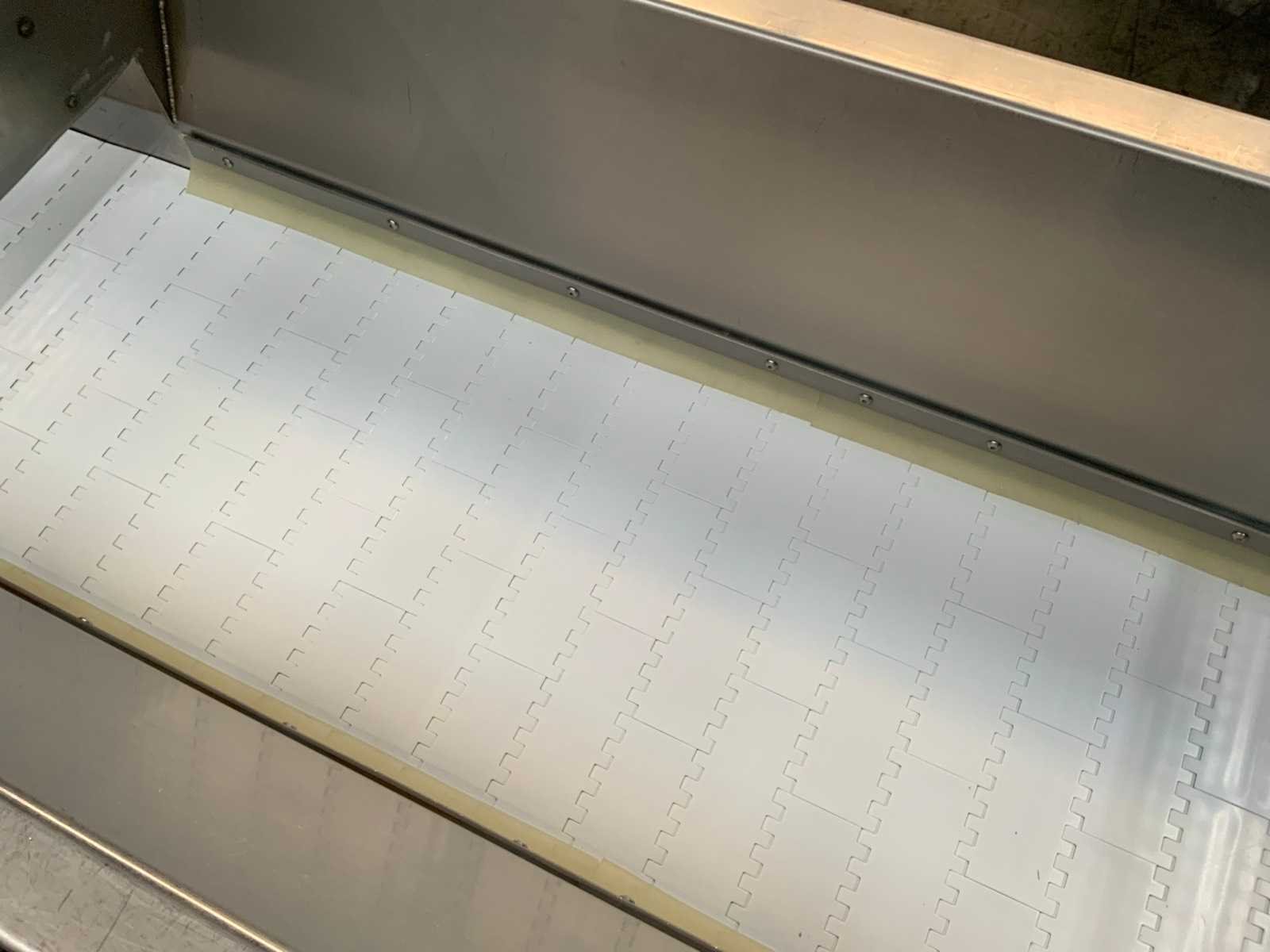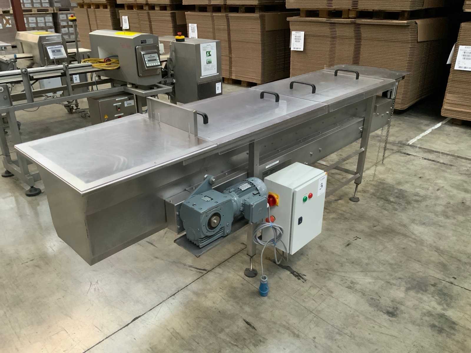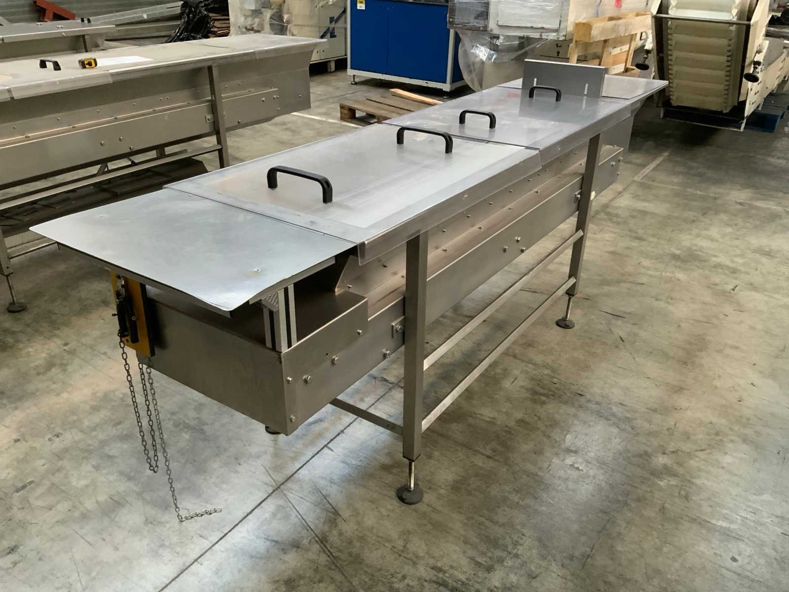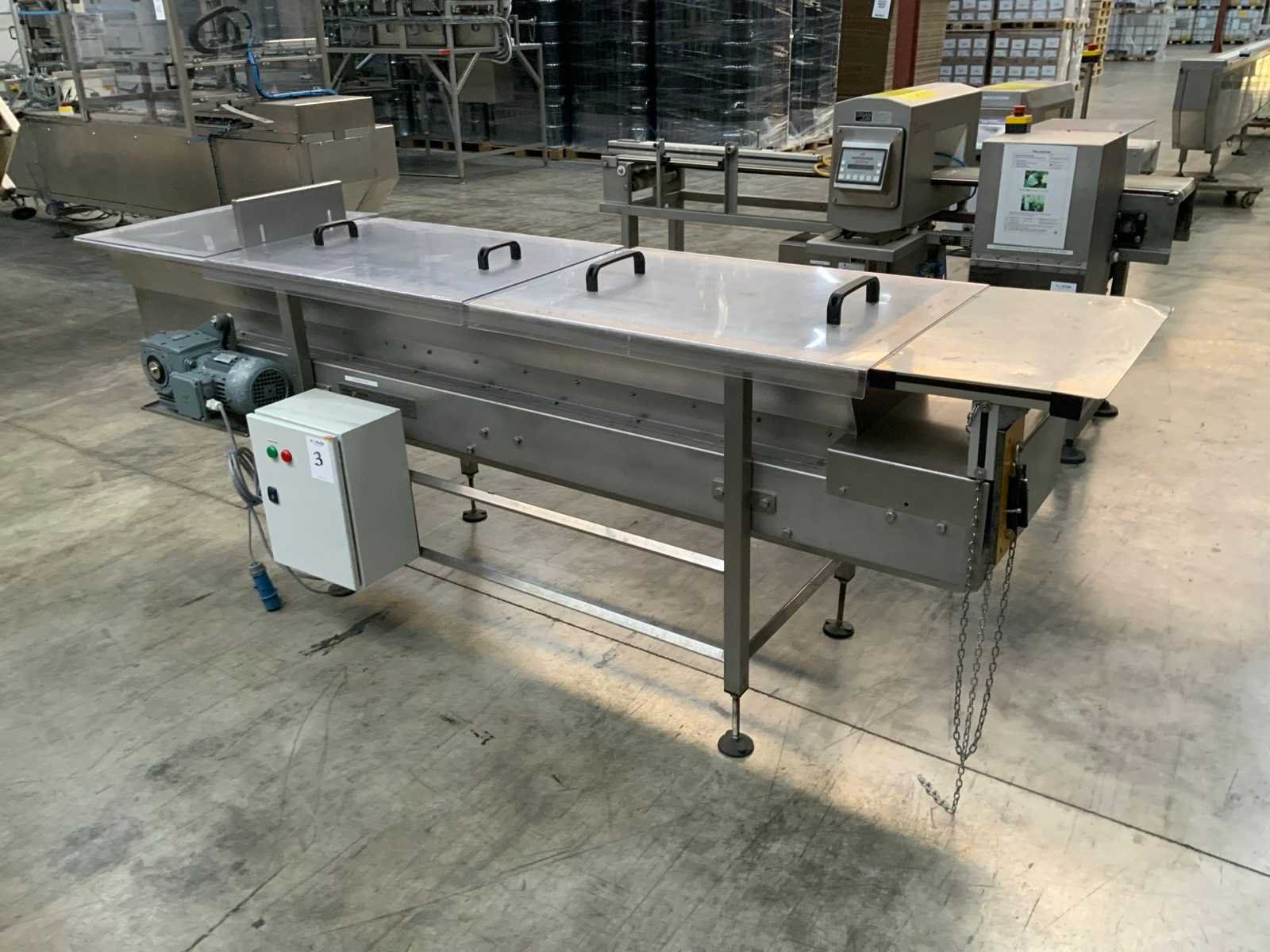 Voorzien van kunststof schakelband, perspex kappen en stelpoten Merk: Hinderink Lalobuba Type: B-0200 Bouwjaar: 2008 Serienummer: 44768 Band afm. l: 1900mm Band afm. b: 350mm Vermogen: 0.55kW Eigen gewicht: 200kg Totale afmeting L: 2800mm Totale afmeting Breedte: 800mm Totale afmeting Hoogte: 1040mm