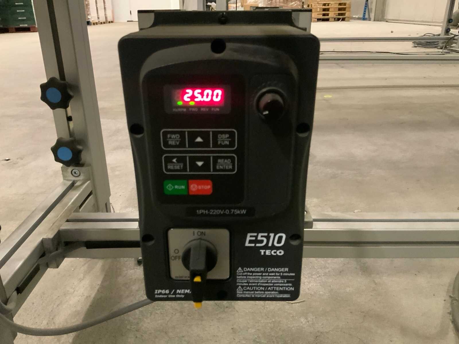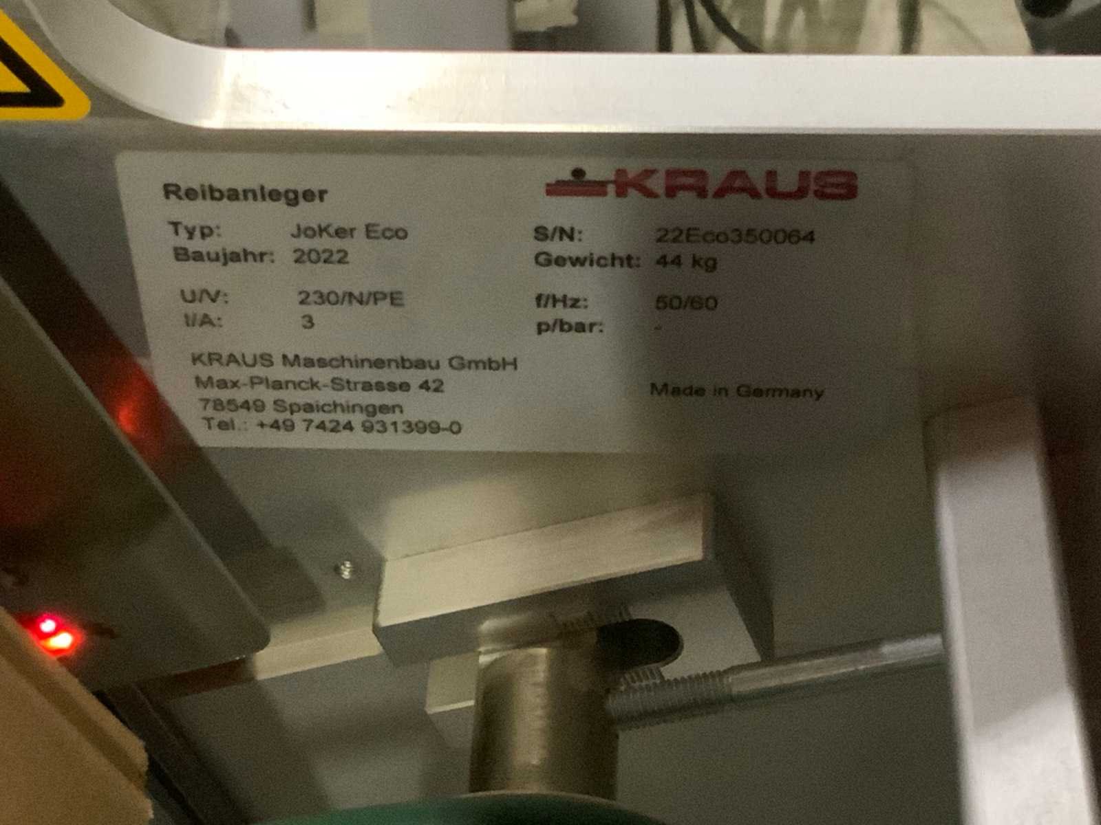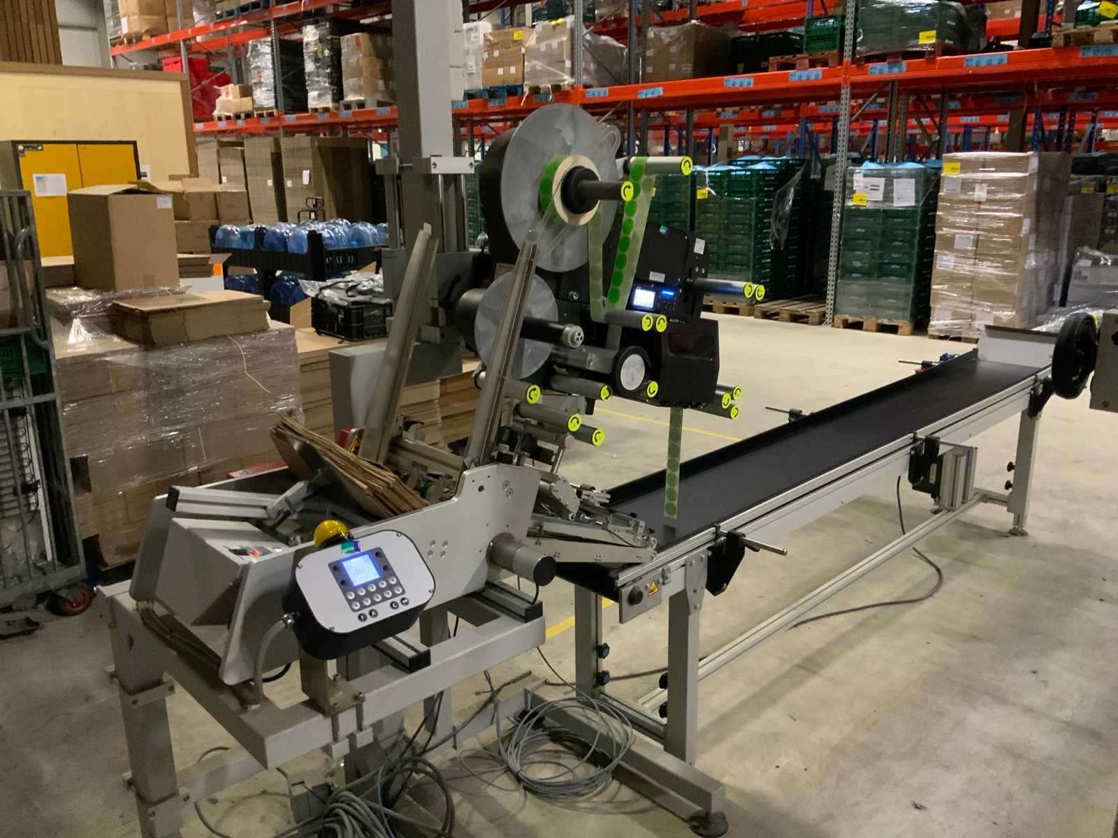 Voorzien van 1 Kraus Joker feeder, min. formaat: 100 x 30 / max. 350 x 320 mm, 1 Sato S84 EX thermische printer, en BCK HOLLAND afvoertransportband, type: N60, afmeting band: L3050 x B400 mm, met Teco E510 frequentie regelaar, verstelbare kantgeleiders, noodstop beveiliging, motor vermogen: 0,37 KW Merk: ARCA Labeling & Marking Type: Evolution 160 Bouwjaar: 2022 Serienummer: 07-6602-E160 Max. rolbreedte: 160mm Digitale uitlezing: true Aansluiting: 230V Totale afmeting L: 4200mm Totale afmeting Breedte: 1100mm Totale afmeting Hoogte: 2100mm