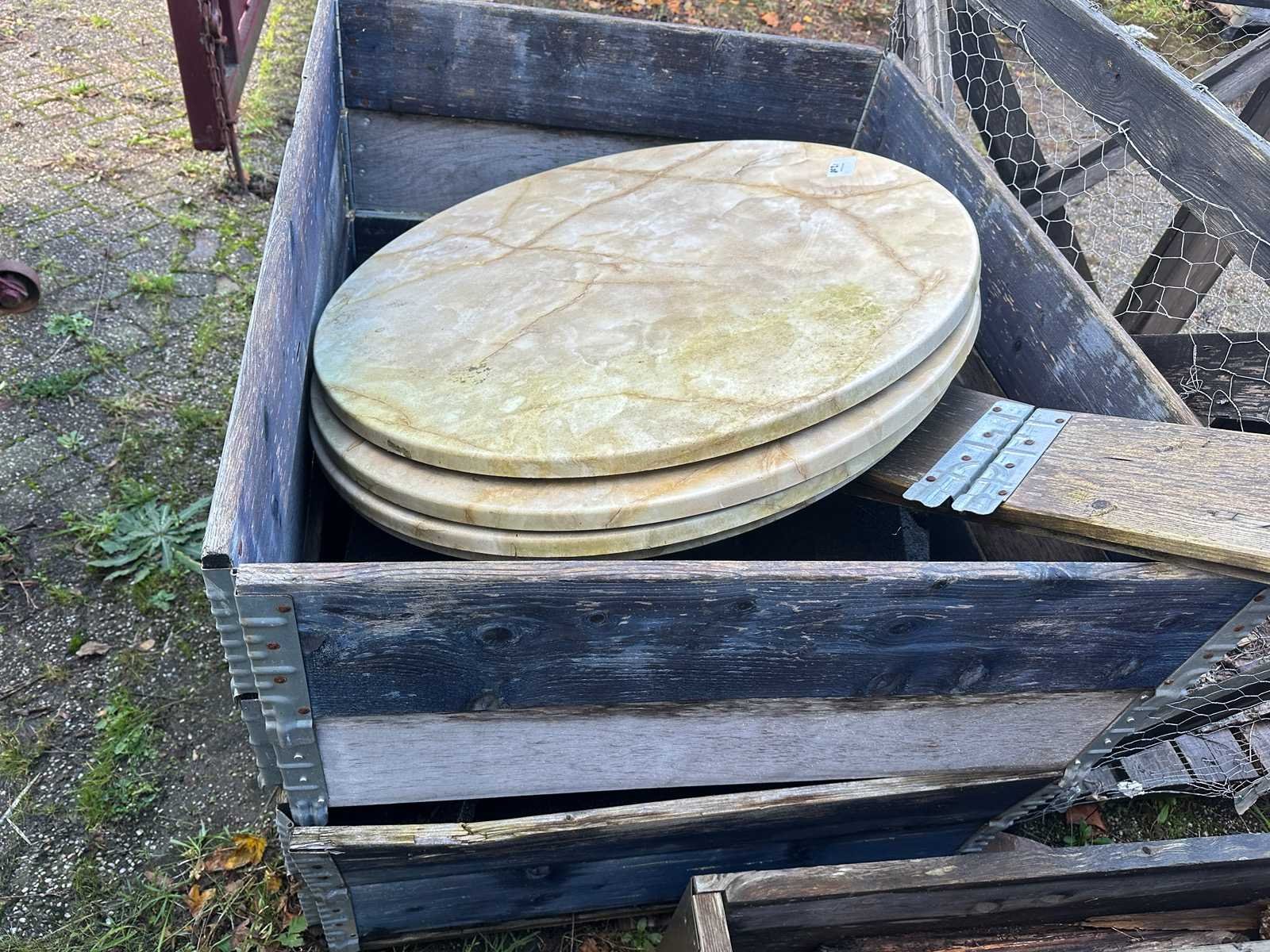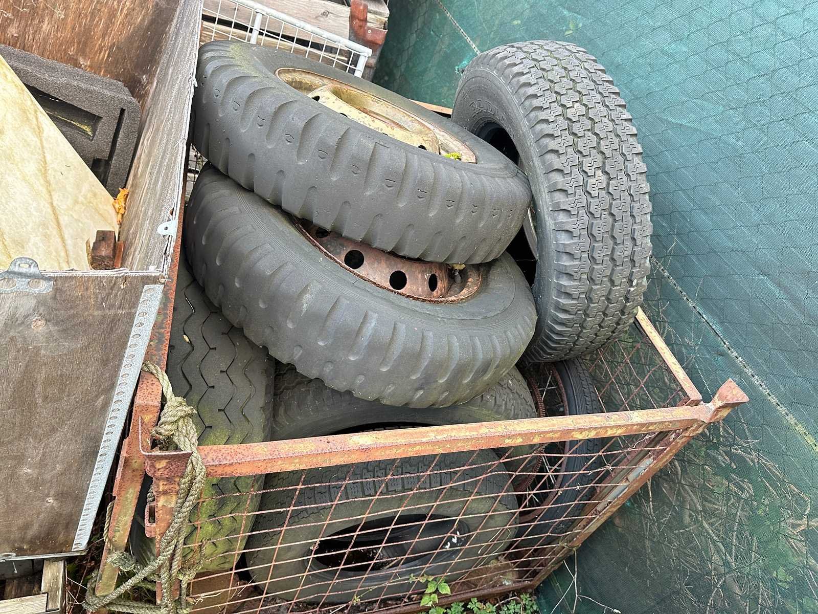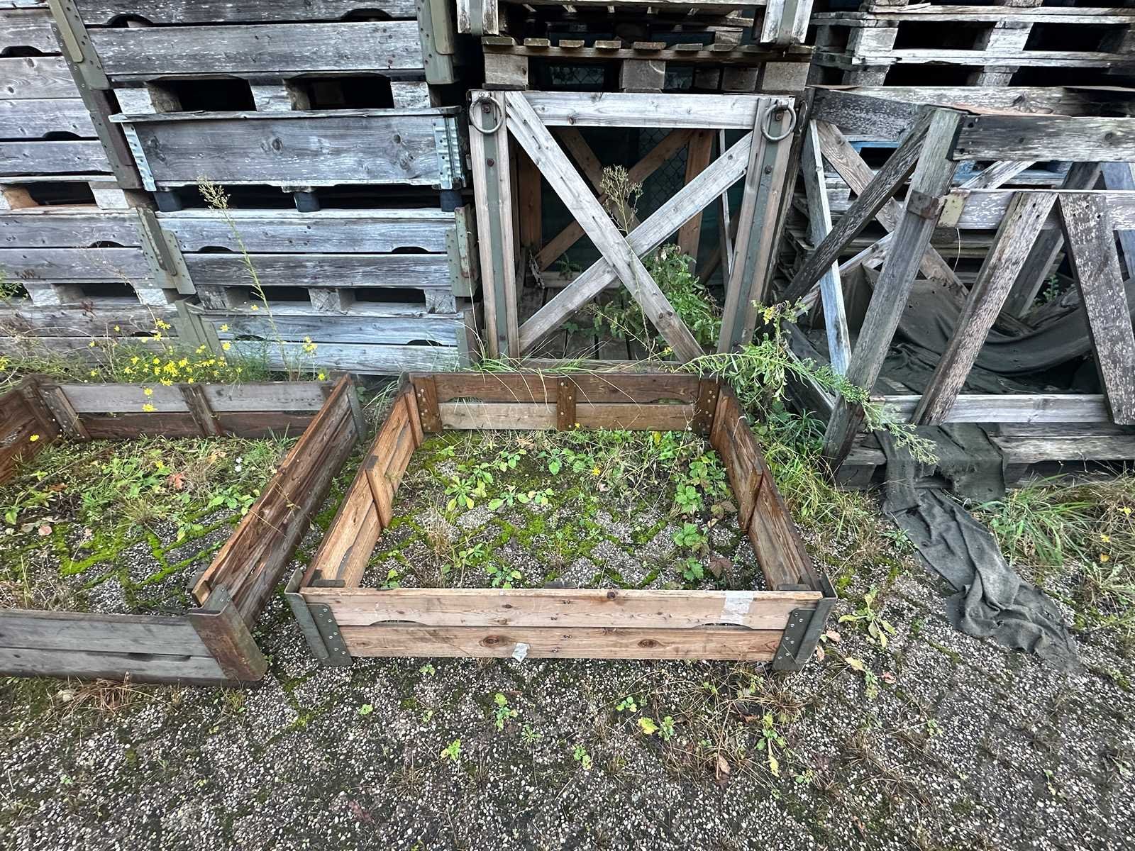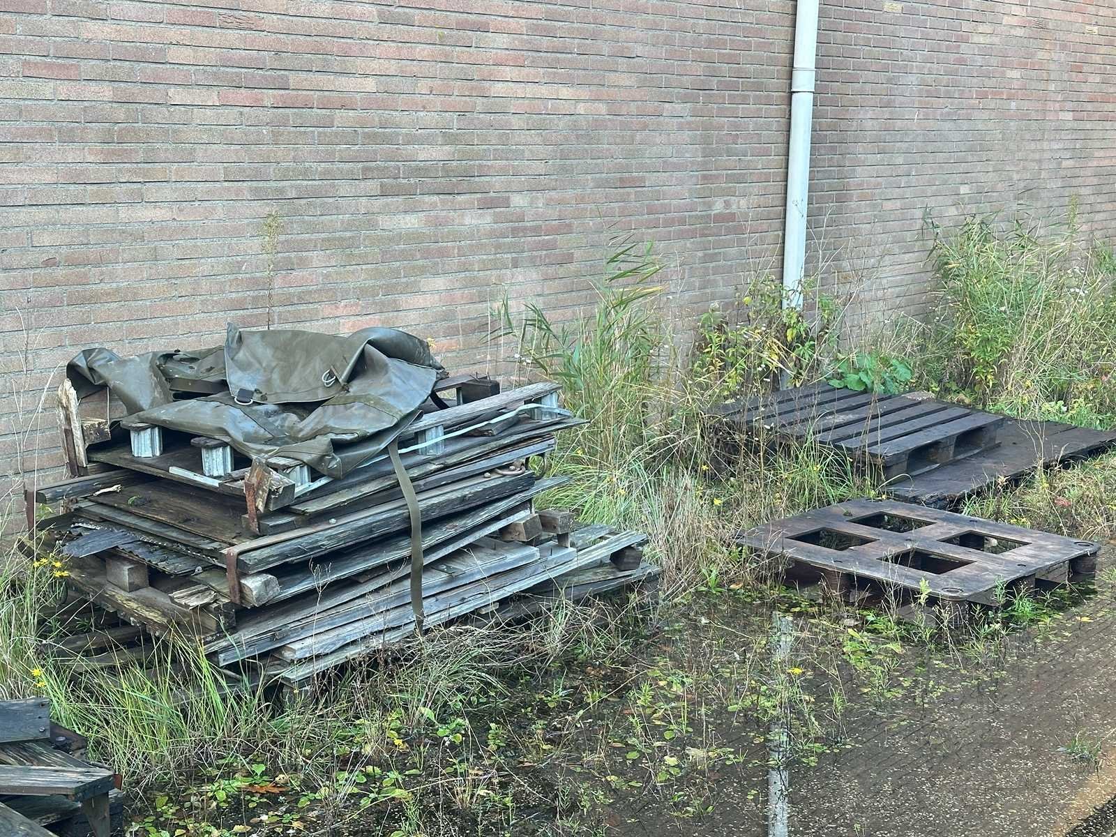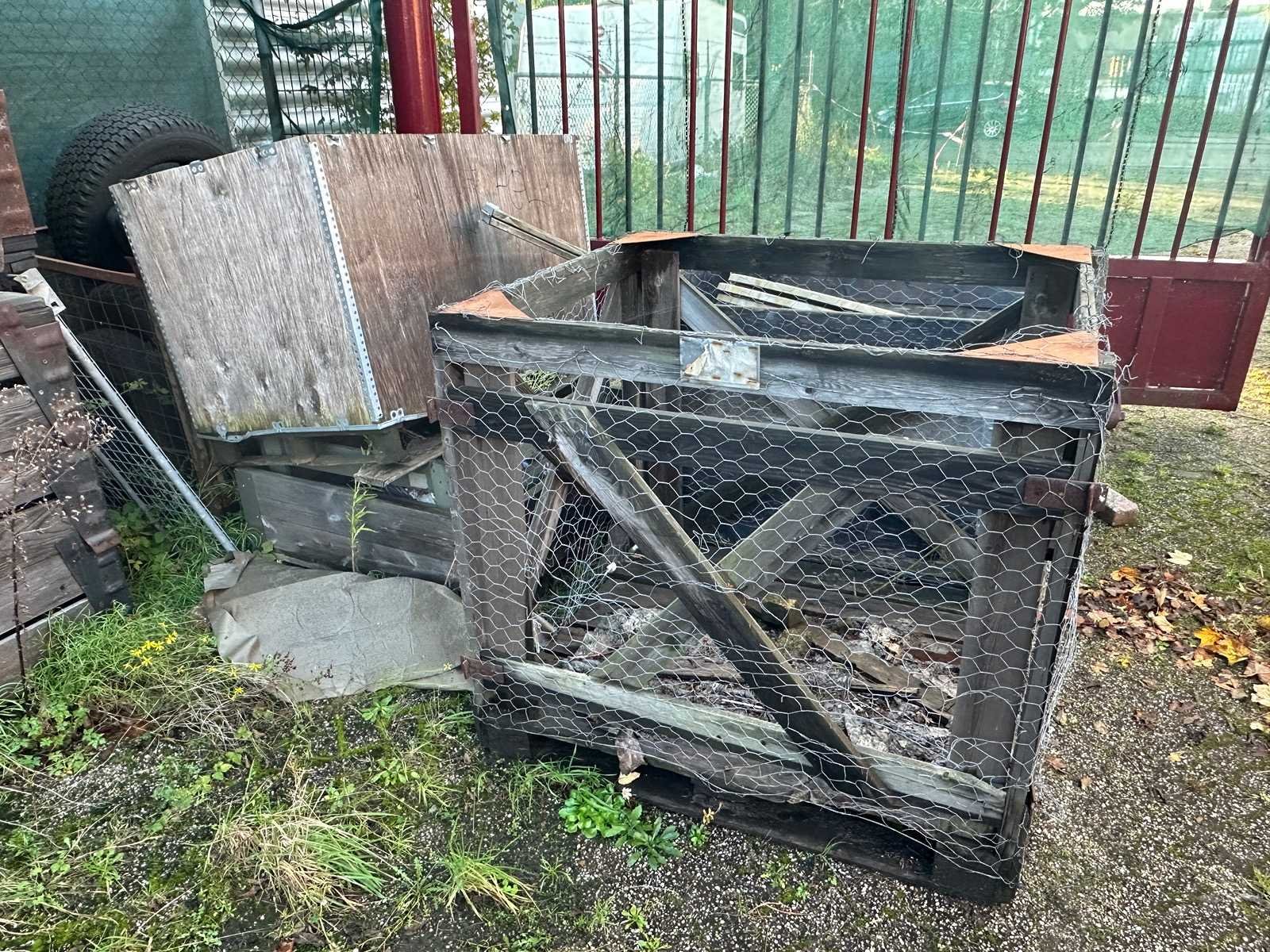 Deze partij bestaat uit een aantal pallets en balletboxen, gedeukte gaaskooi, tafelbladen en banden.