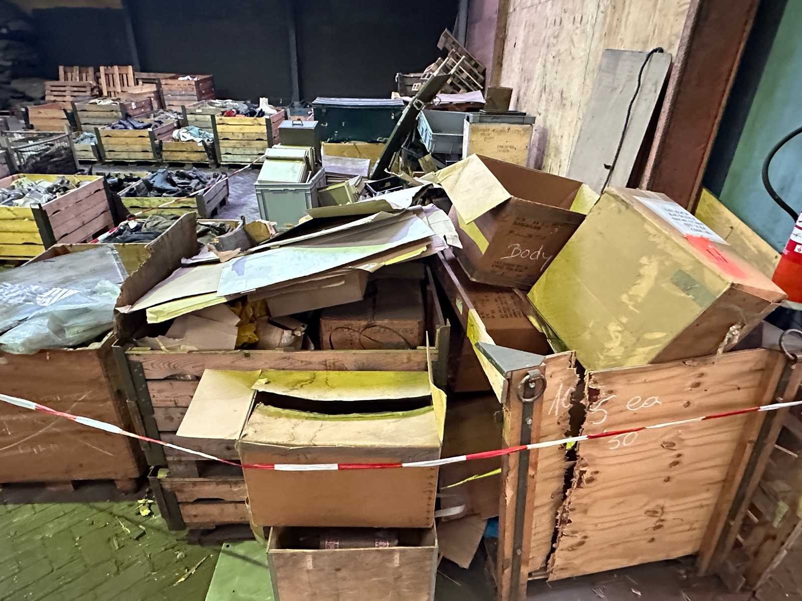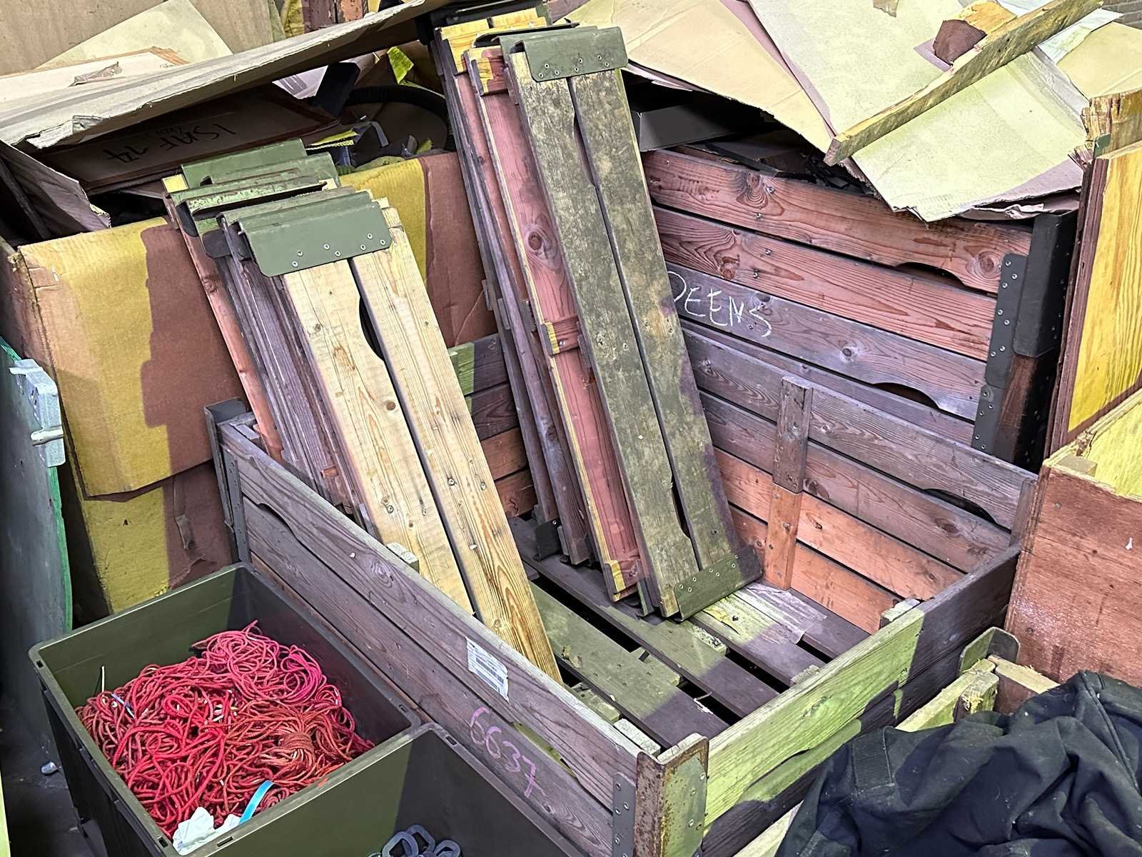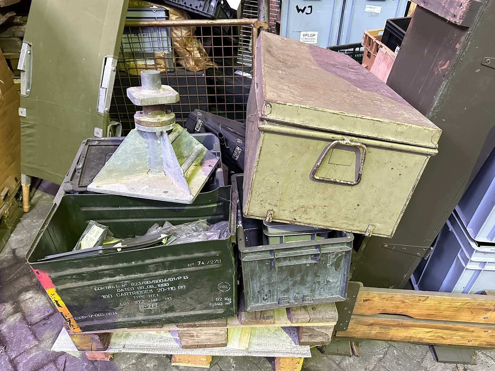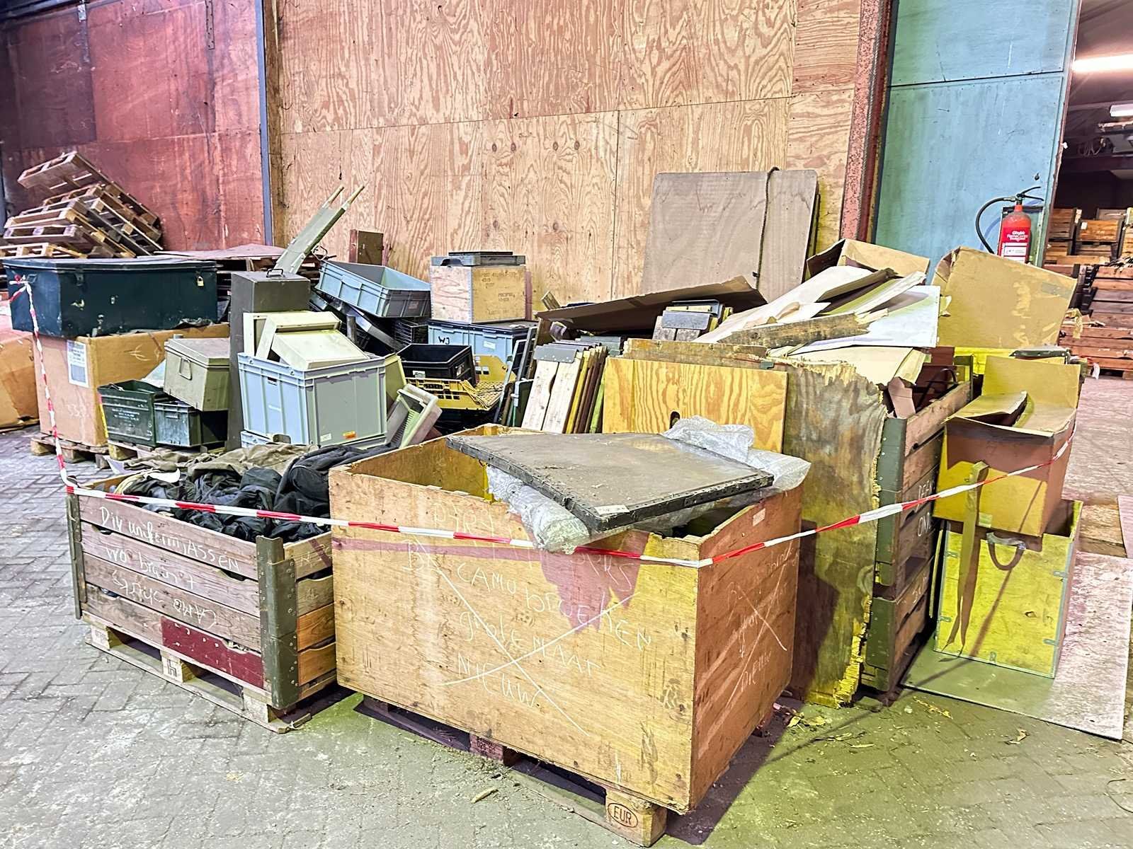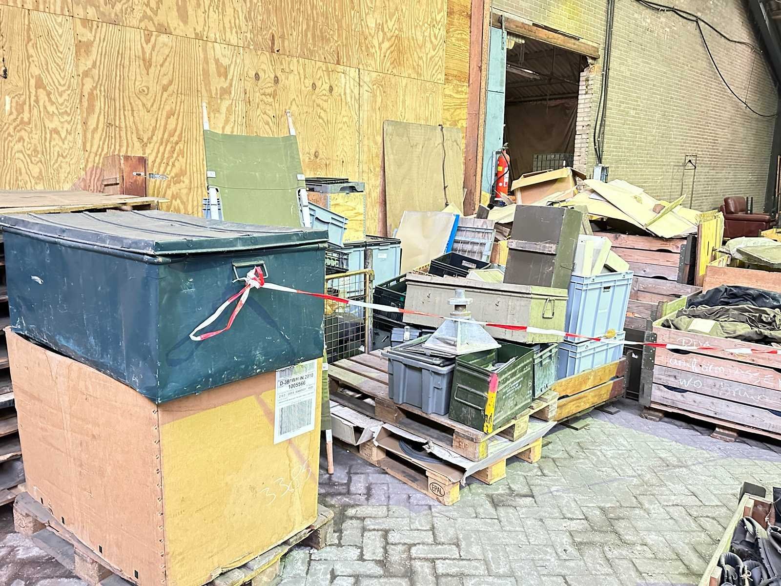 Deze partij bestaat uit militaire transportkisten, pallets en opzetranden, koorden en rubbers, brancard, stapelkratten, zeilen, gaaskooien, plunjezakken en voertuigramen.