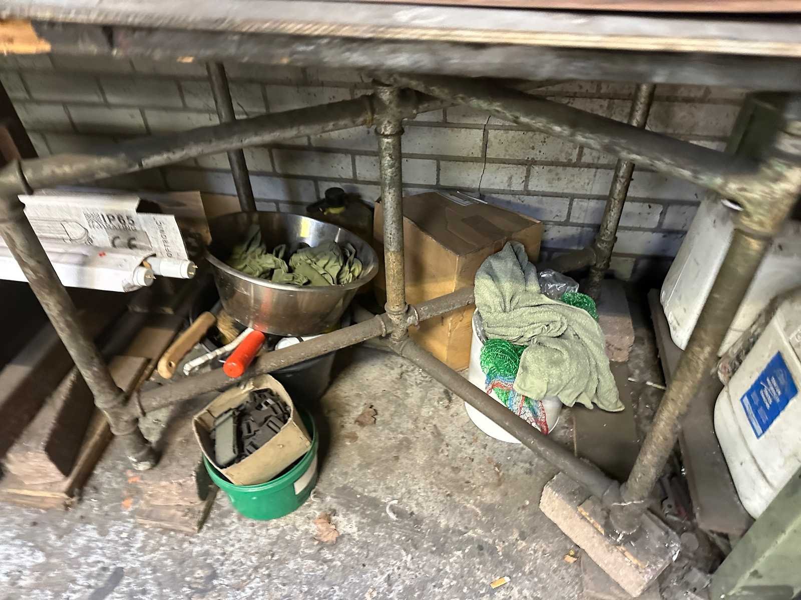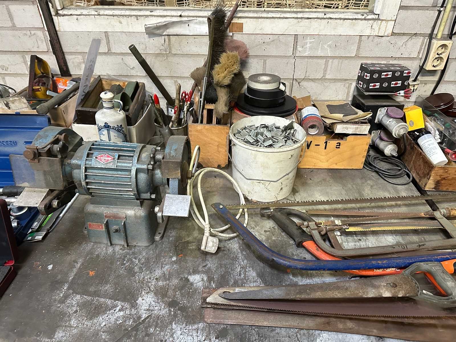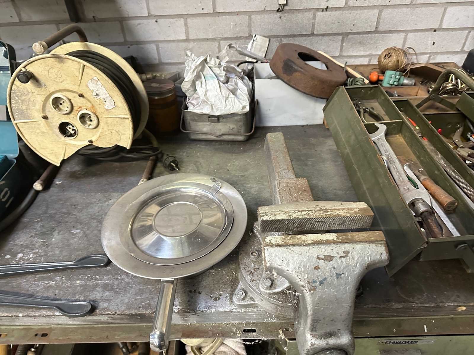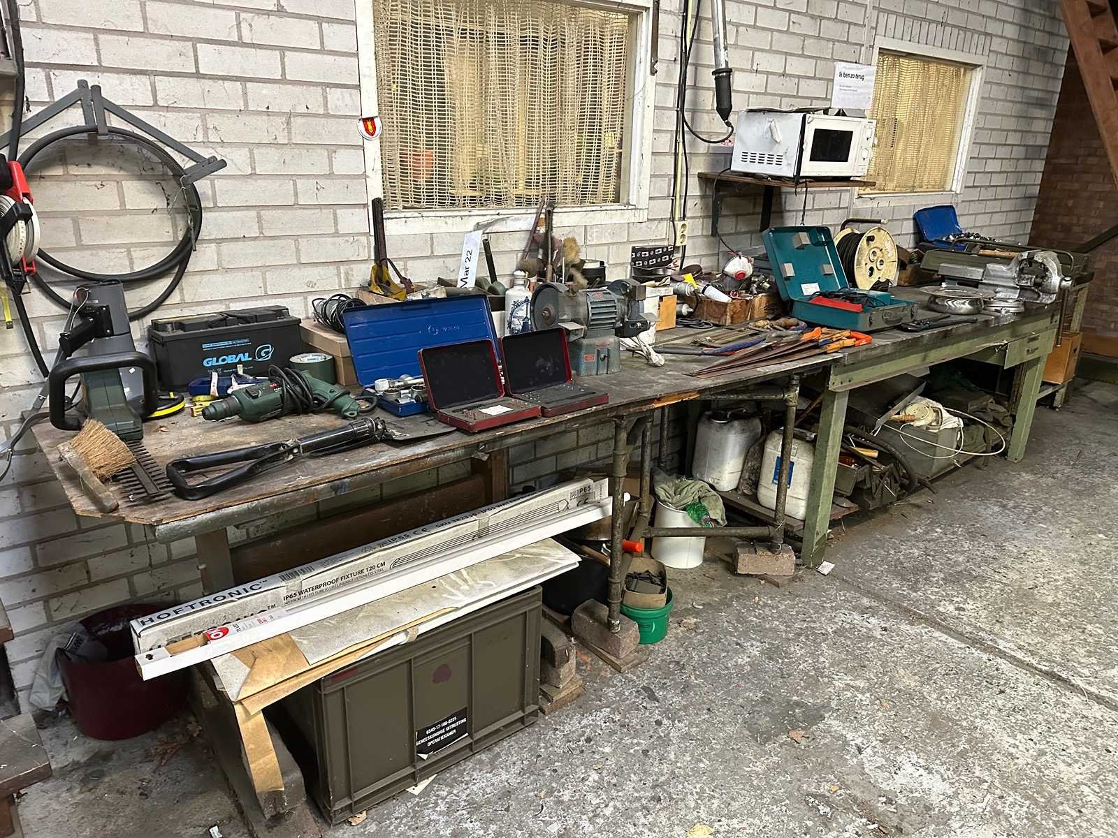 Deze set bestaat uit twee werkbanken met elektrisch- en handgereedschap. Inclusief magnetron en overige zaken op en onder de werkbanken.