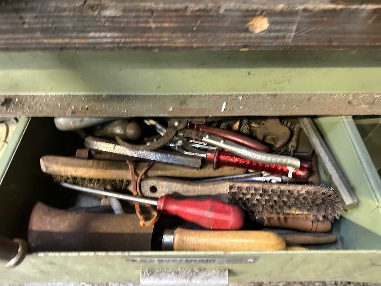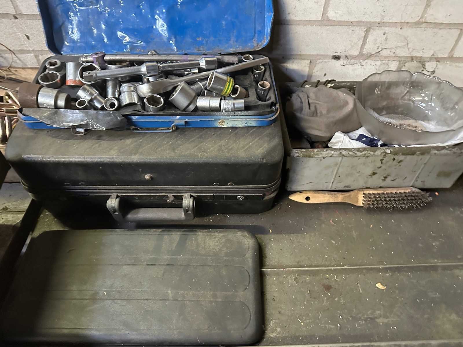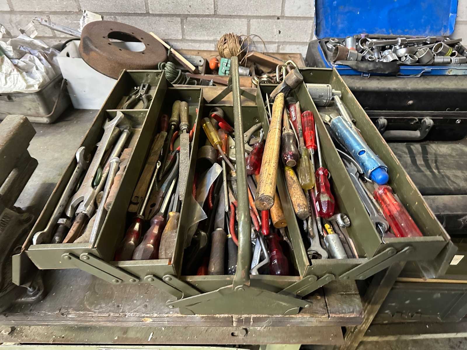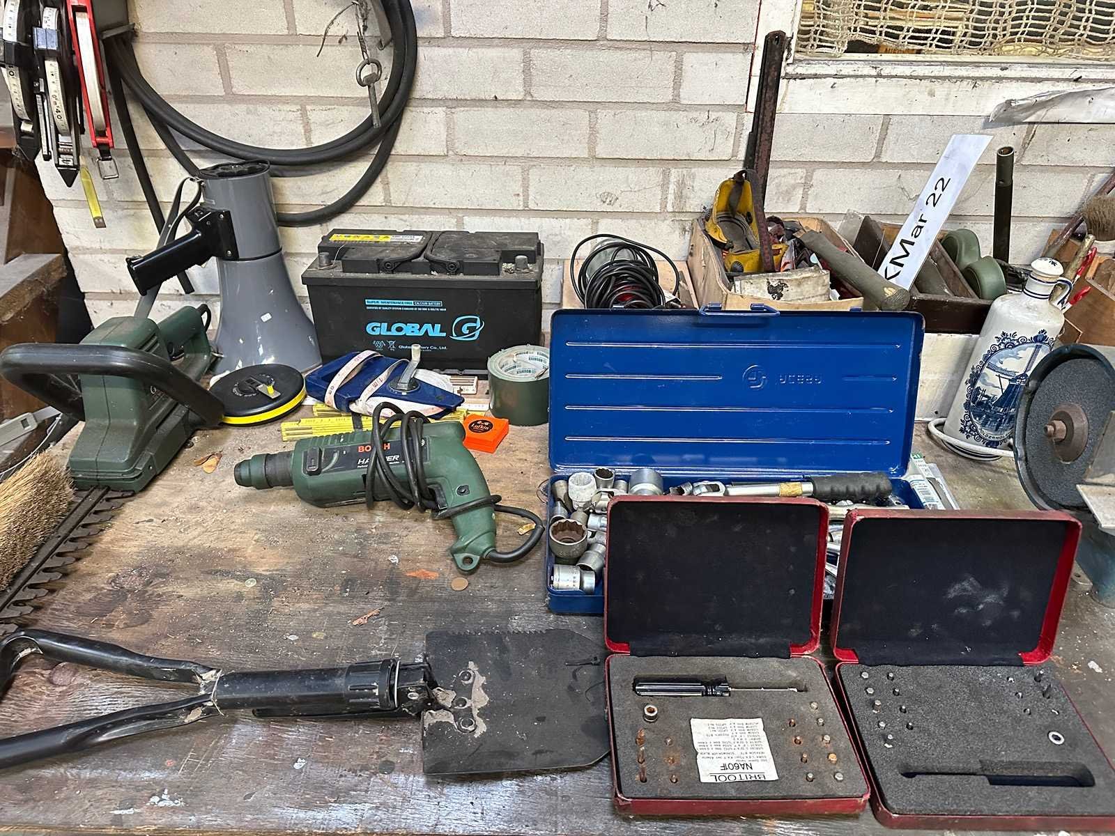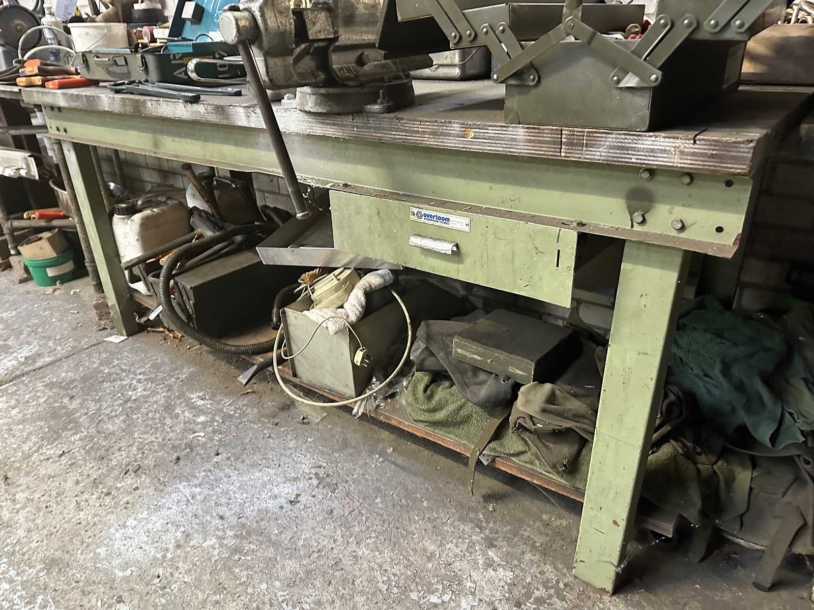 Deze set bestaat uit twee werkbanken met elektrisch- en handgereedschap. Inclusief magnetron en overige zaken op en onder de werkbanken.