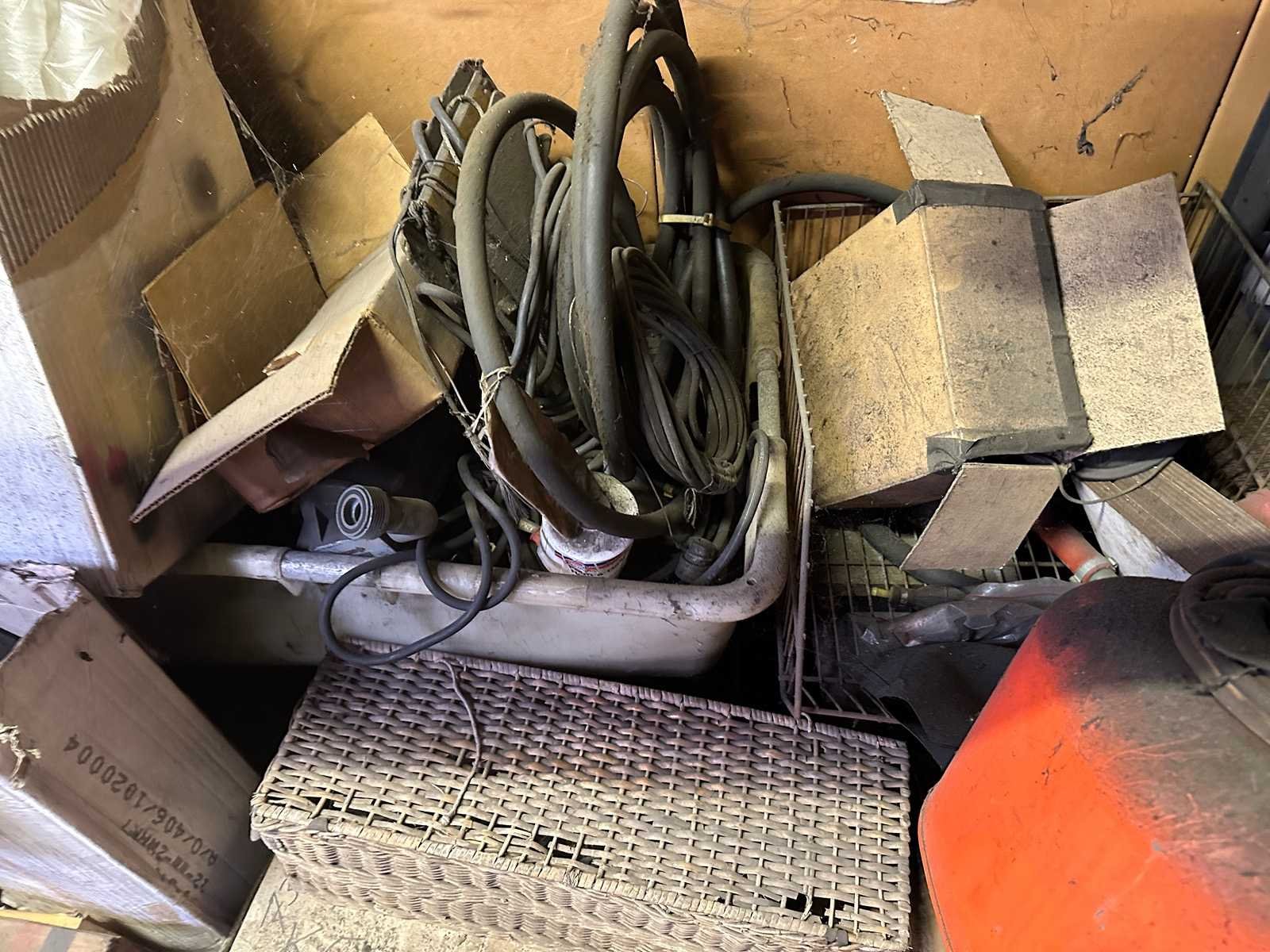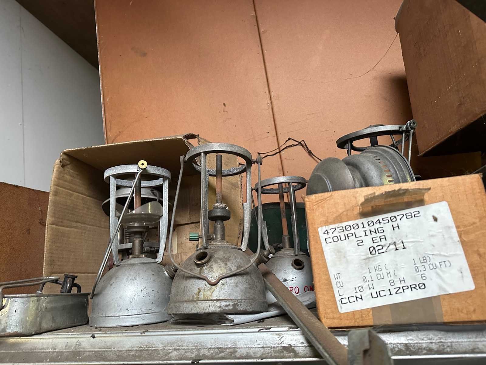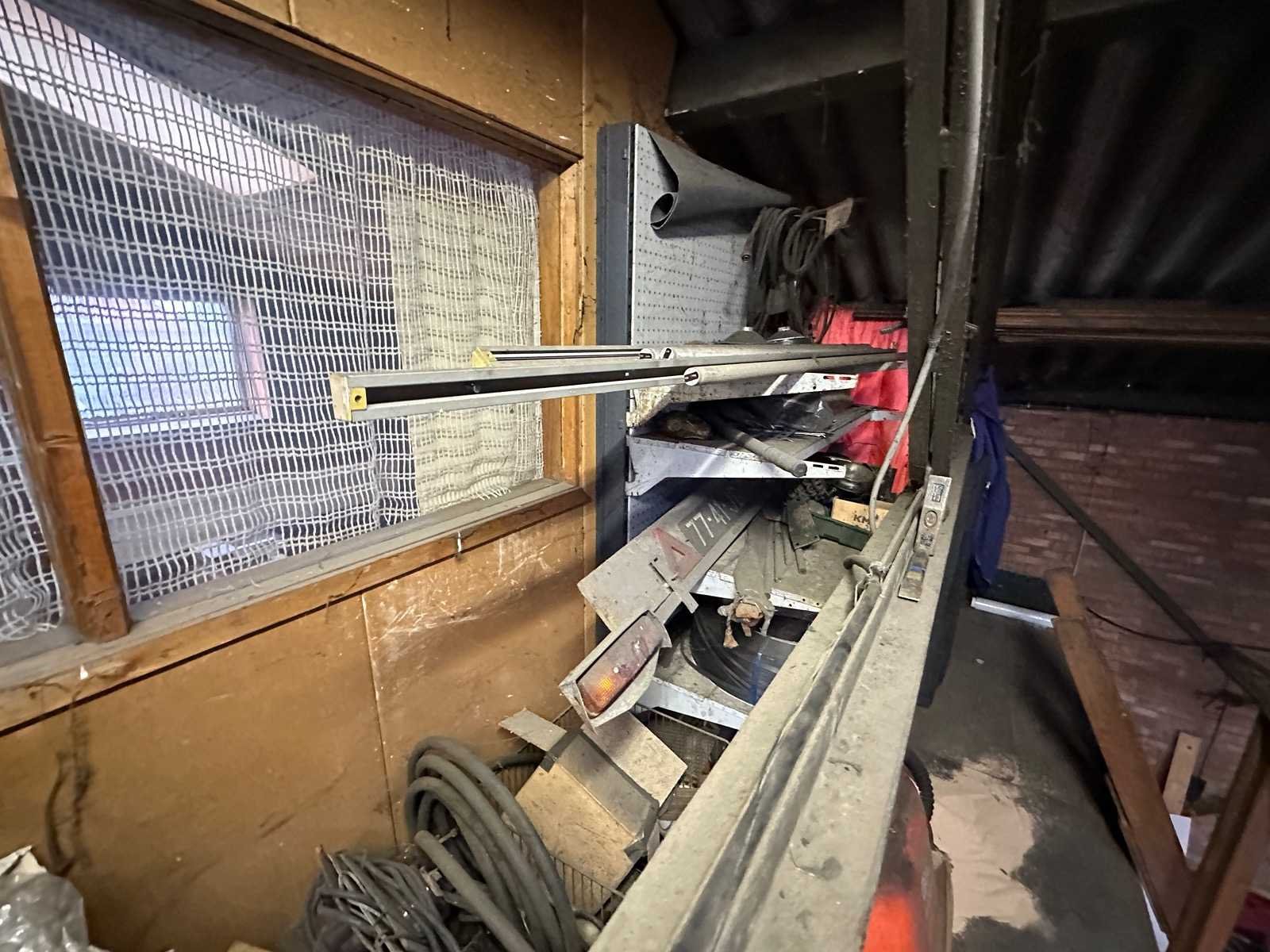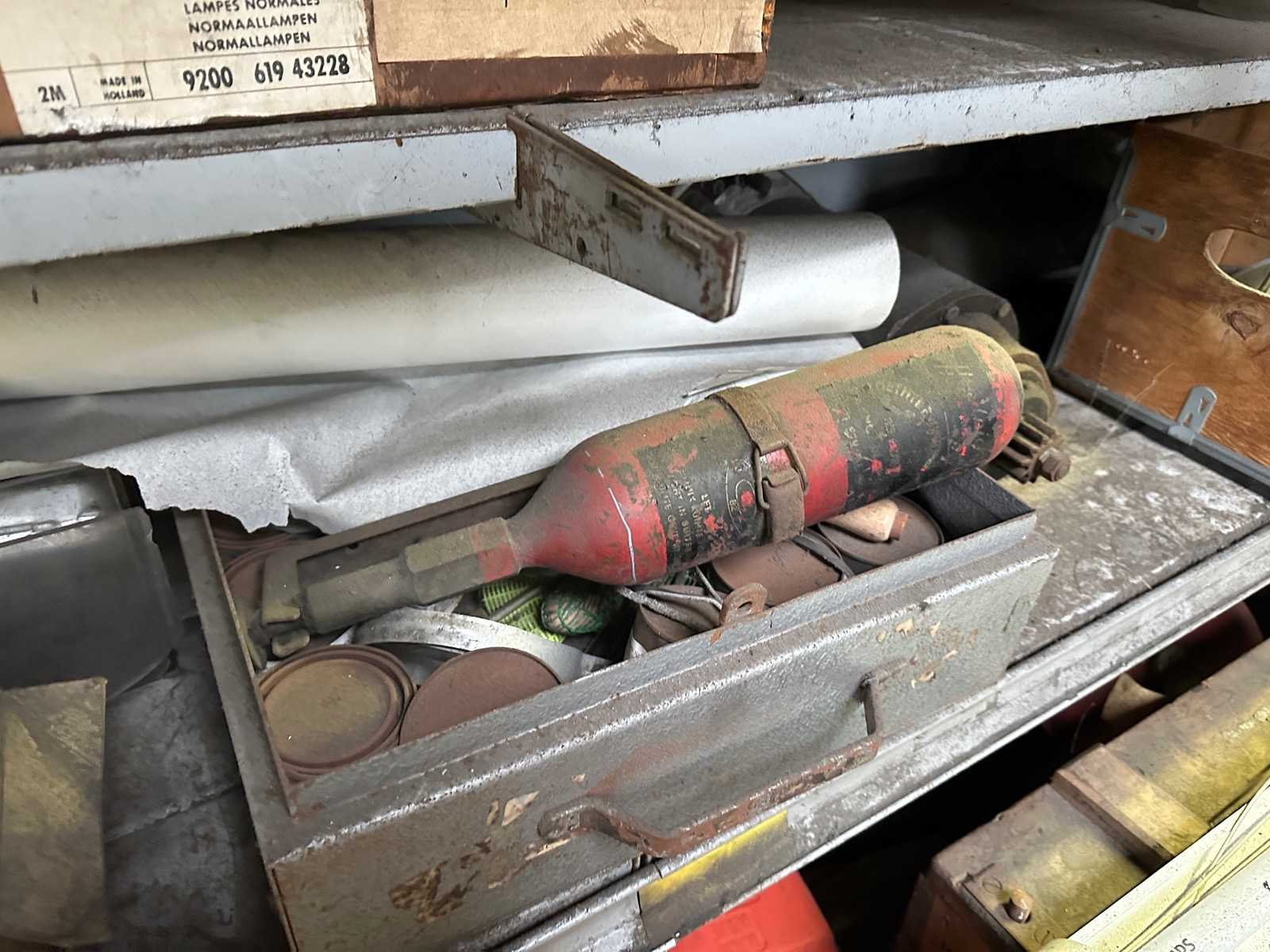Dit kavel bestaat uit de zaken op de vliering zoals zichtbaar op de foto. De inhoud bestaat onder andere uit luchtpomp, gloeilampen, omsnoeringsband, petroleumlampen, vintage blusmaterialen en overige curiosa.