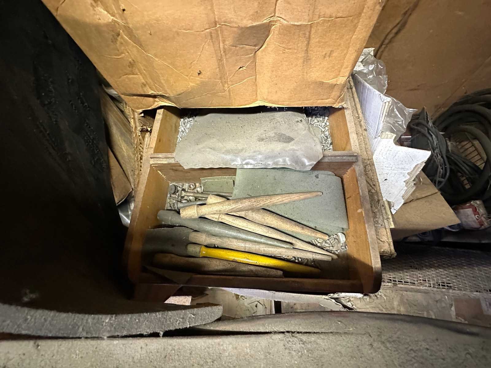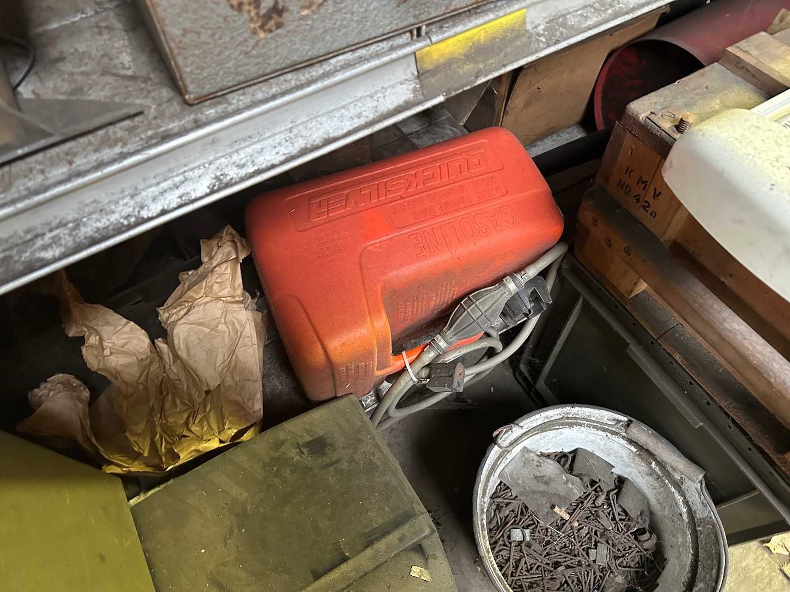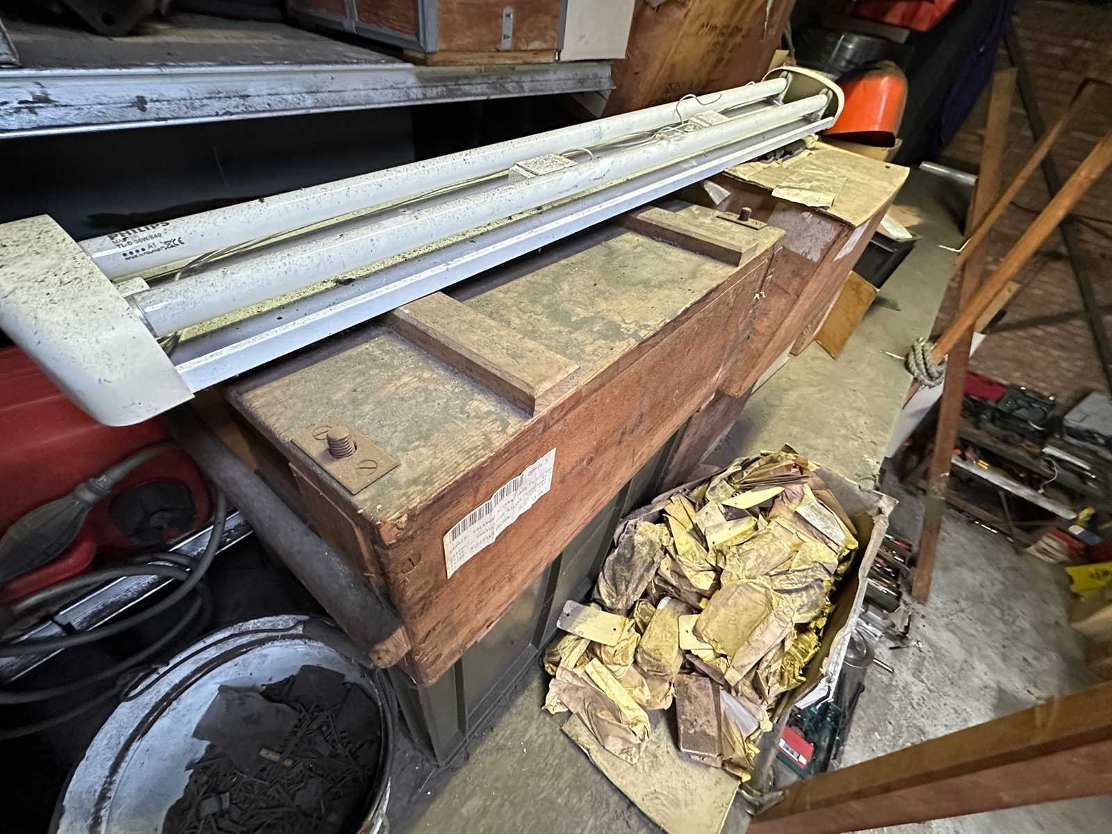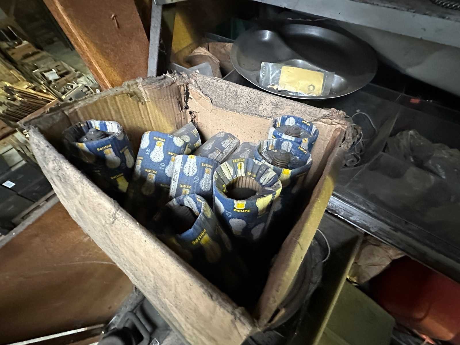 Dit kavel bestaat uit de zaken op de vliering zoals zichtbaar op de foto. De inhoud bestaat onder andere uit luchtpomp, gloeilampen, omsnoeringsband, petroleumlampen, vintage blusmaterialen en overige curiosa.