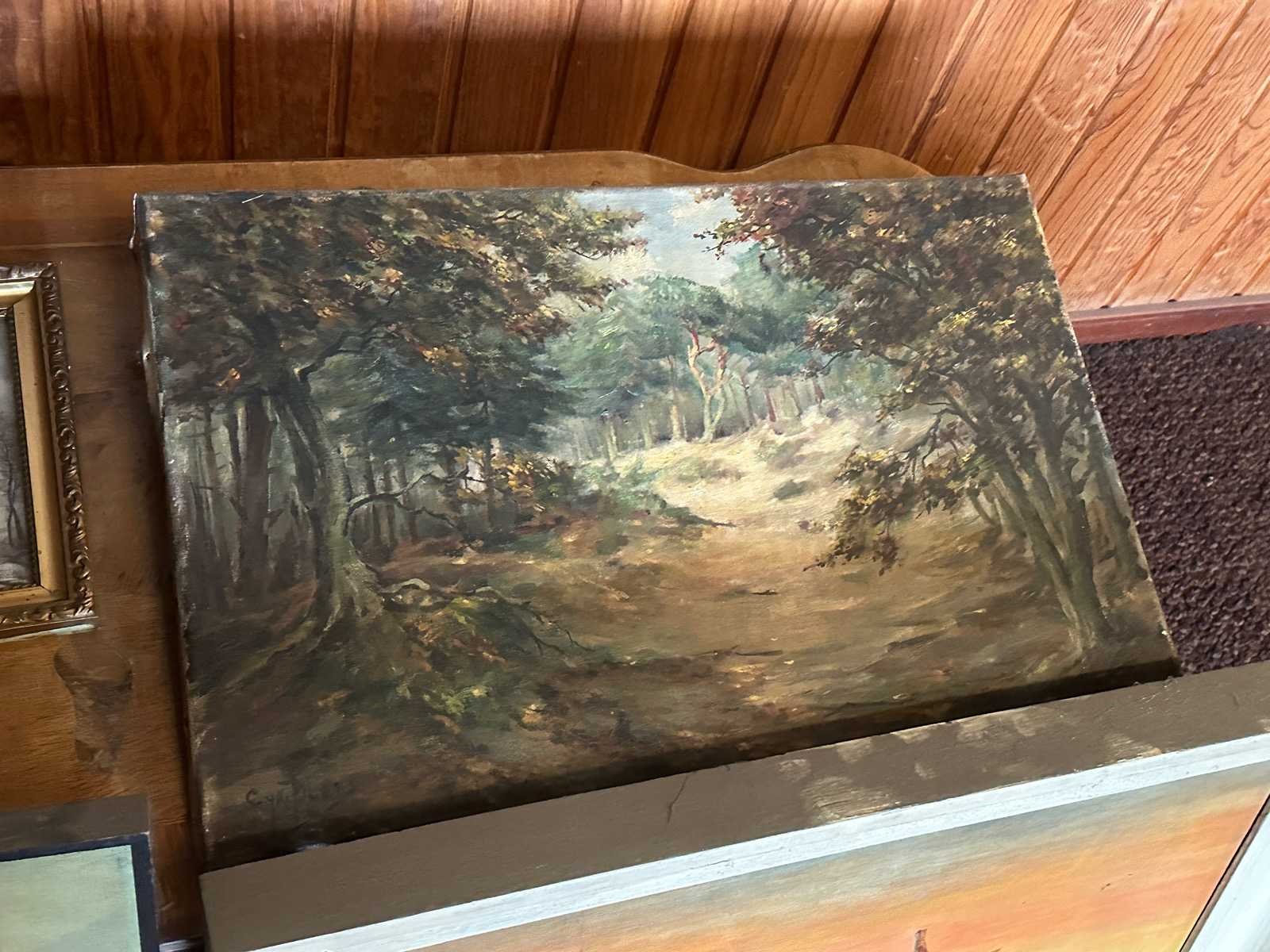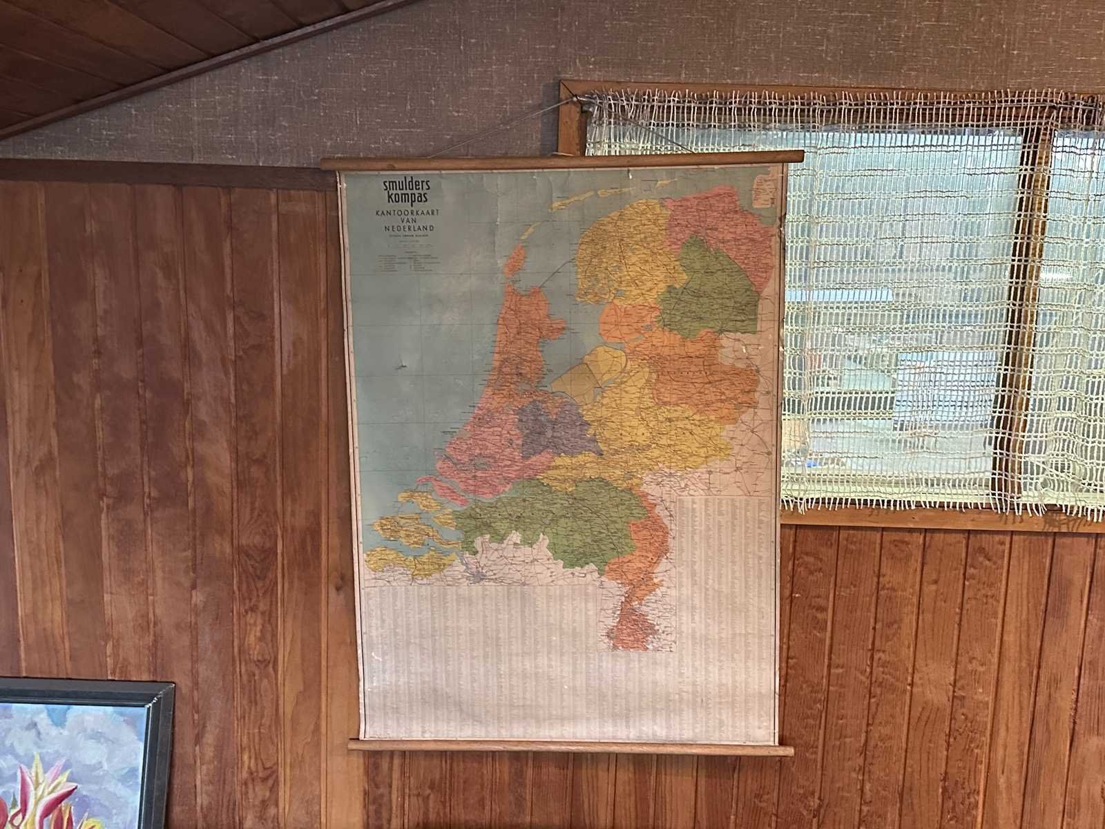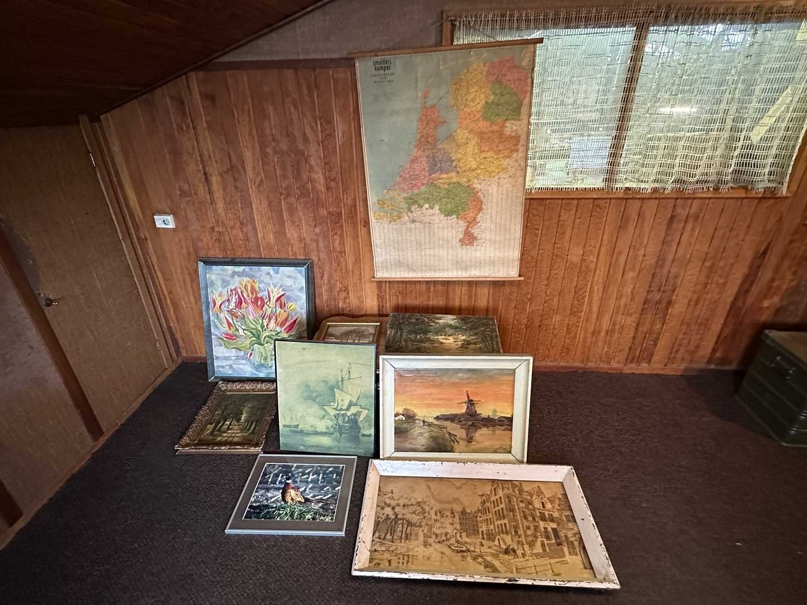 Diverse wanddecoraties waaronder een vintage kaart van Nederland, schilderwerk op canvas en overige prenten.