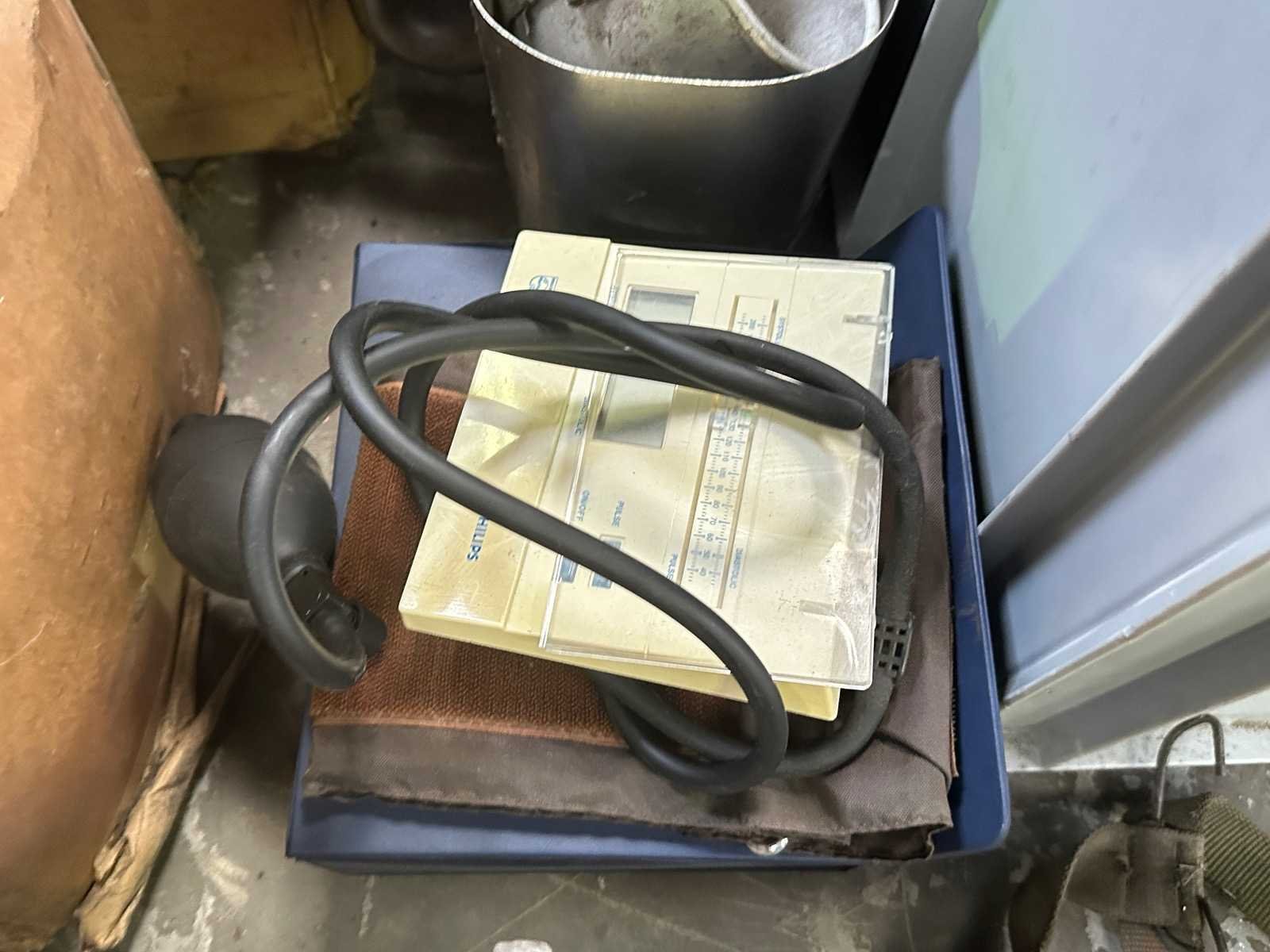 Dit kavel bestaat onder andere uit minutiekistje, luchtpomp, vintage bloeddrukmeter en kist met spanbanden.