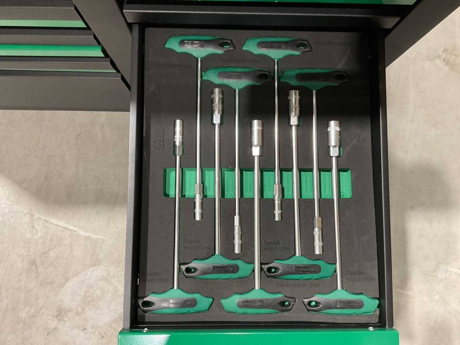 Voorzien van 13 lades waarvan 10 gevuld met gereedschap; professioneel chroom-vanadium gereedschap; heavy duty gereedschapswagen; houten werkblad; 4 wielen; stevig handvat; ongebruikt in doos (transport afmetingen 115x50x100 cm) Merk: Stahlbär Type: Deutschland Bouwjaar: 2025 Aantal laden: 13 Met inhoud: true Eigen gewicht: 134kg Totale afmeting L: 1150mm Totale afmeting Breedte: 500mm Totale afmeting Hoogte: 1000mm