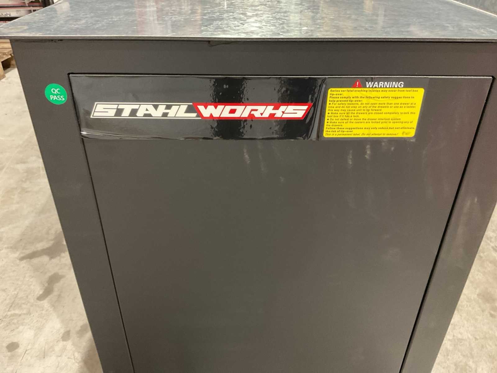 Merk: Stahlworks Model: 4 laden, 4 kastdeuren / In hoogte verstelbaar Product type: Zwarte Breedte: 655mm Lengte: 2210mm Hoogte: 855mm