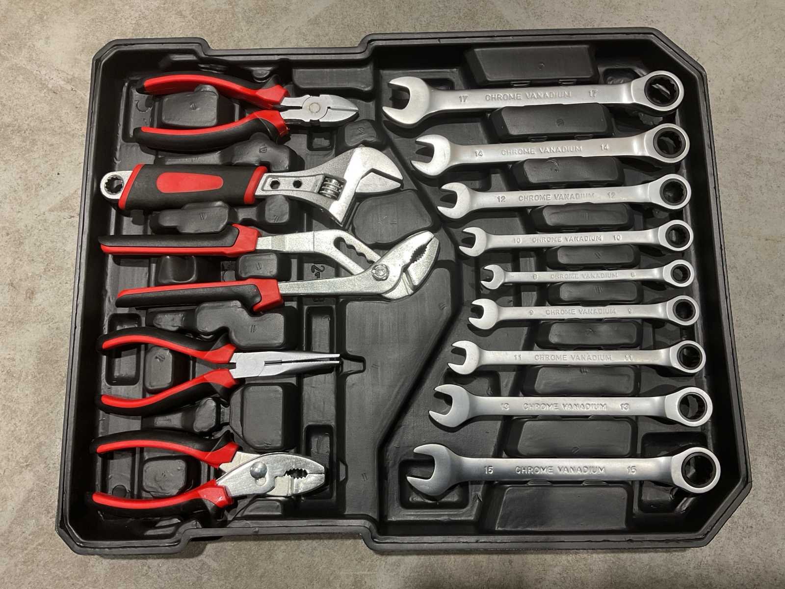 Voorzien van Schroevendraaierset; Zaag; Waterpas; Hamer; Bitset; Inbussleutels; Spanningsmeter; Handgereedschap; Spijkers; pluggen; Aluminium Koffer; Telescoop handgreep; wielen; ongebruikt in doos Merk: KW Tool Type: 399PCS Aluminium: true Metaal: true Met inhoud: true Afmeting l: 38.5mm Afmeting b: 20.5mm Afmeting h: 52mm Eigen gewicht: 13kg