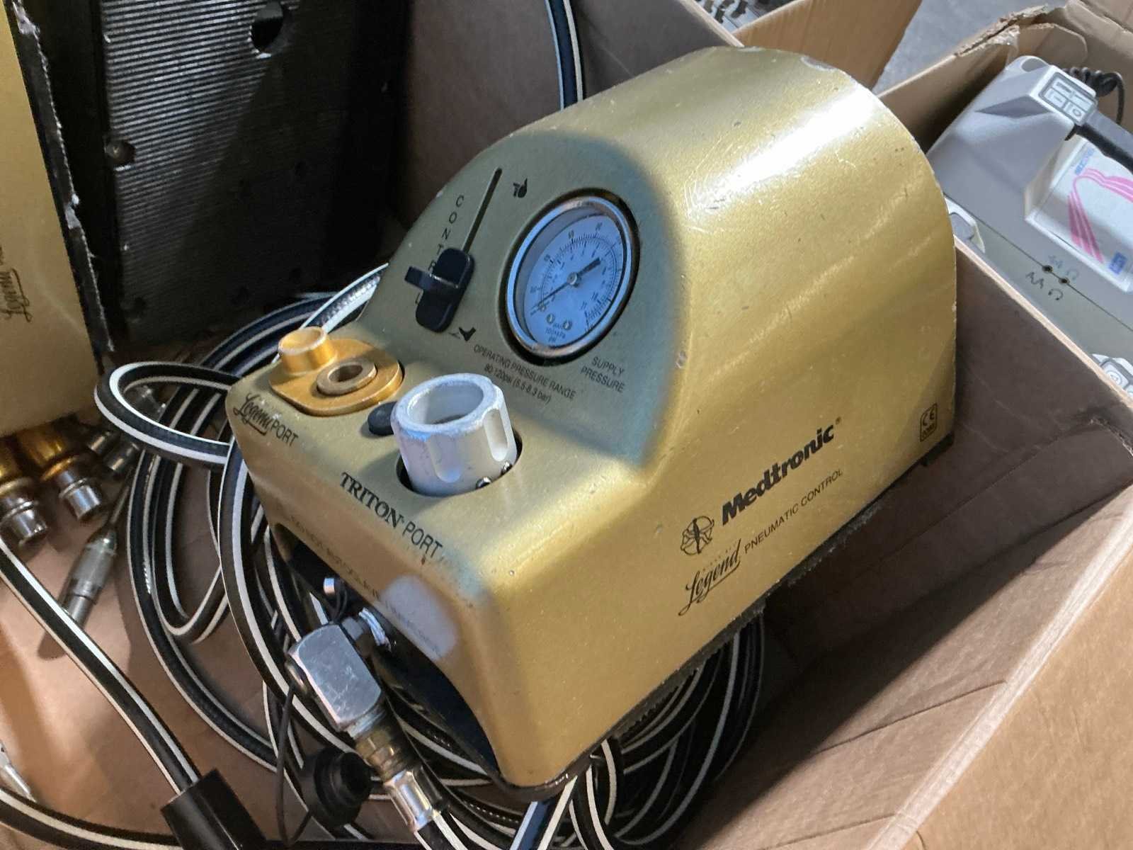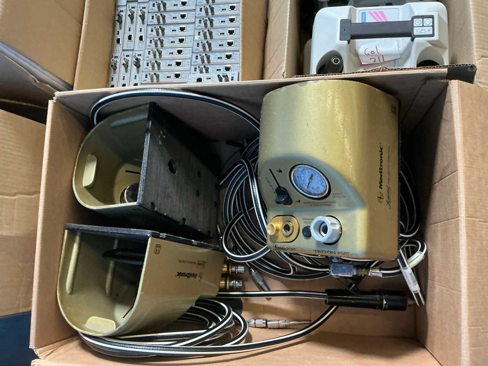 Verschillende soorten waaronder Branson 200 Ultrasonic cleaner, doos met netwerk modules, 3xMedtronic pneumatische control, 4x Imex Dop CT+ unit