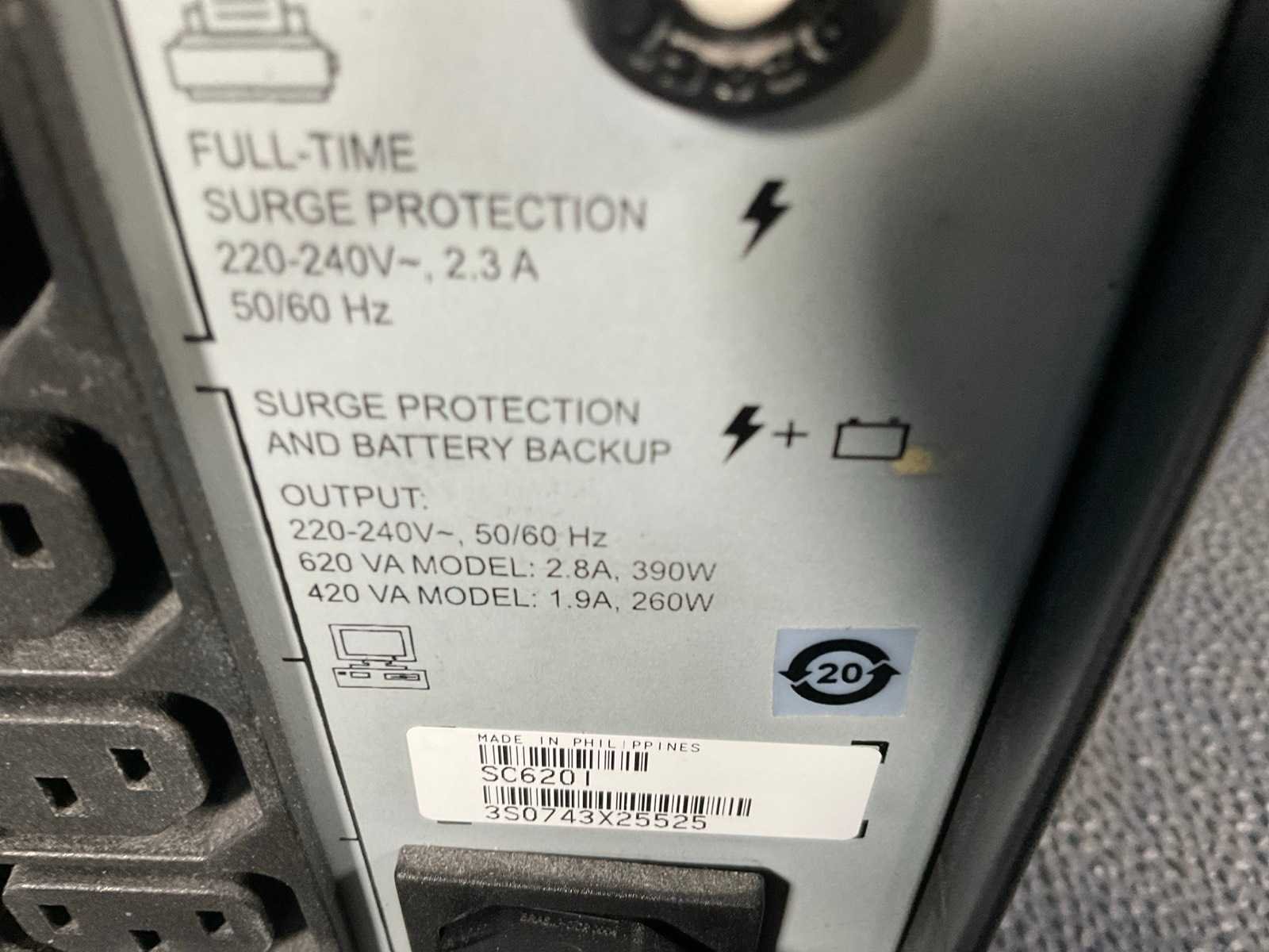 UPS (Uninterruptable power supply) Merk: APC Gewicht: 5kg Serienummer: 3S0743X25525