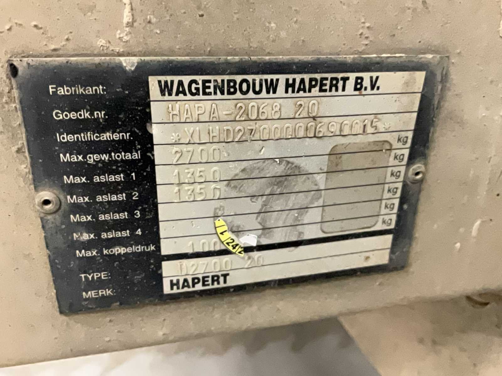 Betreft een kiep aanhangwagen Merk: Hapert Type: HAPA-2068 20 Bouwjaar: 2007 Chassisnummer: XLHD2700000690015 Aantal assen: 2 Laadbak afmeting l: 305cm Laadbak afmeting b: 160cm Ledig gewicht: 640kg Laadvermogen: 2060kg Datum eerste toelating: 2007-07-06 Datum eerste toelating (NL): 2007-07-06 Kenteken: WX-BZ-14 Kentekenpapieren compleet?: true Hoogte: 150cm Lengte: 435cm Breedte: 166cm Nationaliteit documenten: Nl Zelf rijdend exporteren: Yes