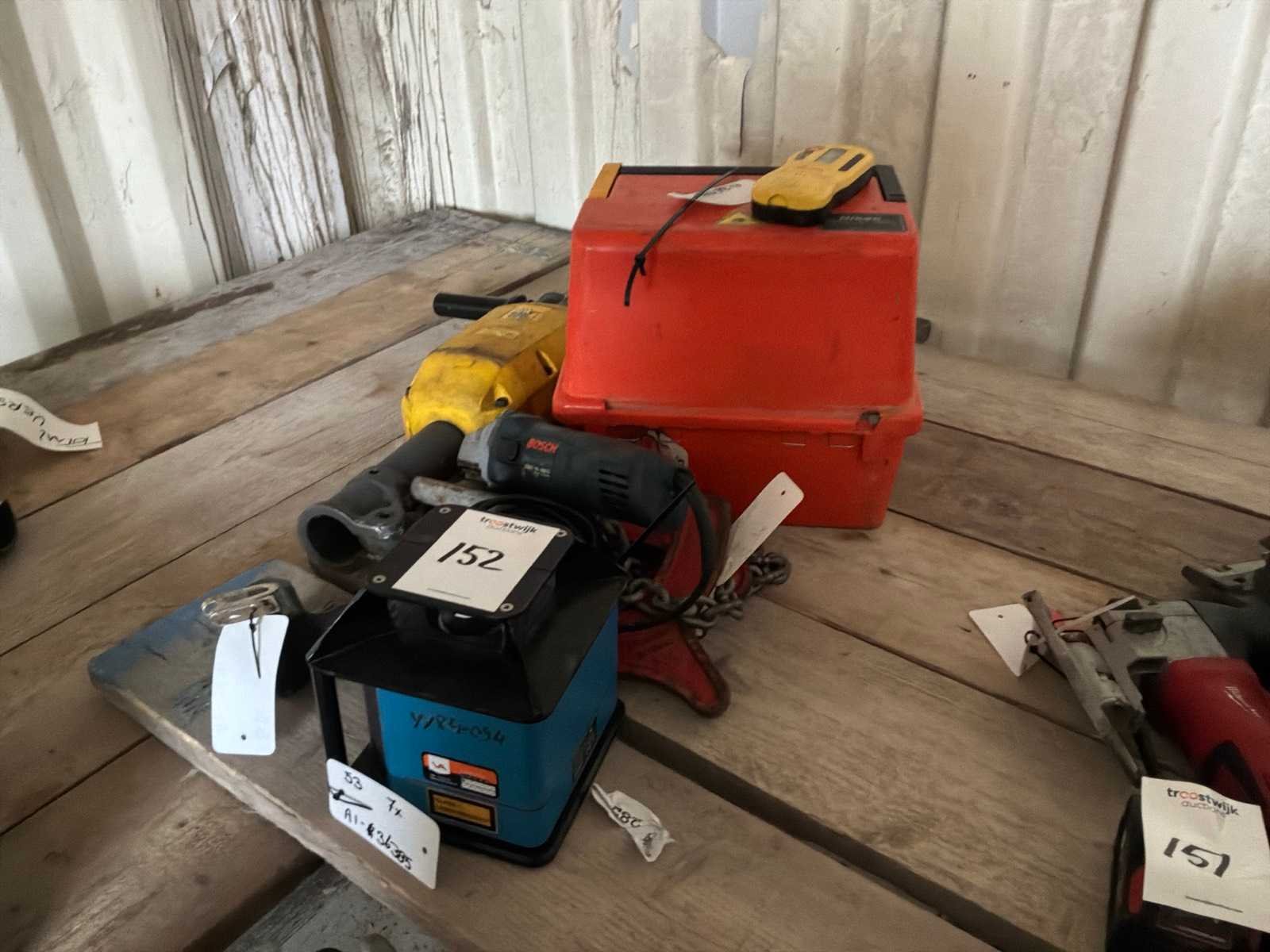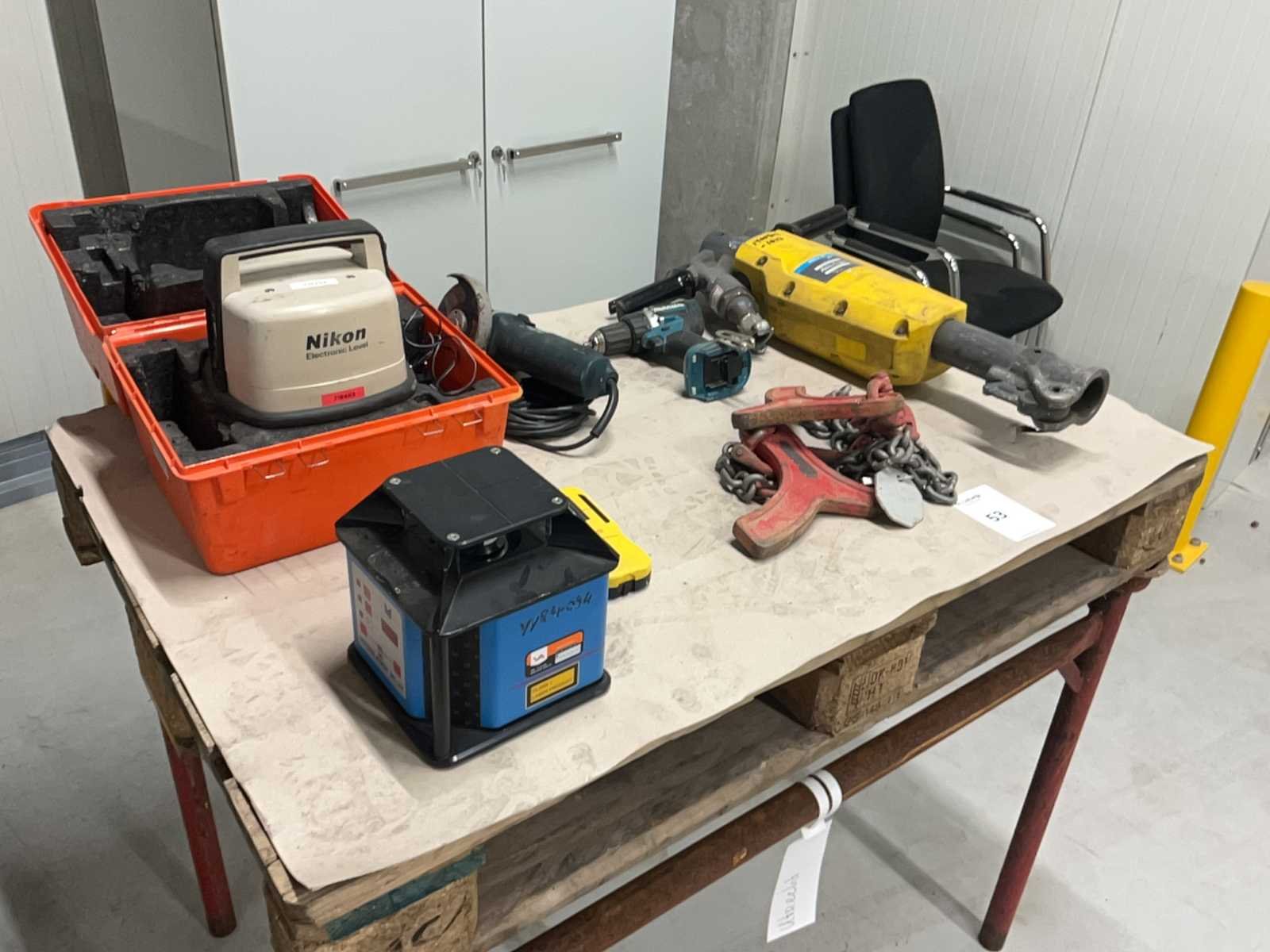 Bestaande uit: Nikon waterpas, Bosch haakse slijper, Makita schroefmachine, Atals Copco sloophamer , Delta stelcon haak, Leica afstandmeter en Mikrofyn laser.