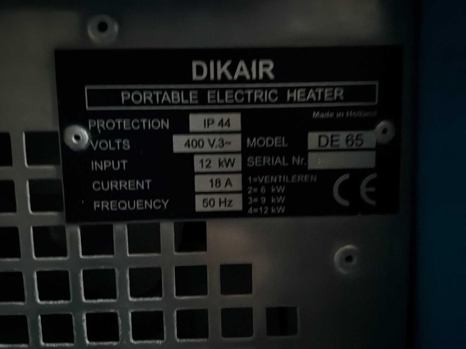 Merk: Dikair Type: DE65 Vermogen: 12kW Totale afmeting L: 600mm Totale afmeting Breedte: 350mm Totale afmeting Hoogte: 45mm Aansluiting: 400V
