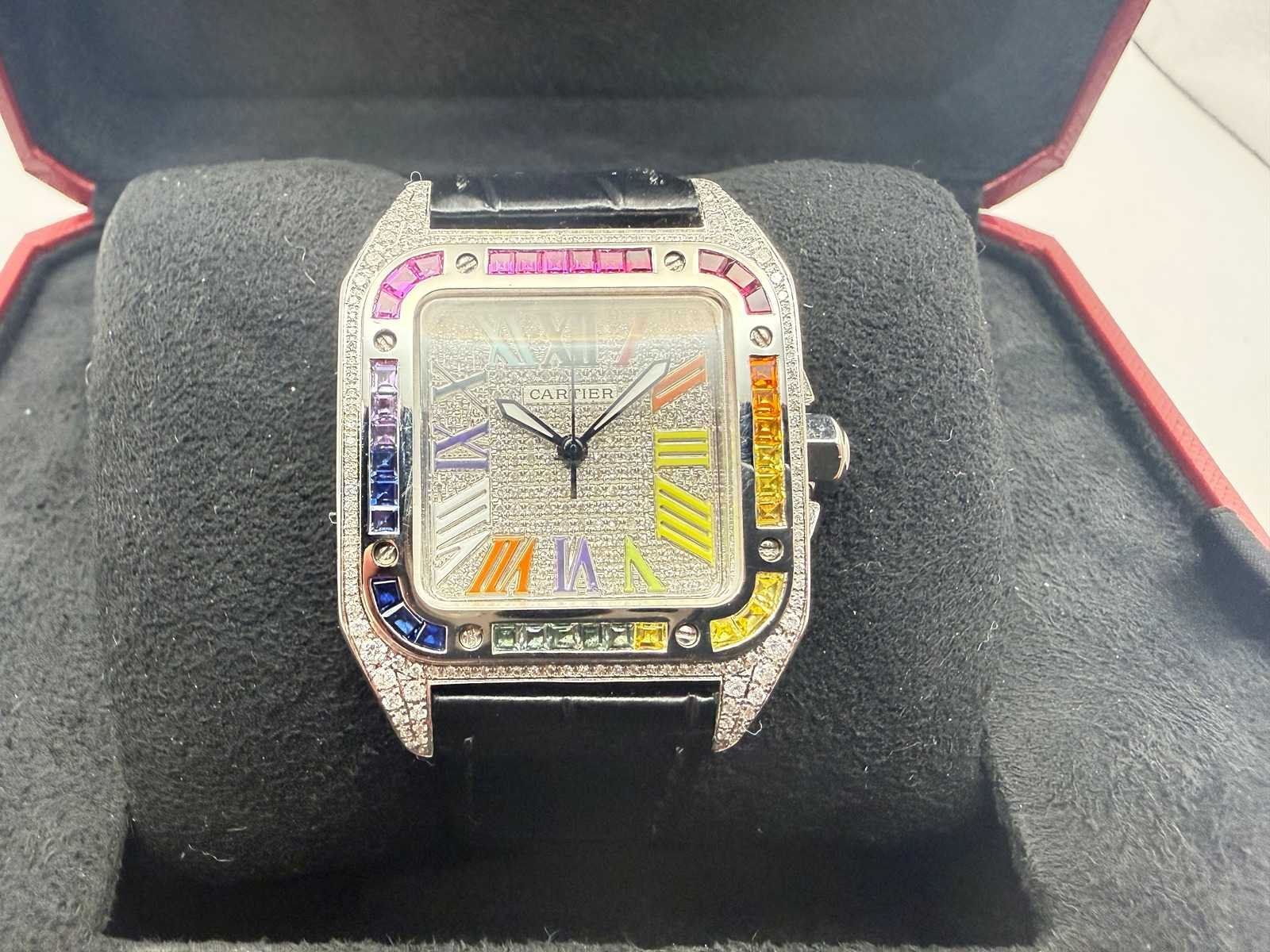 Cartier Santos 100 Medium – Ref. W20126X8 – Fully Diamond Set – Brand New – Full Set Comes with Cartier box Please note: this is a customised watch, meaning it may include components that differ from the original factory specifications. Customisation can vary widely, so we highlight the following possibilities for full transparency: Aftermarket parts The watch may include third-party components (such as bezels, dials, hands, crystals or gem settings) that are not produced by the brand owner. These parts are often added for aesthetic reasons, but are not considered original by the manufacturer. Original parts from other models Some components (e.g. dials or bracelets) may have been sourced from other genuine watches by the same brand. While these parts are authentic, they were not originally fitted to this particular model or reference, which may affect collectability or eligibility for manufacturer service. Non-original parts In some cases, customised watches may include parts that are neither original nor manufactured by the brand. These components can affect the watch’s value. We encourage all bidders to carefully review the photos and description before placing a bid. Keep in mind: customised watches may not be eligible for official service or warranty from the brand. All bids should be placed with full awareness of the customisation status described above. Merk: Cartier Model: Santos 100 Bouwjaar: 2025 Referentienummer: W20126X8 Materiaal kast: Steel / Diamonds Materiaal horlogeband: Leather Materiaal sluiting: Steel / Diamonds Wijzerplaat: Diamonds Kastmaat: 33 mm