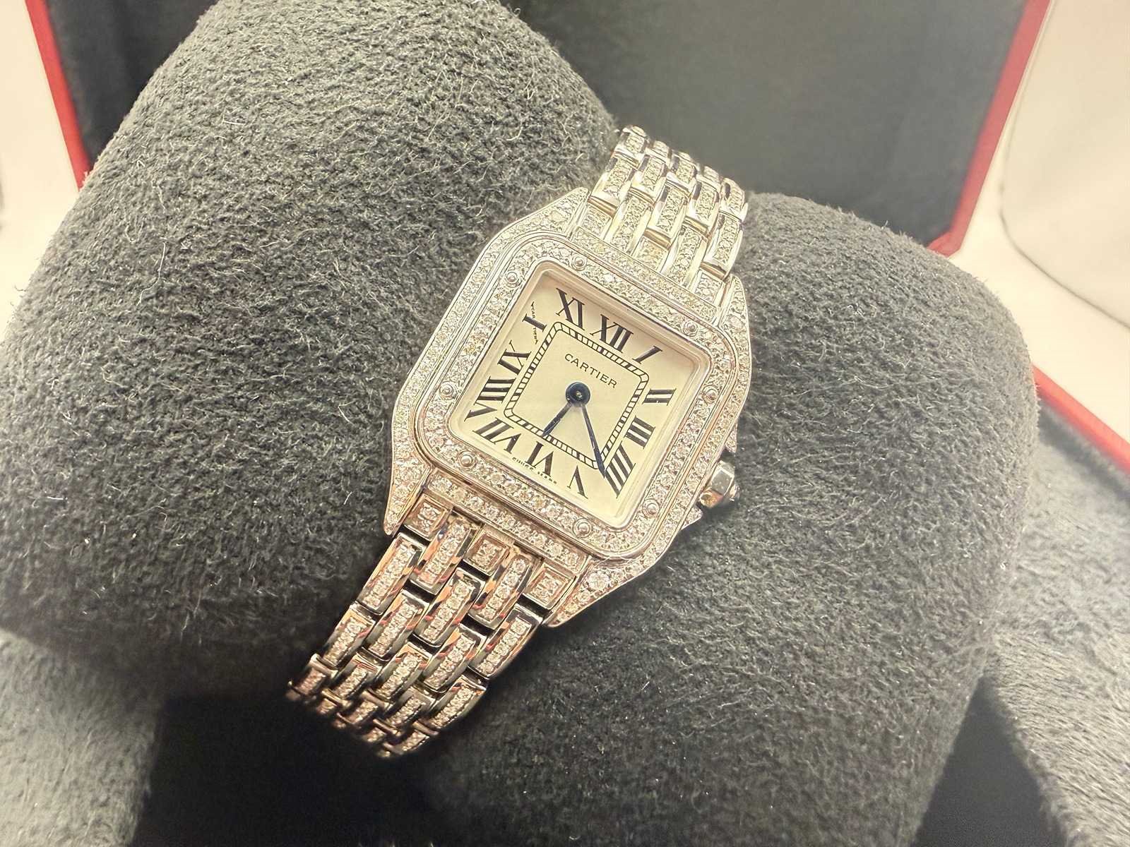 Featuring a perfectly proportioned square case, Roman numeral dial, and signature linked bracelet — all now beautifully enhanced with a full diamond setting. Key Features: Model: Cartier Panthère de Cartier Reference: WSPN0006 Year: 2025 Condition: Brand new, unworn Material: Stainless steel, fully set with natural diamonds Dial: White with Roman numerals Bracelet: Fully set with natural diamonds Movement: Quartz Set: Cartier box Please note: this is a customised watch, meaning it may include components that differ from the original factory specifications. Customisation can vary widely, so we highlight the following possibilities for full transparency: Aftermarket parts The watch may include third-party components (such as bezels, dials, hands, crystals or gem settings) that are not produced by the brand owner. These parts are often added for aesthetic reasons, but are not considered original by the manufacturer. Original parts from other models Some components (e.g. dials or bracelets) may have been sourced from other genuine watches by the same brand. While these parts are authentic, they were not originally fitted to this particular model or reference, which may affect collectability or eligibility for manufacturer service. Non-original parts In some cases, customised watches may include parts that are neither original nor manufactured by the brand. These components can affect the watch’s value. We encourage all bidders to carefully review the photos and description before placing a bid. Keep in mind: customised watches may not be eligible for official service or warranty from the brand. All bids should be placed with full awareness of the customisation status described above. Merk: Cartier Model: Panthere Bouwjaar: 2025 Referentienummer: WSPN0006 Materiaal kast: Steel / Diamonds Materiaal horlogeband: Steel / Diamonds Materiaal sluiting: Steel / Diamonds Wijzerplaat: White Roman Kastmaat: 22 mm
