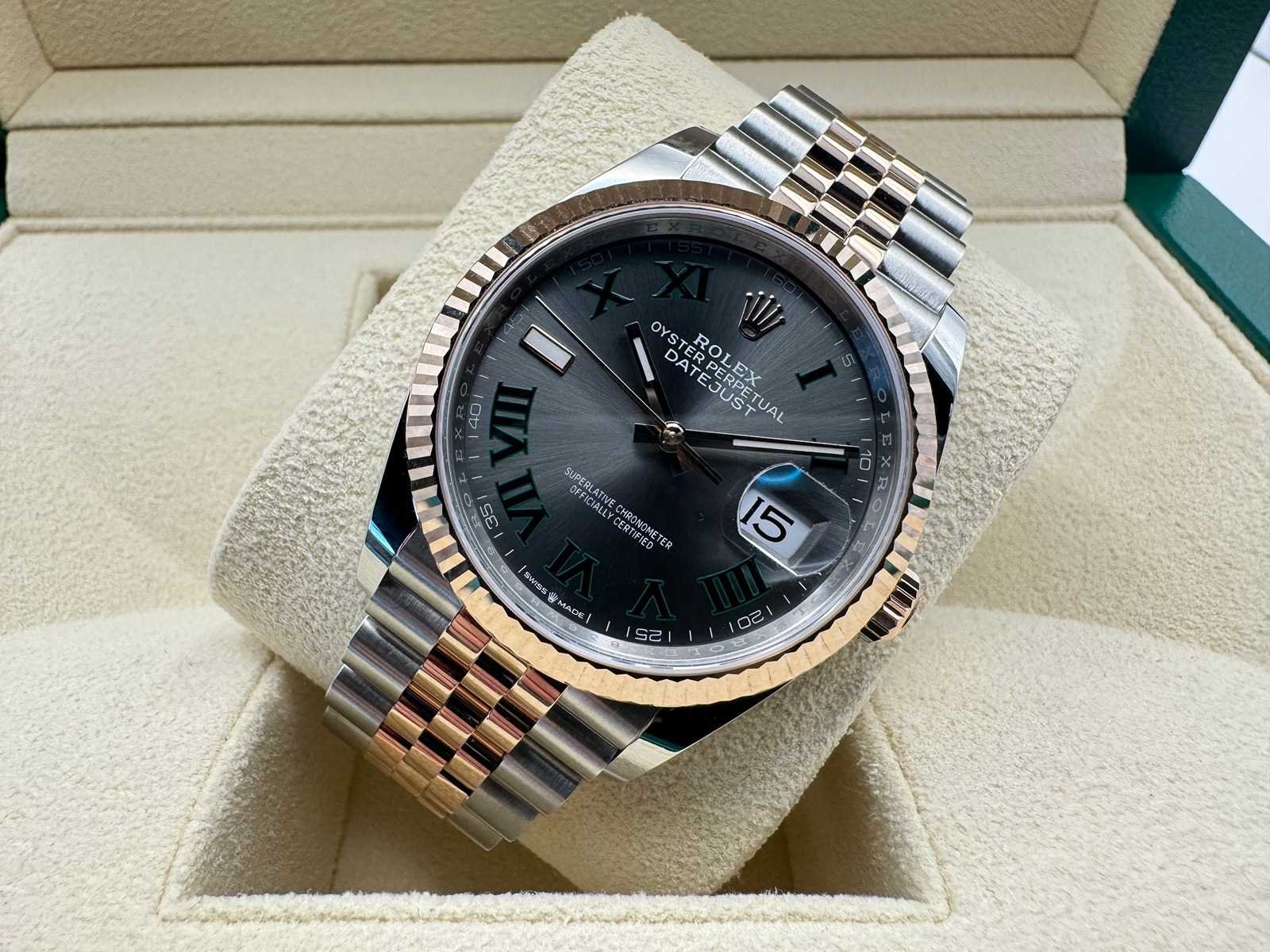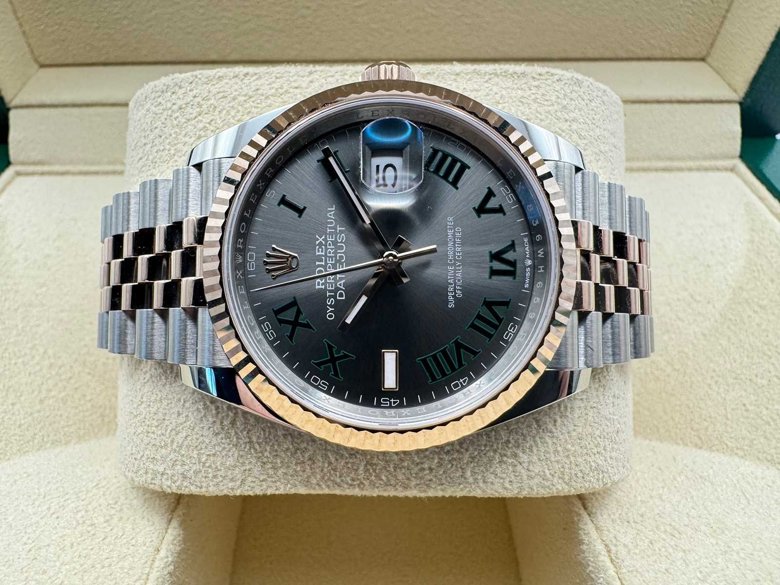 Key features: Model: Rolex Datejust 36mm Year: 2025 Condition: Brand new, unworn Material: Stainless steel and rose gold Bracelet: Jubilee Dial: Grey Wimbledon with green Roman numerals International warranty: Valid until 2030 Full set: Includes box, papers, warranty card, and Rolex tag Merk: Rolex Model: Datejust 36 Bouwjaar: 2025 Referentienummer: 126231 Materiaal kast: Steel Materiaal horlogeband: Steel / Gold Jubilee Fluted Materiaal sluiting: Steel Gold Wijzerplaat: Wimbledon Kastmaat: 36 mm
