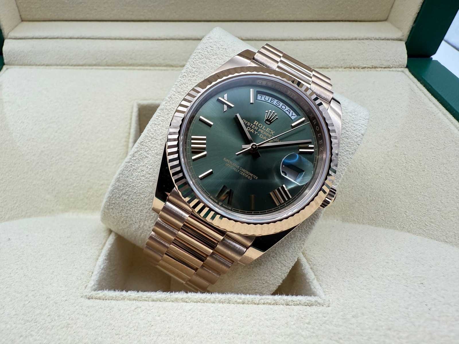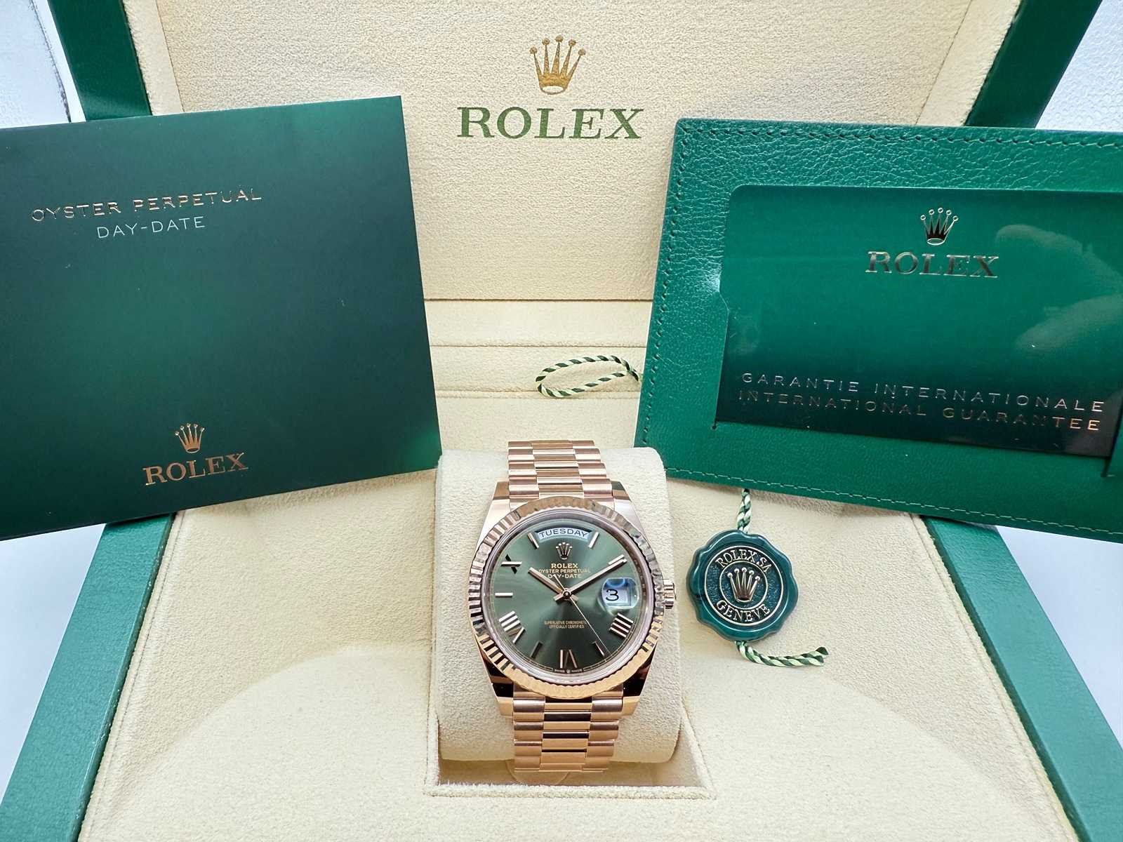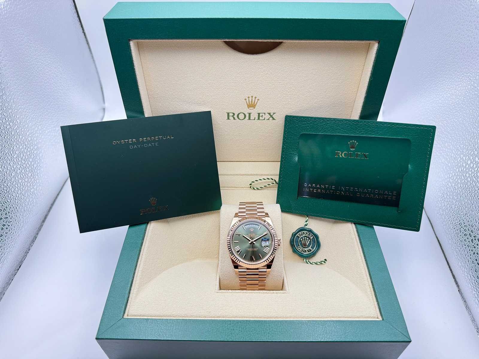 Key Features: Model: Rolex Day-Date 40 Reference: 228235 Condition: Brand new, unworn Material: 18k Everose gold Dial: Olive green sunray finish Bracelet: President (Everose gold) Functions: Day and date display Warranty: 5-year international Rolex warranty Full set: Includes Rolex box, warranty card, booklets, cardholder, and tag Merk: Rolex Model: Day-Date Bouwjaar: 2025 Referentienummer: 228235 Materiaal kast: Rose Gold Materiaal horlogeband: Rose Gold Materiaal sluiting: Rose Gold Wijzerplaat: Olive Kastmaat: 40 mm