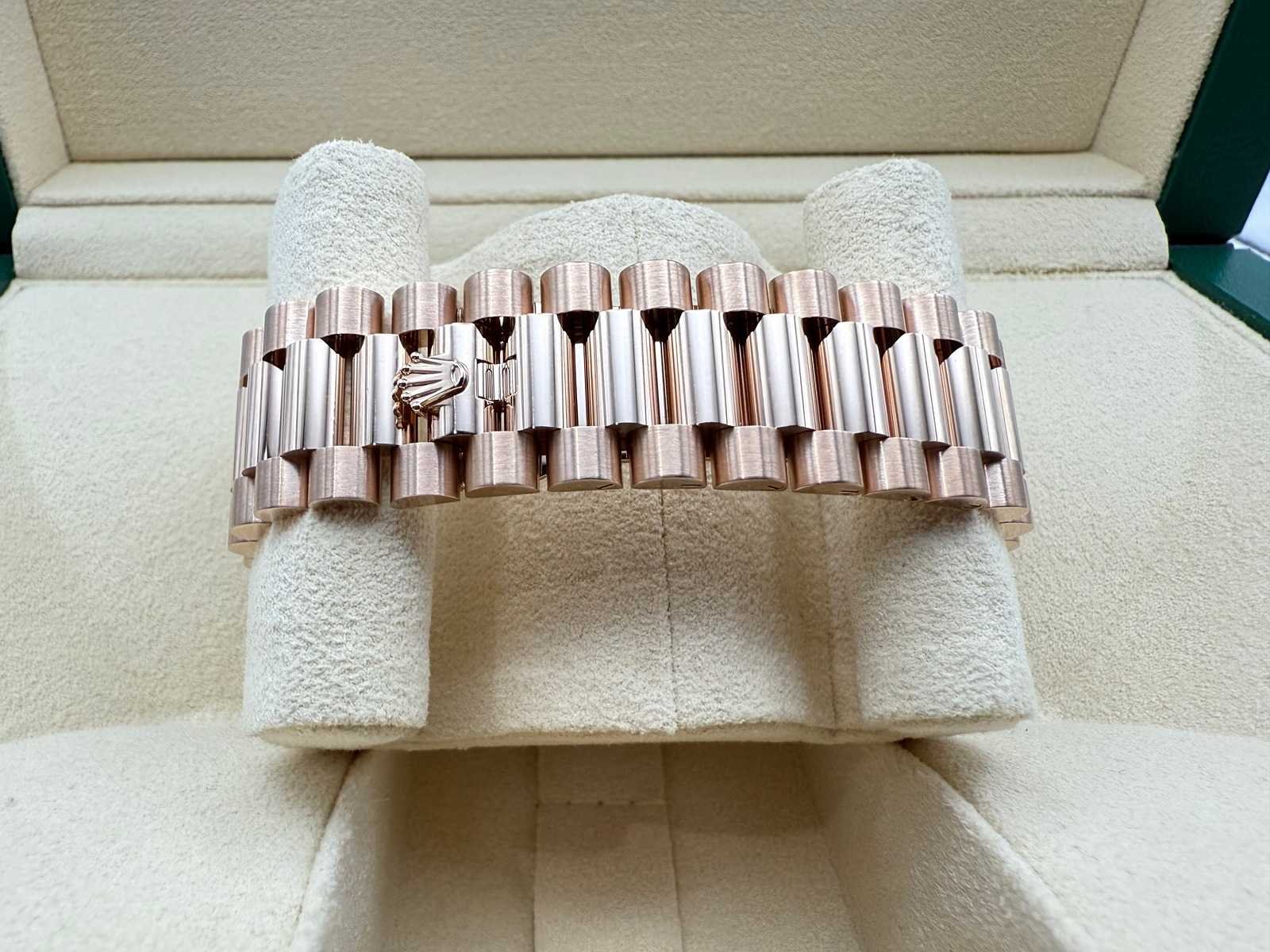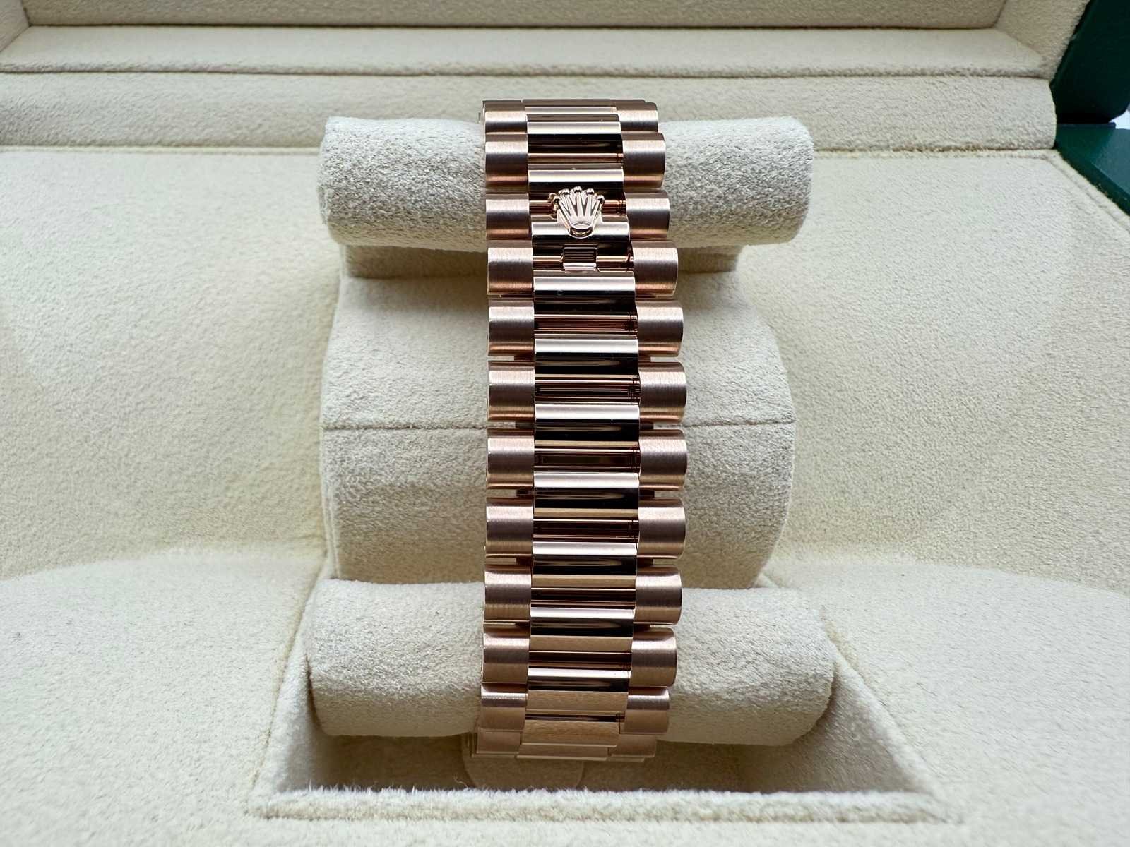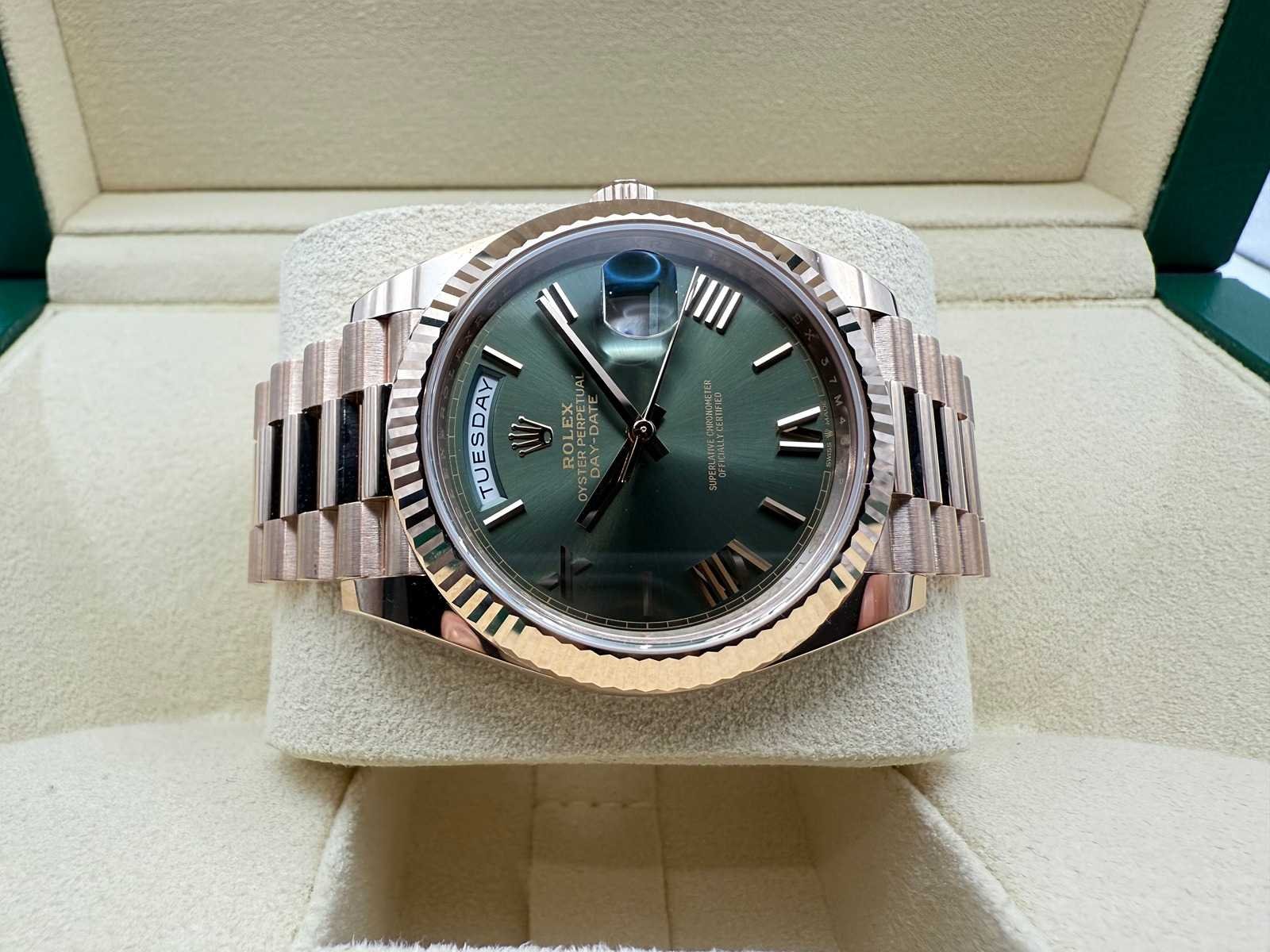 Key Features: Model: Rolex Day-Date 40 Reference: 228235 Condition: Brand new, unworn Material: 18k Everose gold Dial: Olive green sunray finish Bracelet: President (Everose gold) Functions: Day and date display Warranty: 5-year international Rolex warranty Full set: Includes Rolex box, warranty card, booklets, cardholder, and tag Merk: Rolex Model: Day-Date Bouwjaar: 2025 Referentienummer: 228235 Materiaal kast: Rose Gold Materiaal horlogeband: Rose Gold Materiaal sluiting: Rose Gold Wijzerplaat: Olive Kastmaat: 40 mm