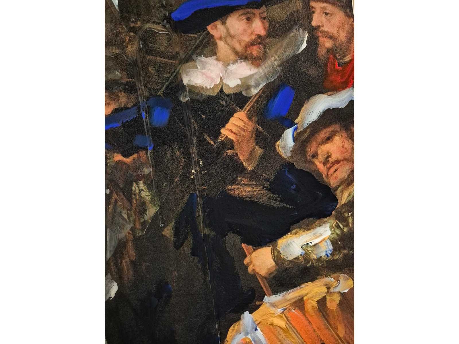 Echtheidscertificaat Stima. Titel van werk: Nachtwacht Techniek: Mixed media/Acryl op paneel Hoogte: 100cm Breedte: 122cm
