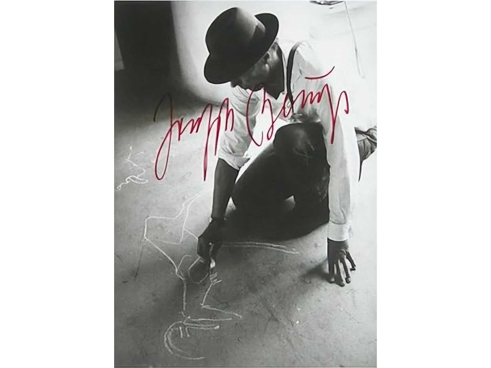 Joseph Beuys: de werken zijn meestal onconventioneel van aard: ze zorgen vaak voor een sterke mening bij de beschouwer. Het avant-gardistische werk van Beuys wordt vaak als sterk conceptueel betiteld: voor hem was het effectief overbrengen van zijn ideeën belangrijker dan de persoonlijke manuele uitwerking van zijn kunstwerken. De uitwerking kon bijvoorbeeld ook gebeuren door technici en handwerkslieden. Hij maakte in totaal meer dan 15.000 werken. Als belangrijkste kunstwerk noemde Beuys desgevraagd zijn 'Sociale Sculptuur'. Dit is een radicale kunsttheorie waarbinnen ieder mens kan participeren en verantwoordelijk is voor de kwaliteit van de samenleving waarin hij leeft. In samenwerking met Klaus Staeck gaf hij grafiek-edities uit zoals lithografieë n, affiches, boeken video's en series kunstpostkaarten, waaronder kaarten van hout en van vilt. In musea maakte hij installaties en stalde persoonlijke objecten uit in vitrines. Sommige van zijn beelden werden uitgevoerd in brons. Voorbeelden van bekende werken van Joseph Beuys zijn: Hoe je aan een dode haas schilderijen uitlegt (1965), een actie met een dode haas in galerie Schmela in Düsseldorf; 'Viltpak' (1970), een pak bestaande uit een broek en een jasje gemaakt van vilt; 'Ik hou van Amerika en Amerika houdt van mij' (1974), een performance waarbij hij zichzelf vijf dagen lang met een coyote in een kooi liet opsluiten in een galerie in New York; en de sculpturen die 'vethoek' (Fettecke) genoemd werden: vetmassa's die in de hoek van een kamer, op een stoel of in een kartonnen doos waren aangebracht. Een zeer belangrijk werk in het oeuvre van Beuys is de installatie "Voglie vedere i miei montagne" in de collectie van het Van Abbemuseum. De titel verwijst naar de woorden die de 19e eeuwse schilder Giovanni Segantini spreekt op zijn sterfbed: 'Voglio vedere le mie montagne' ("Ik wil mijn bergen zien"). Titel van werk: Fussbodenzeihnung 1982 Techniek: Art print Hoogte: 40cm Breedte: 30cm