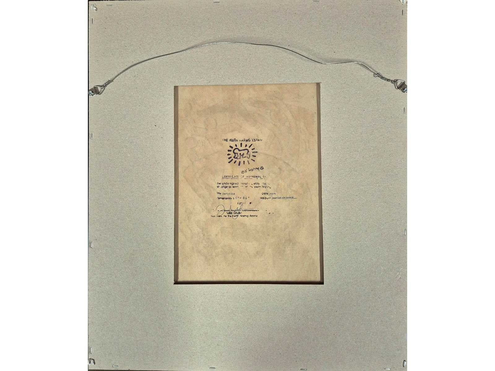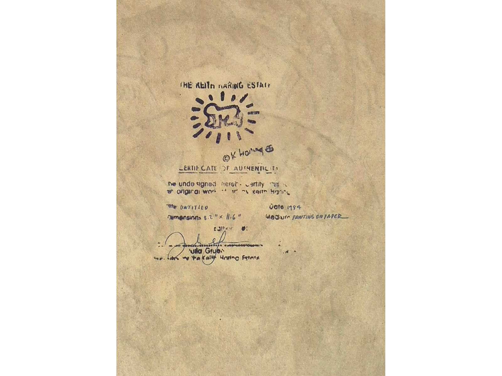 Gesigneerd op het kunstwerk, Certificatie Keith Haring Estate, Julia Gruer, Inclusief lijst. Titel van werk: zt Techniek: Gouache Hoogte: 50cm Breedte: 45cm