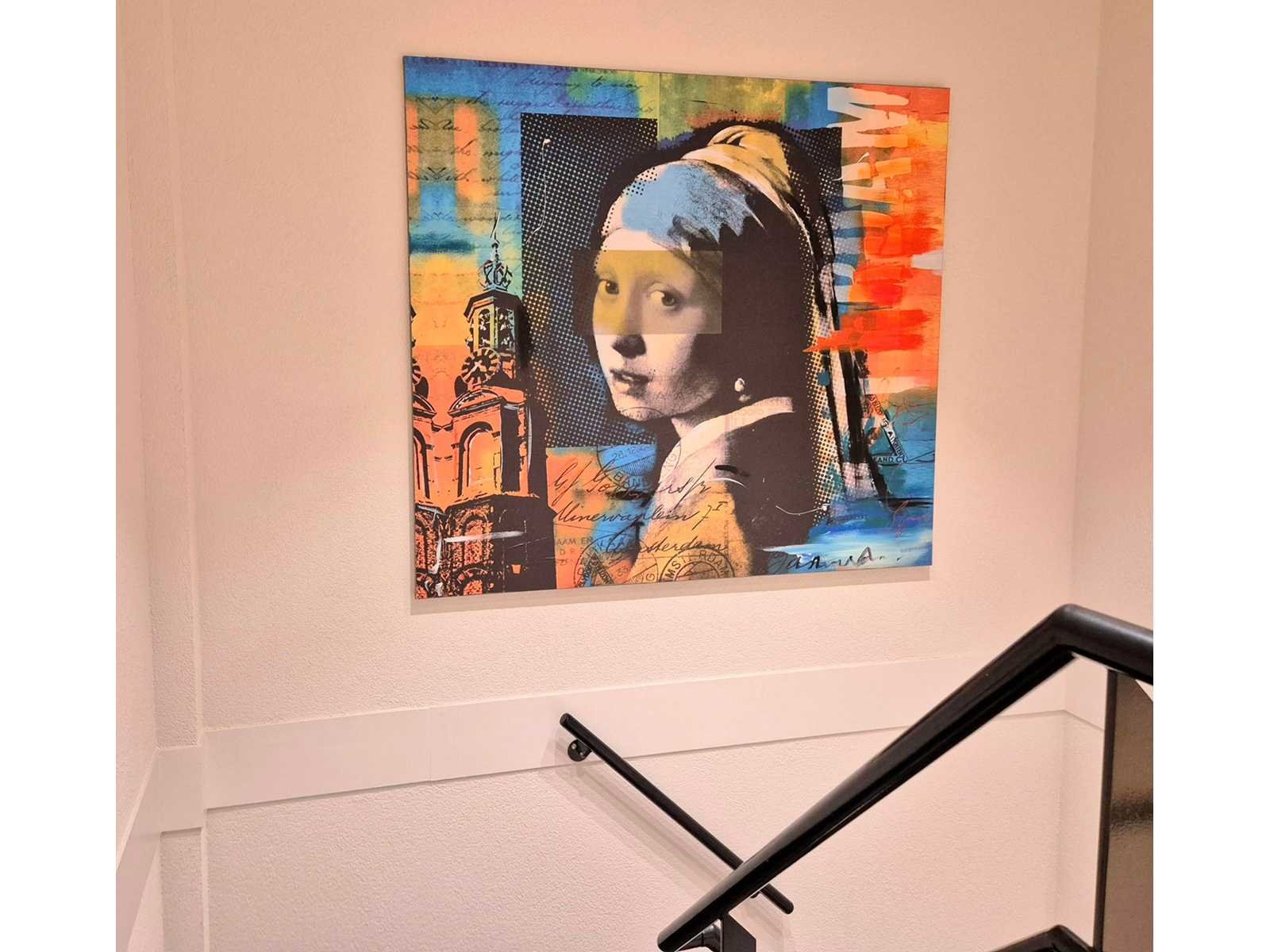 Mischa: heeft meerdere periodes doorgebracht in diverse werelddelen; vandaar dat zijn werk in galeries op de gehele aardbol te vinden zijn. Hij schildert en fotografeert in een ware PopArt stijl, waarbij zijn iconische figuren, Comics, maar ook steden en landschappen een rol spelen. De techniek bestaat meestal uit met relief voorbewerkte doeken, prints, plaksels en tenslotte acrylverf. Een energieke Vibe, volop kleur en power; dat is de uitstraling van de kunstwerken van Mischa. Titel van werk: Meisje met de parel Techniek: Mixed media/acryl op doek Hoogte: 170cm Breedte: 180cm
