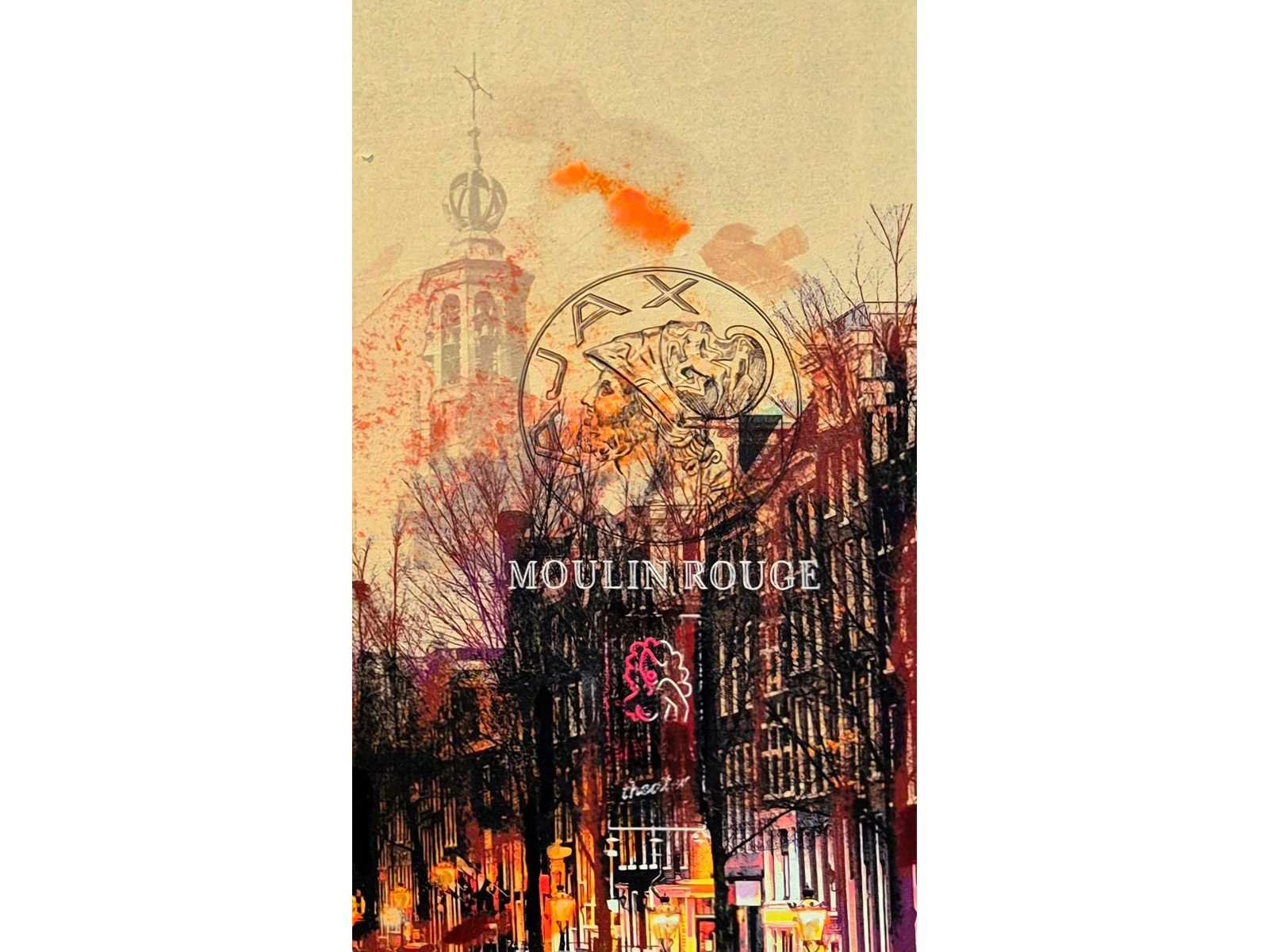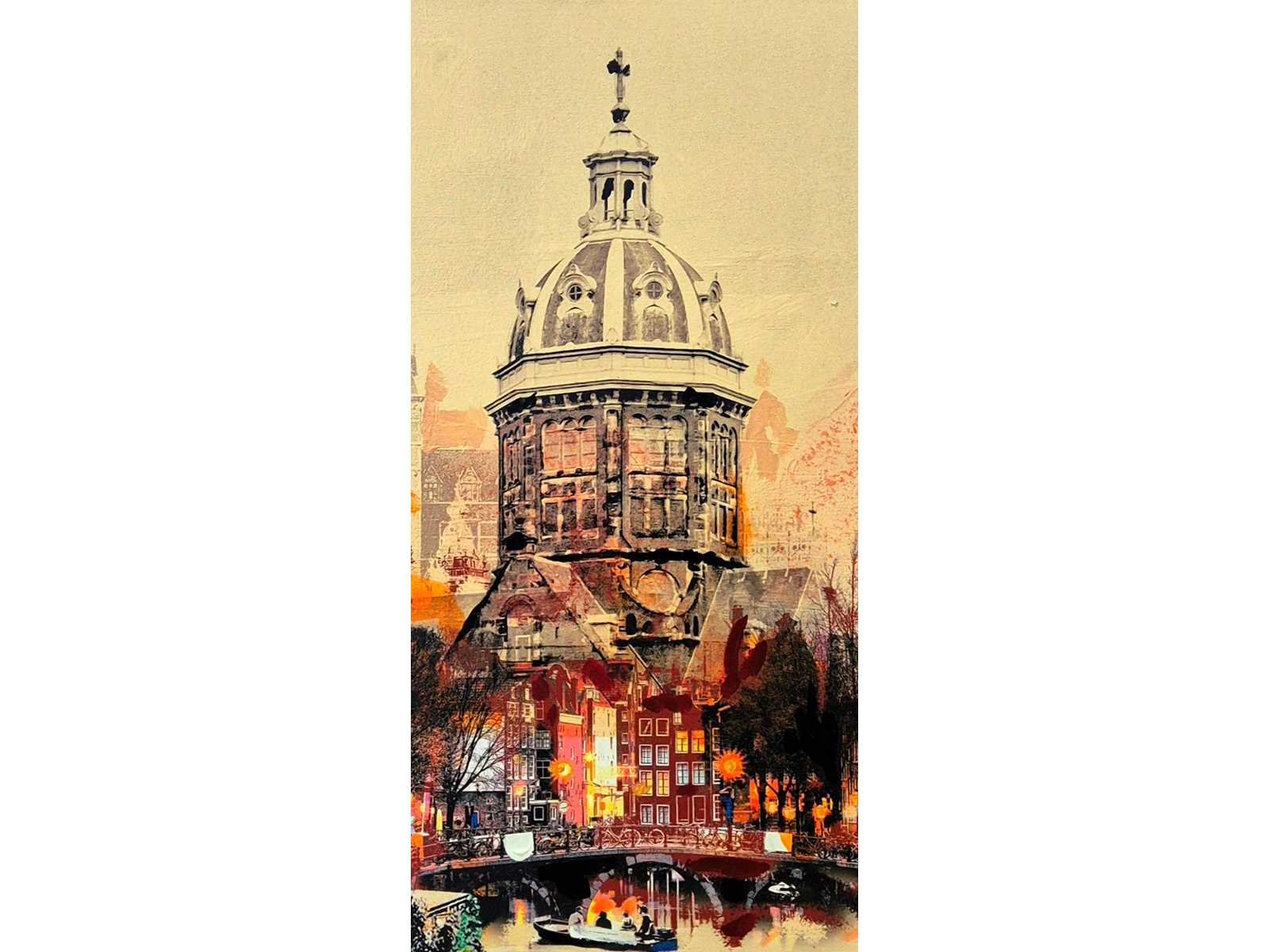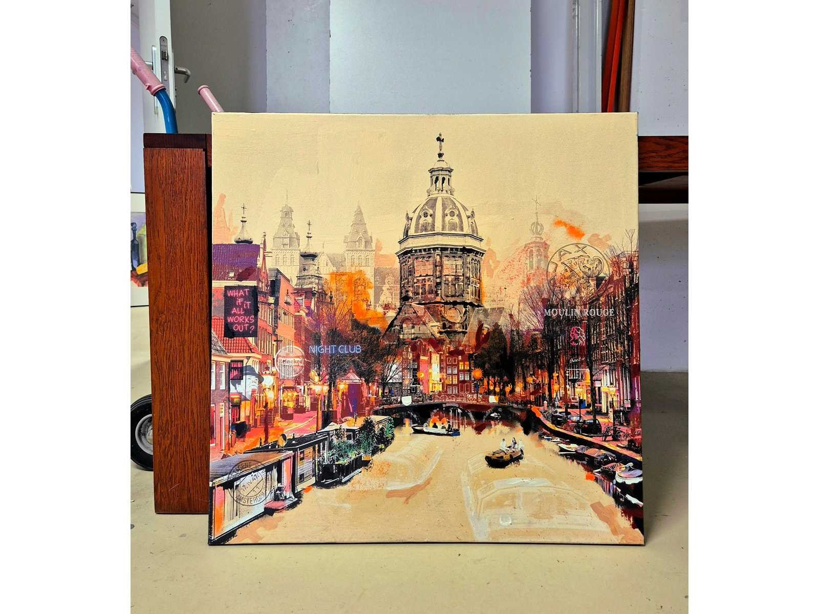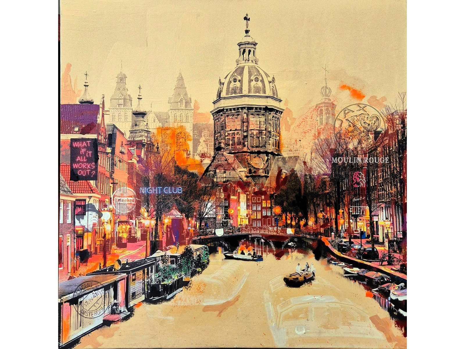 Mischa: heeft meerdere periodes doorgebracht in diverse werelddelen; vandaar dat zijn werk in galeries op de gehele aardbol te vinden zijn. Hij schildert en fotografeert in een ware PopArt stijl, waarbij zijn iconische figuren, Comics, maar ook steden en landschappen een rol spelen. De techniek bestaat meestal uit met relief voorbewerkte doeken, prints, plaksels en tenslotte acrylverf. Een energieke Vibe, volop kleur en power; dat is de uitstraling van de kunstwerken van Mischa. Titel van werk: Amsterdam Techniek: Mixed media/acryl op doek Oplage: 20 Hoogte: 80cm Breedte: 80cm