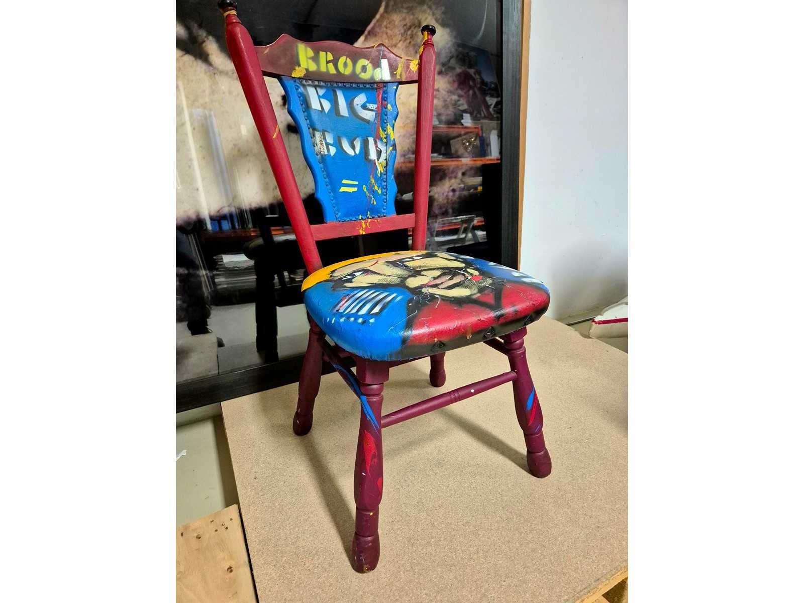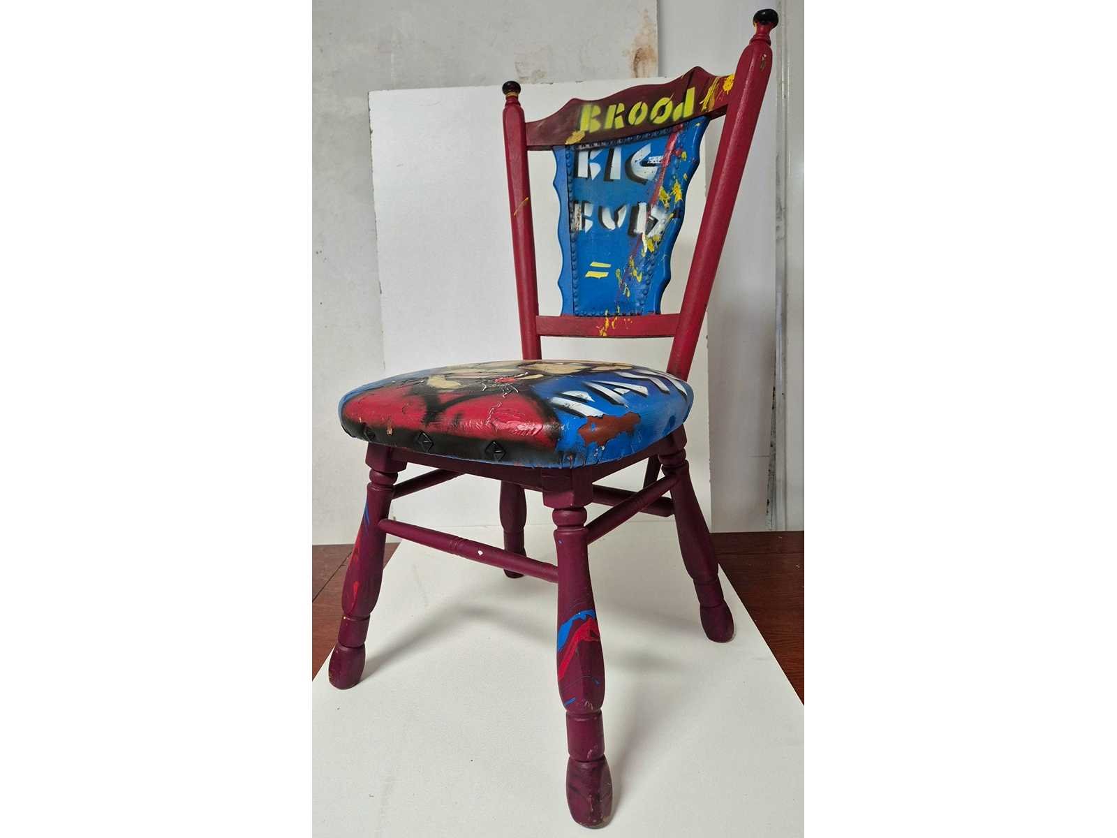 Hermanus (Herman) Brood (Zwolle, 5 november 1946 – Amsterdam, 11 juli 2001) was een Nederlandse zanger, kunstschilder, pianist, acteur en auteur. Brood onderscheidde zich door zijn kenmerkende zangstem en muzikale diversiteit. Een anekdote over zijn jongensjaren luidt dat Broods huisarts in 1953 gesteld zou hebben dat Brood met zijn kleurenblindheid alles zou kunnen worden, behalve kunstschilder. Na Broods overlijden was in 2002 in het Cobra Museum in Amstelveen een eerste overzichtstentoonstelling van zijn werk te zien, met daarnaast foto's, gemaakt door zijn vriend, de fotograaf Anton Corbijn. Eerder was het werk van Brood museaal nooit erkend, hoewel zijn werk al veel eerder te zien was voor publiek, zoals tussen 8 en 22 november 1984 in Groningen.[8] Er waren echter wel veel liefhebbers en zijn schilderwerk werd goed verkocht. Titel van werk: Stoel Hoogte: 94cm Breedte: 45cm