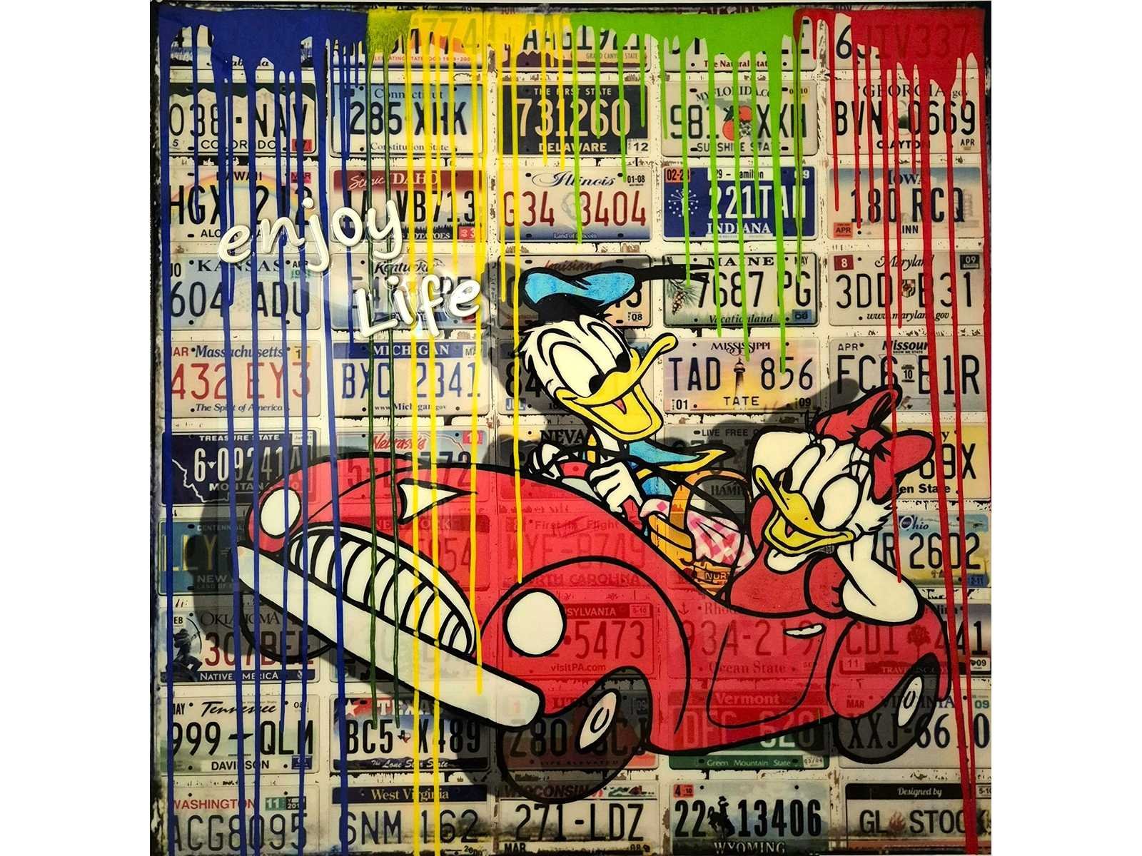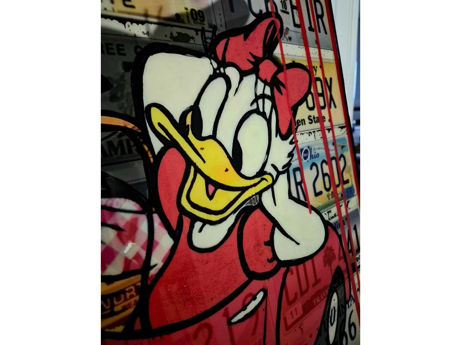 Micha: Micha is geboren in 1974 en komt uit een echt kunstenaars gezin, zijn vader is ook een gedreven kunstenaar. Hij heeft het niet van een vreemde. Over een periode van enige jaren heeft hij bij verschillende kunstenaars lessen in technieken gevolgd en begon hij een opleiding in illustratieve vormgeving. Hierin vond hij de inspiratiebronnen voor zijn huidige kunstwerken(mix-media)en maakt hij gebruik van de moderne mogelijkheden om zijn werken te creëren. Micha schildert vooral pop-art en figuratief, waarbij zijn helden zoals comic figuren, popsterren, vrouwen en vaak bekende personages tot zijn vocabularium horen. Kunst met een knipoog naar de huidige tijd waar iedereen druk is en soms de realiteit uit het oog verliest. De technieken en materialen die hij in zijn werken gebruikt zijn heel divers, in zijn Unique Editions en mix-media originelen. Inmiddels vinden zijn kunstwerken hun weg via gerenommeerde galeries in diverse landen. Techniek: Acryl/epoxy op paneel Hoogte: 100cm Breedte: 100cm