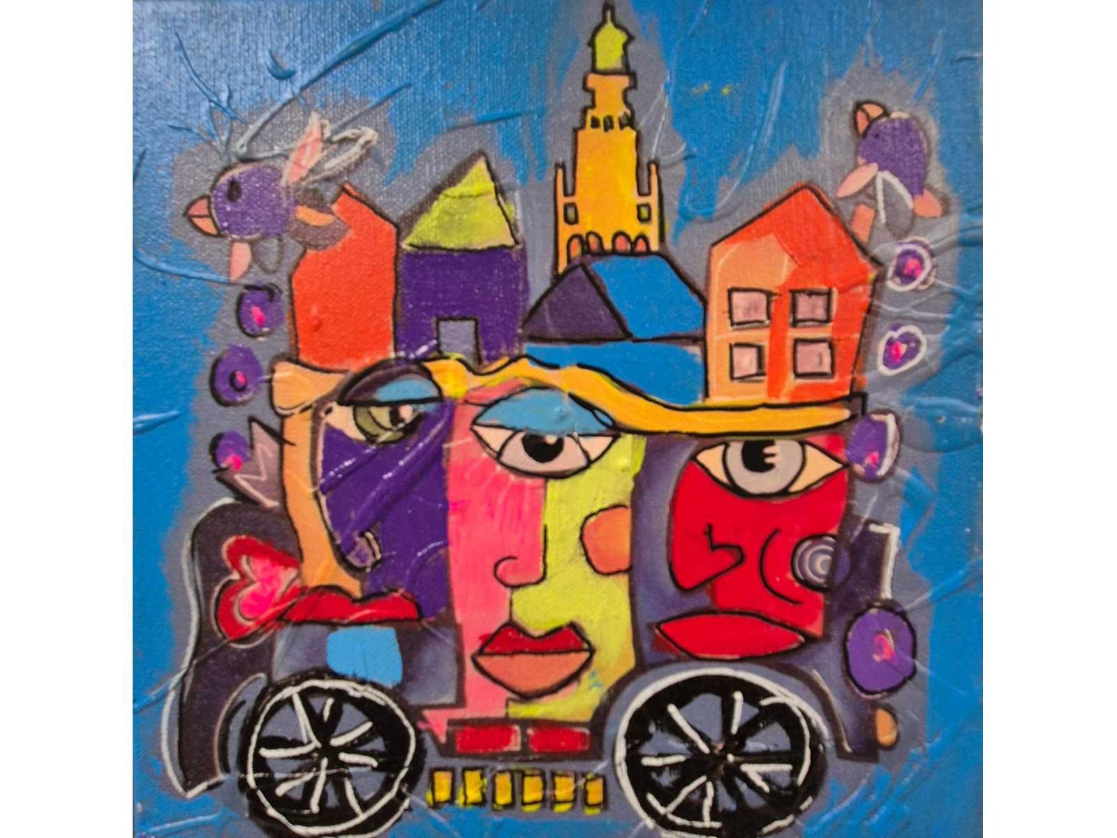 Simon Berend: De werken zijn veelgevraagd in binnen- en buitenland. Opgenomen in gerenommeerde kunstcollecties van zowel particulieren als het bedrijfsleven. Met de stijl ‘Post-Cobra’ en een knipoog naar Picasso en Gauguin weten zij de kijker te verrassen en vermaken. Er schuilt altijd een verhaal, de kunstwerken zijn verhalen uit een samenleving van toen en nu , het individu, de familie, de stad,het volk; de verhalen spelen zich af vanaf de oude Inca’s tot in het heden. Muziek, cultuur, erotiek-en kunst uit Mexico, Bali, London, de Noordpool, als het maar tegenovergesteld is aan het alledaagse. De fantasie wordt geprikkeld, zintuigen getest; het is een kunststijl die door de tijd heen werkt en blijft. Techniek: Mixed media/acryl op doek Hoogte: 20cm Breedte: 20cm