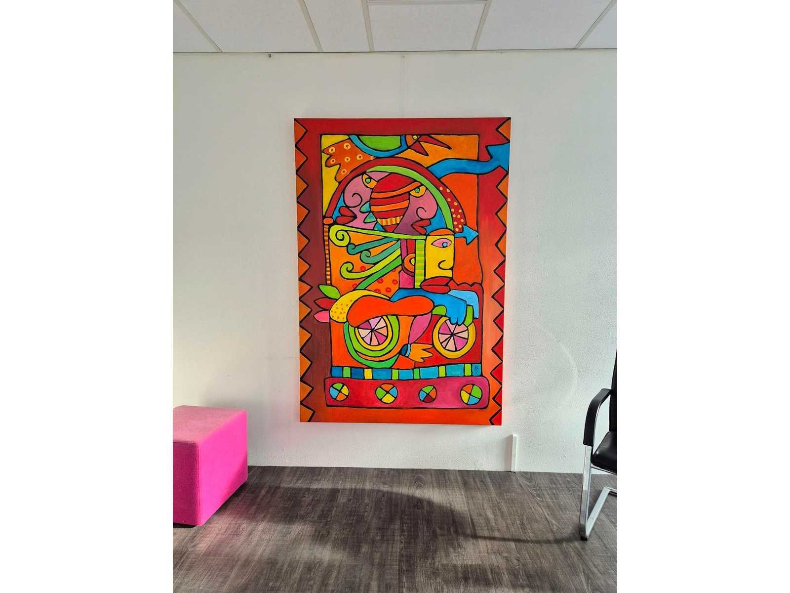 SimonBruno: De werken zijn veelgevraagd in binnen- en buitenland. Opgenomen in gerenommeerde kunstcollecties van zowel particulieren als het bedrijfsleven. Met de stijl ‘Post-Cobra’ en een knipoog naar Picasso en Gauguin weten zij de kijker te verrassen en vermaken. Er schuilt altijd een verhaal, de kunstwerken zijn verhalen uit een samenleving van toen en nu , het individu, de familie, de stad,het volk; de verhalen spelen zich af vanaf de oude Inca’s tot in het heden. Muziek, cultuur, erotiek-en kunst uit Mexico, Bali, London, de Noordpool, als het maar tegenovergesteld is aan het alledaagse. De fantasie wordt geprikkeld, zintuigen getest; het is een kunststijl die door de tijd heen werkt en blijft. Titel van werk: Continue de router Techniek: Acryl op doek Hoogte: 190cm Breedte: 130cm