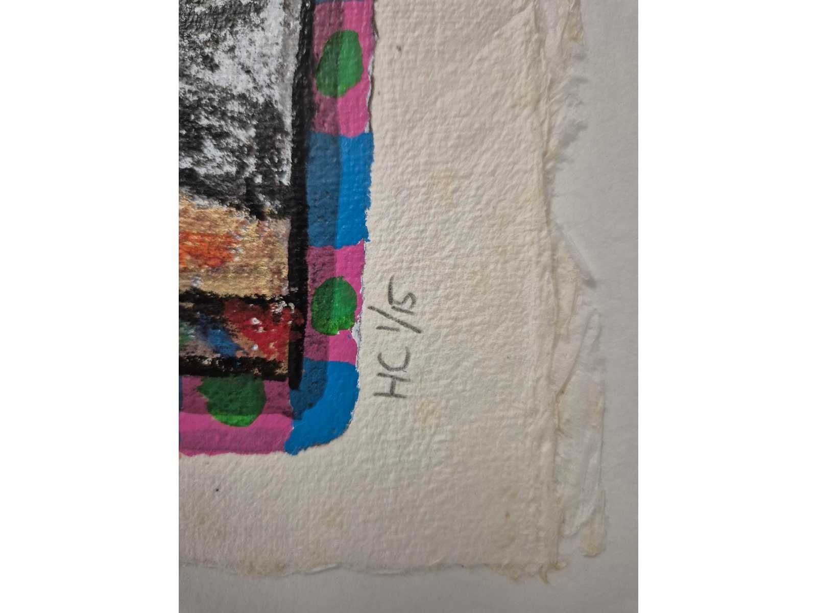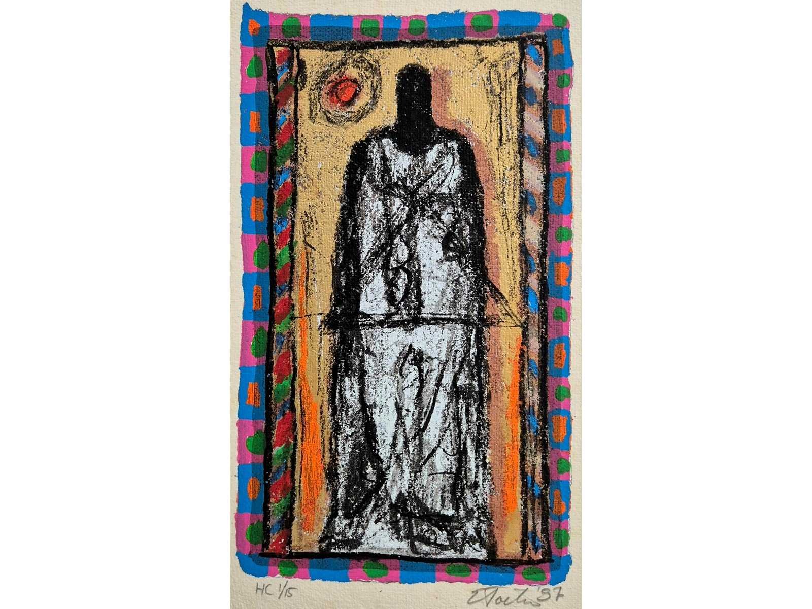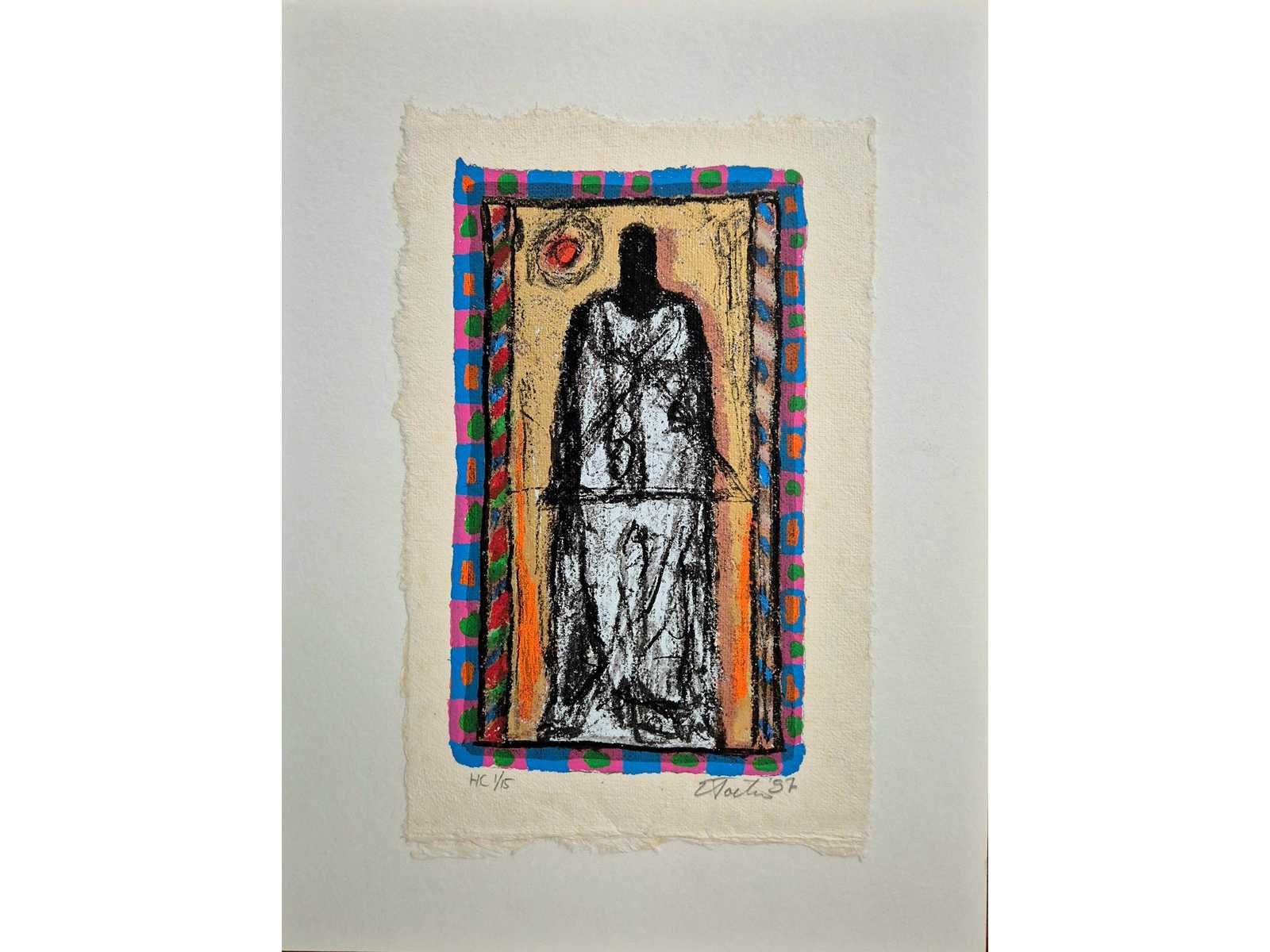 Eric Toebosch: het huidige werk van Eric Toebosch verbeeldt de mens, in de gedaante van een engel. Hij wordt frontaal en stram weergegeven. De composities doen wat vorm en kleurstelling betreft denken aan iconen, Byzantijnse sacrale kunst. Dit wordt nog versterkt door het veelvuldig gebruik van goudverf. Maar daarbinnen speelt zich meer af dan de streng religieuze verwijzing. Toebosch’s werk wordt tevens getypeerd door zijn sterke relativerings-vermogen en de vaak humoristische details. Techniek: Zeefdruk Oplage: hc 1/15 Hoogte: 40cm Breedte: 30cm