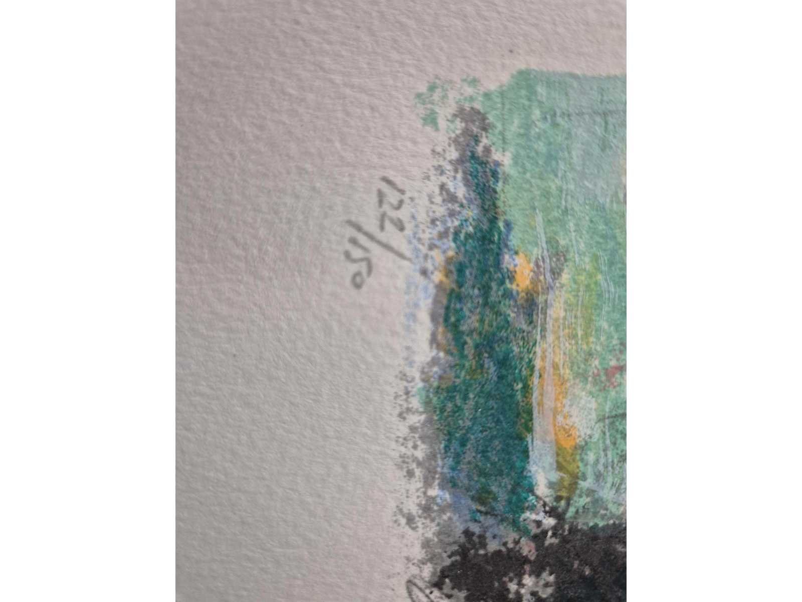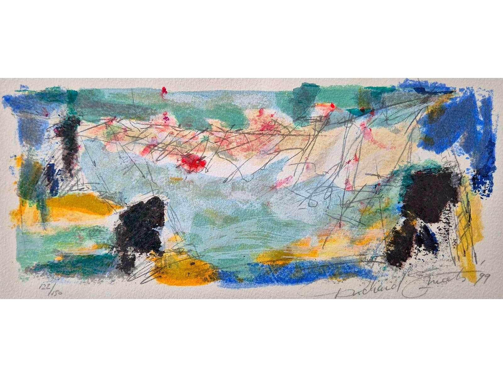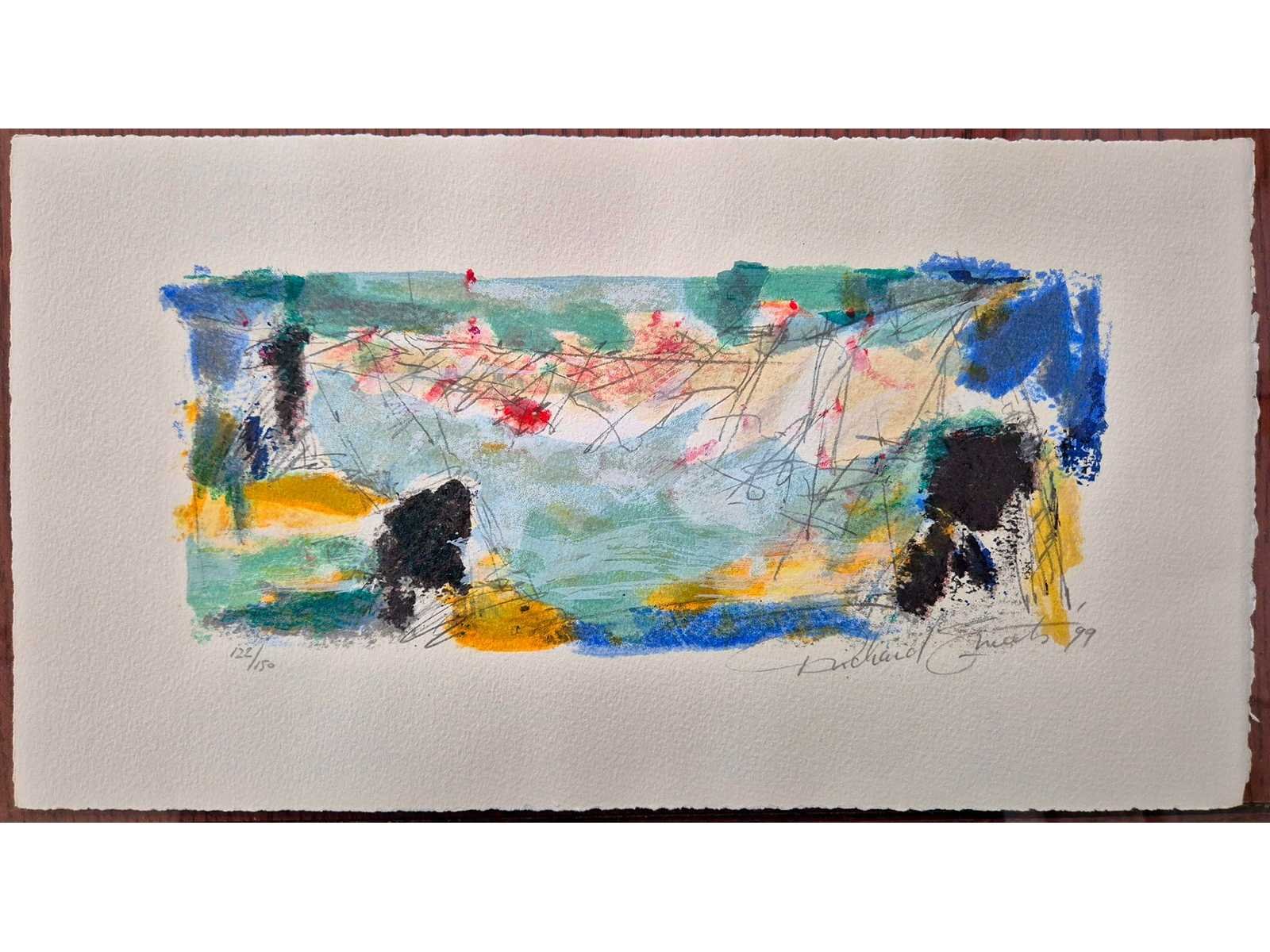 Richard Smeets: Richard Smeets (Gennep, 1955) is een Nederlandse beeldhouwer en kunstschilder werkzaam in Heijen. Leven en werk Richard Smeets heeft zijn opleiding gevolgd aan de Stadsacademie Beeldende Kunsten in Maastricht. Sinds medio jaren ’80 is zijn werk te omschrijven als lyrisch-abstract. Naar eigen zeggen komt zijn werk tot stand in drie fasen. De basis vormt een ervaring, een herinnering, die de schilder vervolgens materialiseert in verf en kleur. Richard Smeets maakt tevens beelden van brons, corten-staal en polyester die nauw verwant zijn aan zijn schilderkunst. Een goed voorbeeld hiervan zijn de grote bronzen met de titel ‘’Tafelgesprekken’’. Samen met schrijfster Marion Bloem maakte Richard Smeets een boek waarin beiden op elkaars werk reageerden. Techniek: Zeefdruk Oplage: 122/150 Hoogte: 21cm Breedte: 39cm