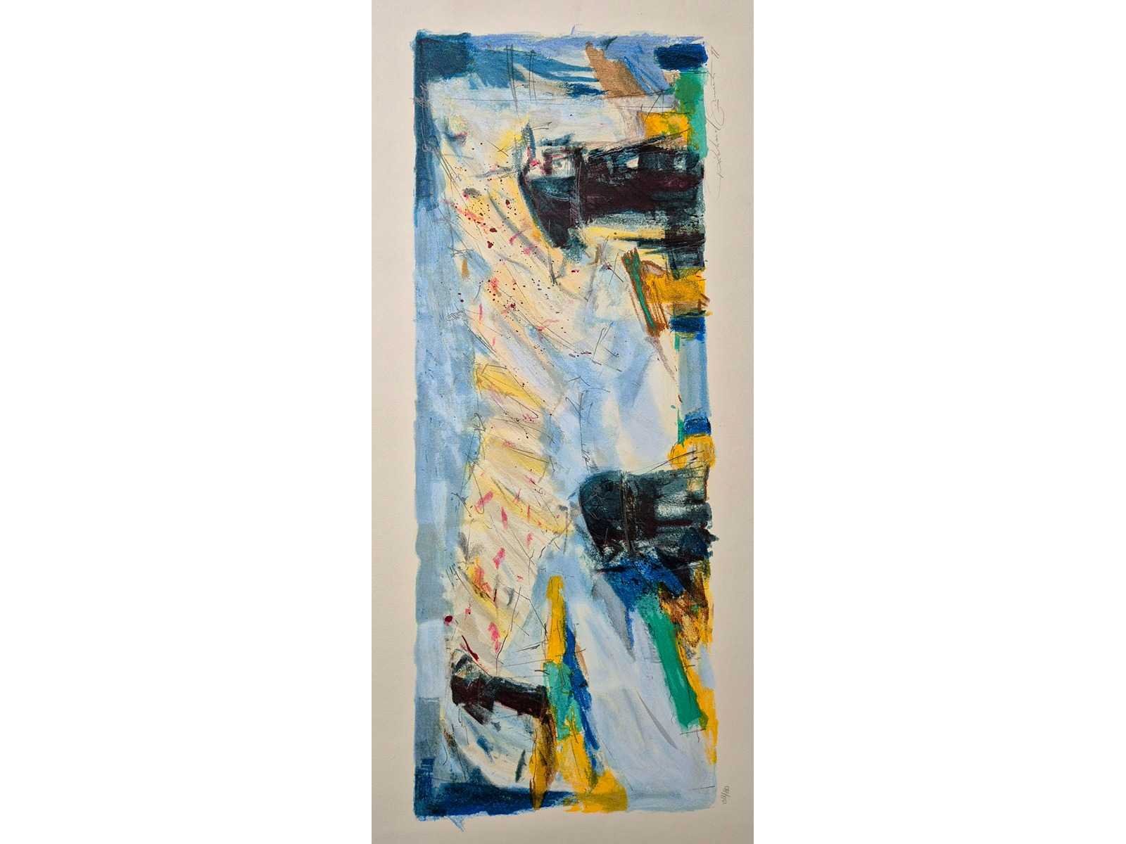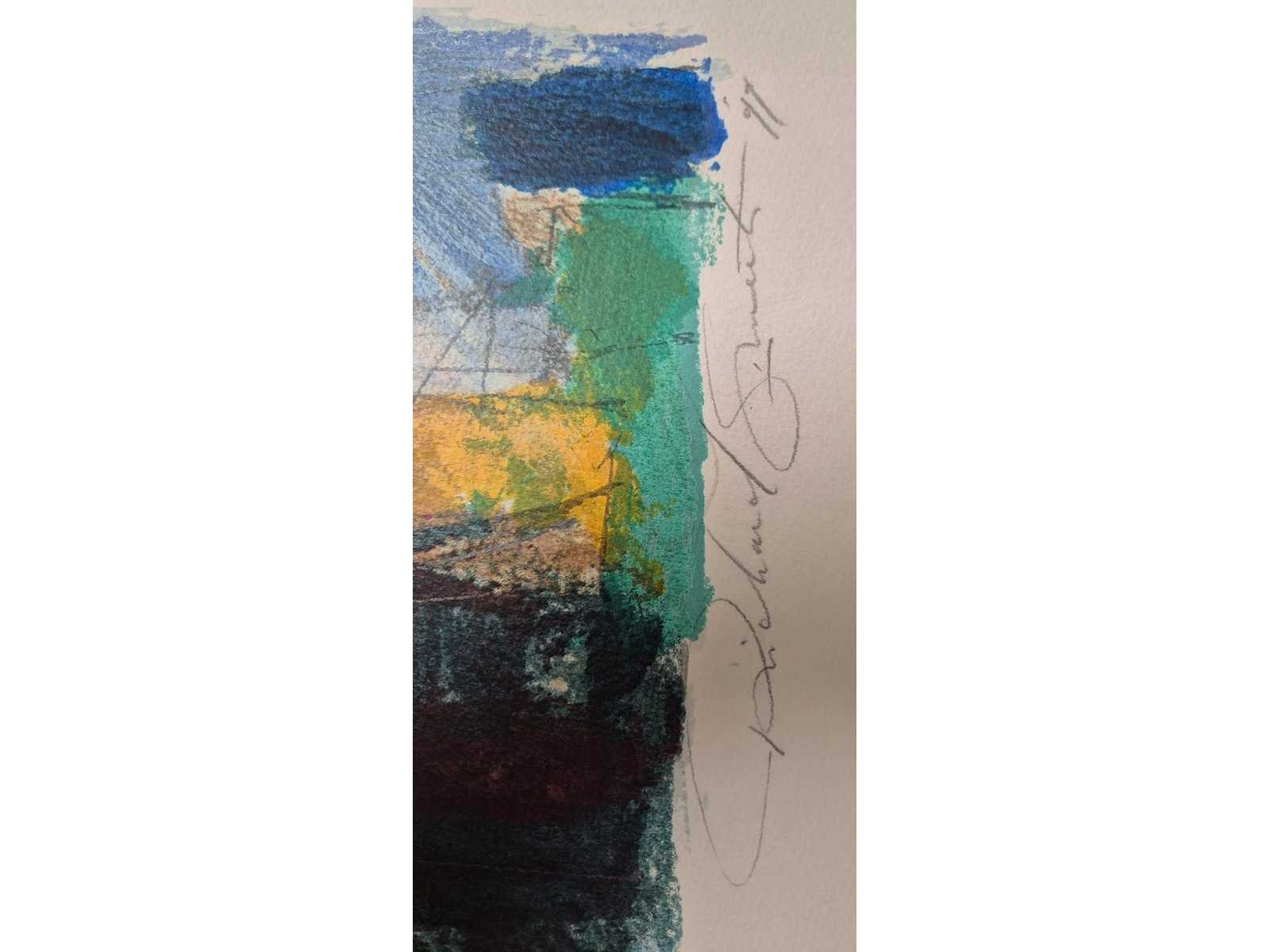 Richard Smeets: Richard Smeets (Gennep, 1955) is een Nederlandse beeldhouwer en kunstschilder werkzaam in Heijen. Leven en werk Richard Smeets heeft zijn opleiding gevolgd aan de Stadsacademie Beeldende Kunsten in Maastricht. Sinds medio jaren ’80 is zijn werk te omschrijven als lyrisch-abstract. Naar eigen zeggen komt zijn werk tot stand in drie fasen. De basis vormt een ervaring, een herinnering, die de schilder vervolgens materialiseert in verf en kleur. Richard Smeets maakt tevens beelden van brons, corten-staal en polyester die nauw verwant zijn aan zijn schilderkunst. Een goed voorbeeld hiervan zijn de grote bronzen met de titel ‘’Tafelgesprekken’’. Samen met schrijfster Marion Bloem maakte Richard Smeets een boek waarin beiden op elkaars werk reageerden. Titel van werk: Denkend aan Holland Techniek: Zeefdruk Oplage: 138/180 Hoogte: 50cm Breedte: 110cm