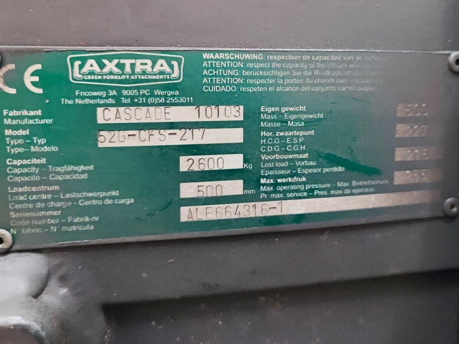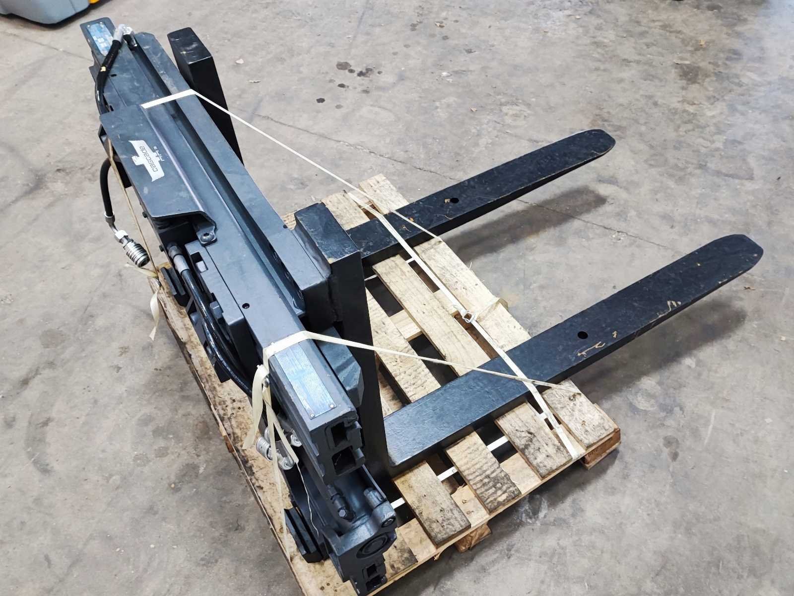Cascade vorkspreider, vorklengte 1200 mm, capaciteit 2600 kg, geschikt voor vorkenbord FEM Merk: Cascade Type: 52G-CFS-217 Bouwjaar: 2008 Serienummer: ALE644316-1 Eigen gewicht: 500kg Totale afmeting Breedte: 1160mm