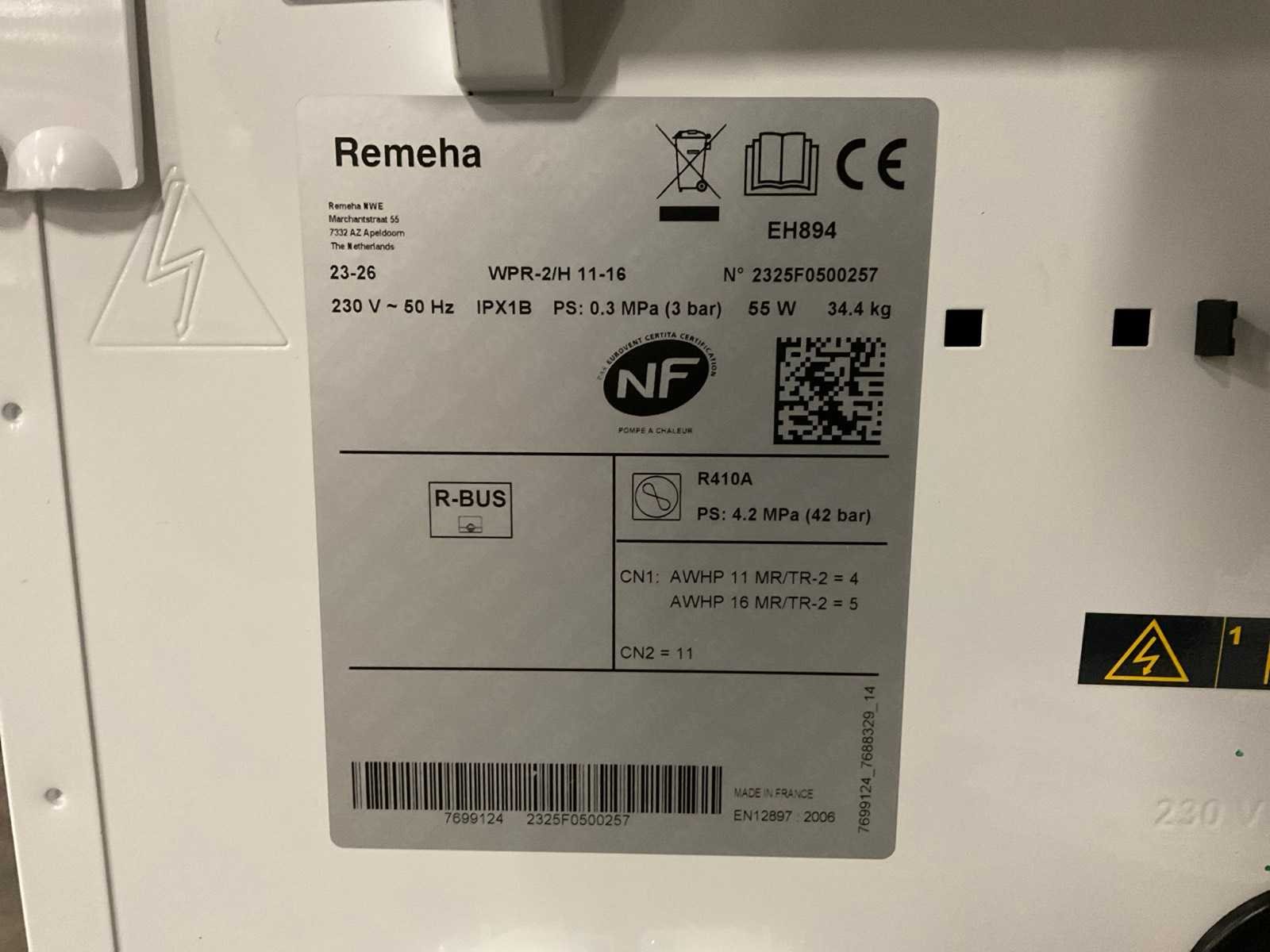 Bestaande uit: (1x) Buitenmodule, Type: AWHP 11 TR-2 (2023), 400V, R410A. (1x) Binnenmodule, Type: WPR-2/H 11-16, Mercuria, R410A. Merk: Remeha Model: Mercuria