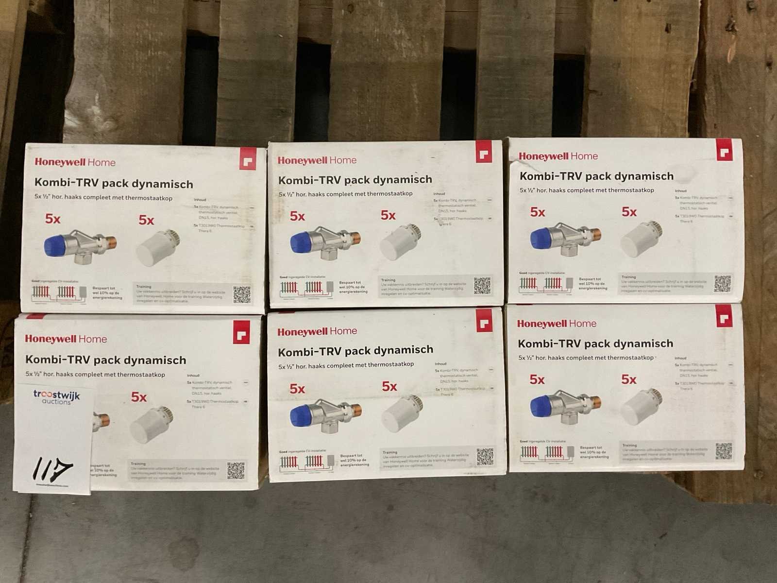 6x doos van 5st; 5x Kombi-TRV drukonafhankelijke thermostatische radiatorafsluiter DN15 haaks Artikel nummer fabrikant: V2100EPI15 Aansluiting thermostaat kraan: M30x1.5 Haakse kraan 5x Thermostaatknop Economy Elegance T3001WO Kleur: Wit Aansluiting: M30x1.5 Merk: Honeywell Home