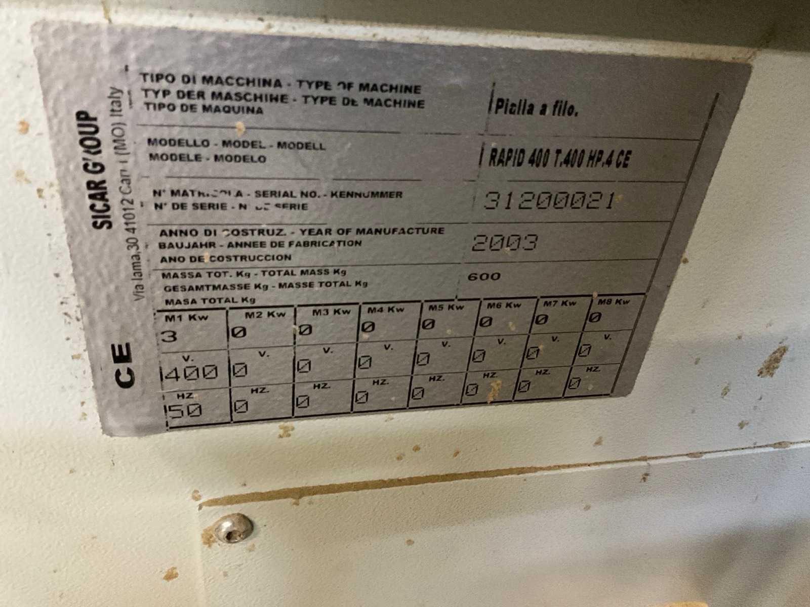 Merk: Sicar Type: Rapid 400 Bouwjaar: 2003 Serienummer: 31200021 Aansluiting: 380V Afmeting l: 2550mm Afmeting b: 1250mm Afmeting h: 1000mm