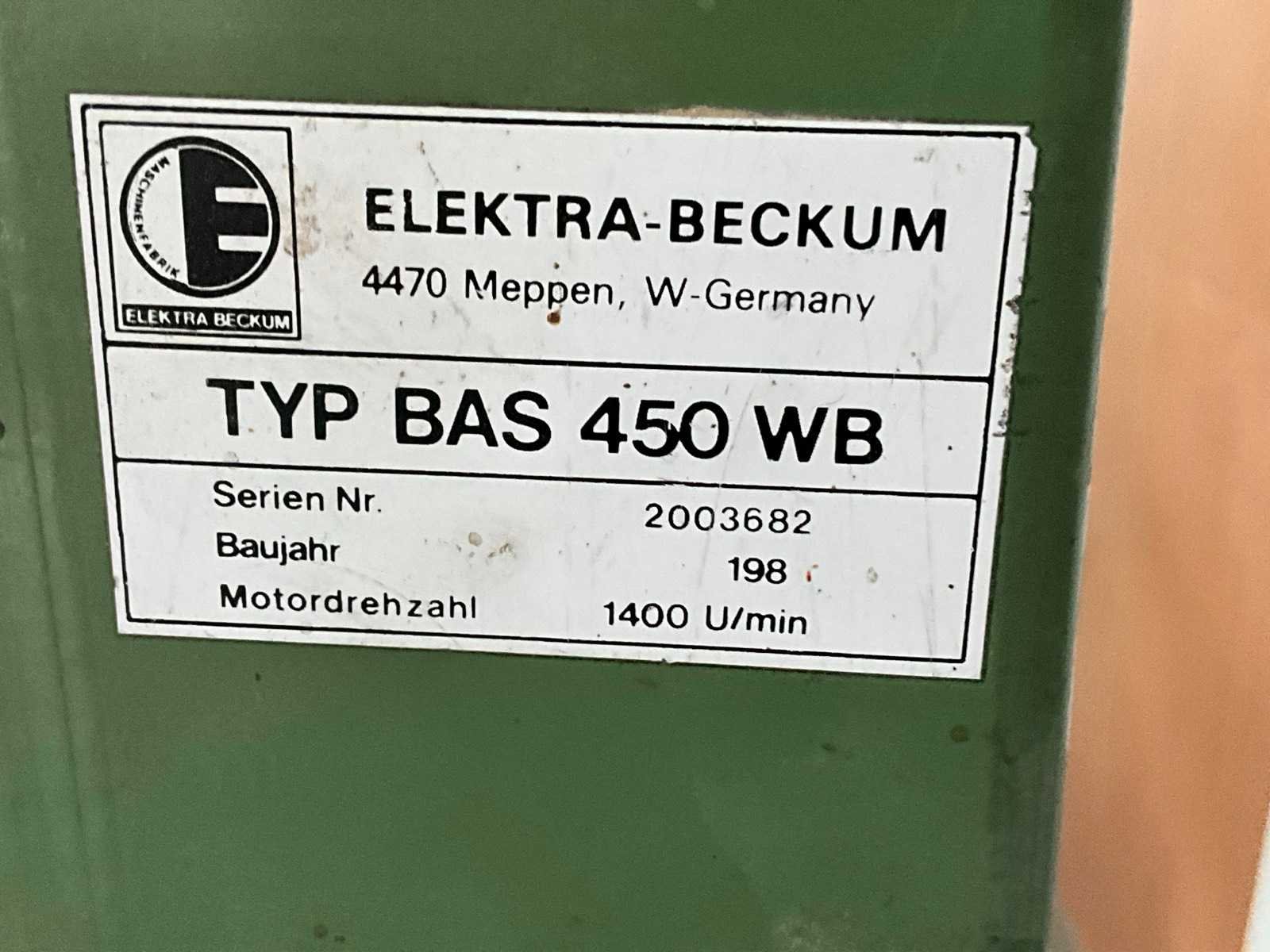 Merk: Elektra Beckum Type: BAS 450 WB Serienummer: 2003682 Tafel afmeting l: 490mm Tafel afmeting b: 545mm Zaagblad afm. l: 3400mm Zaagblad afm. b: 50mm Aansluiting: 230V Afmeting l: 650mm Afmeting b: 800mm Afmeting h: 1970mm